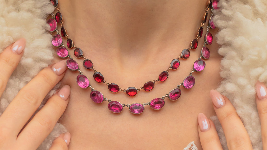 Imagine a setting where every detail exudes opulence and sophistication. This enchanting affair of love and luxury includes a vast French Platinium Diamond ring, a Georgian Paste Riviere with soft romantic blush tones, and the rich elegance of the foiled Garnet Riviere.