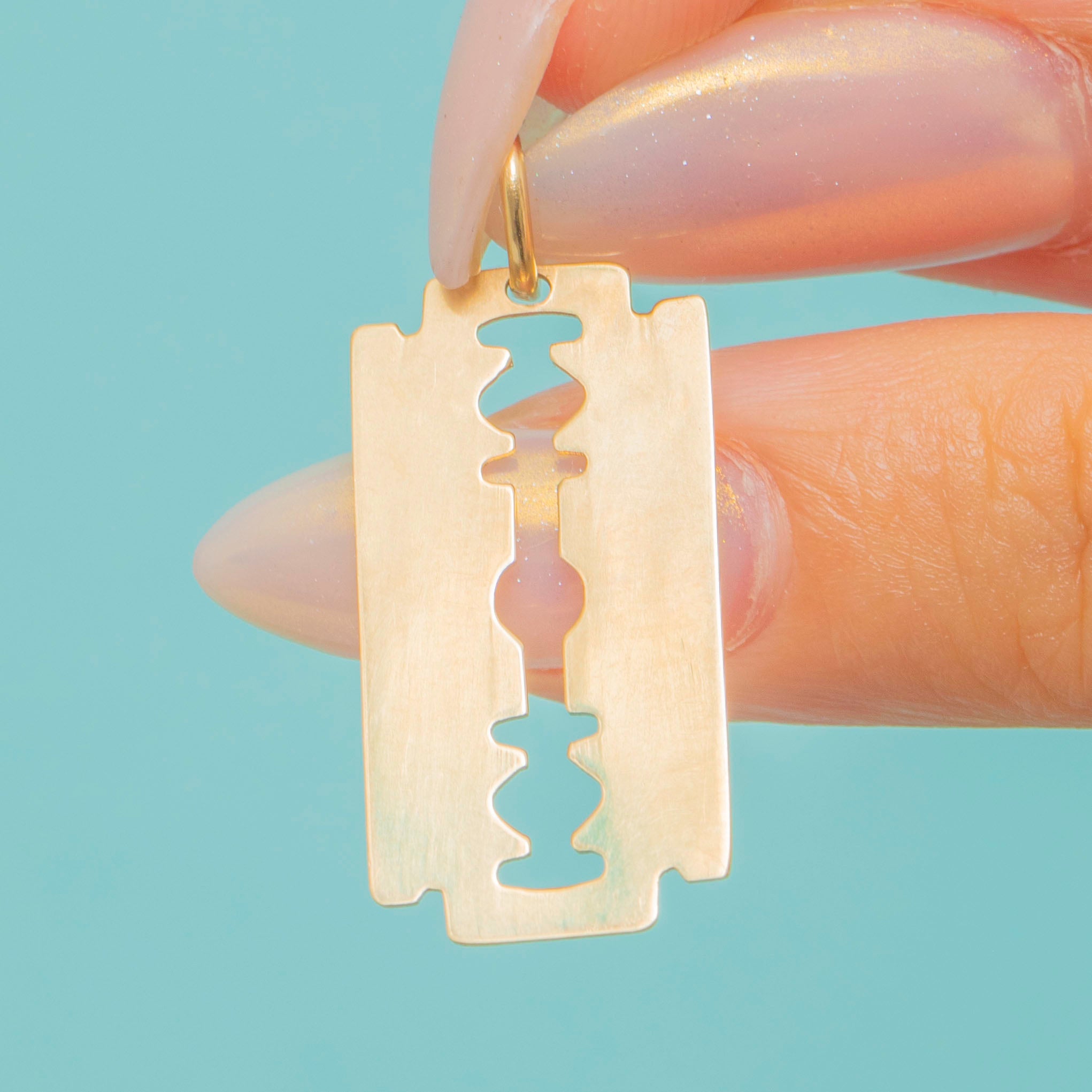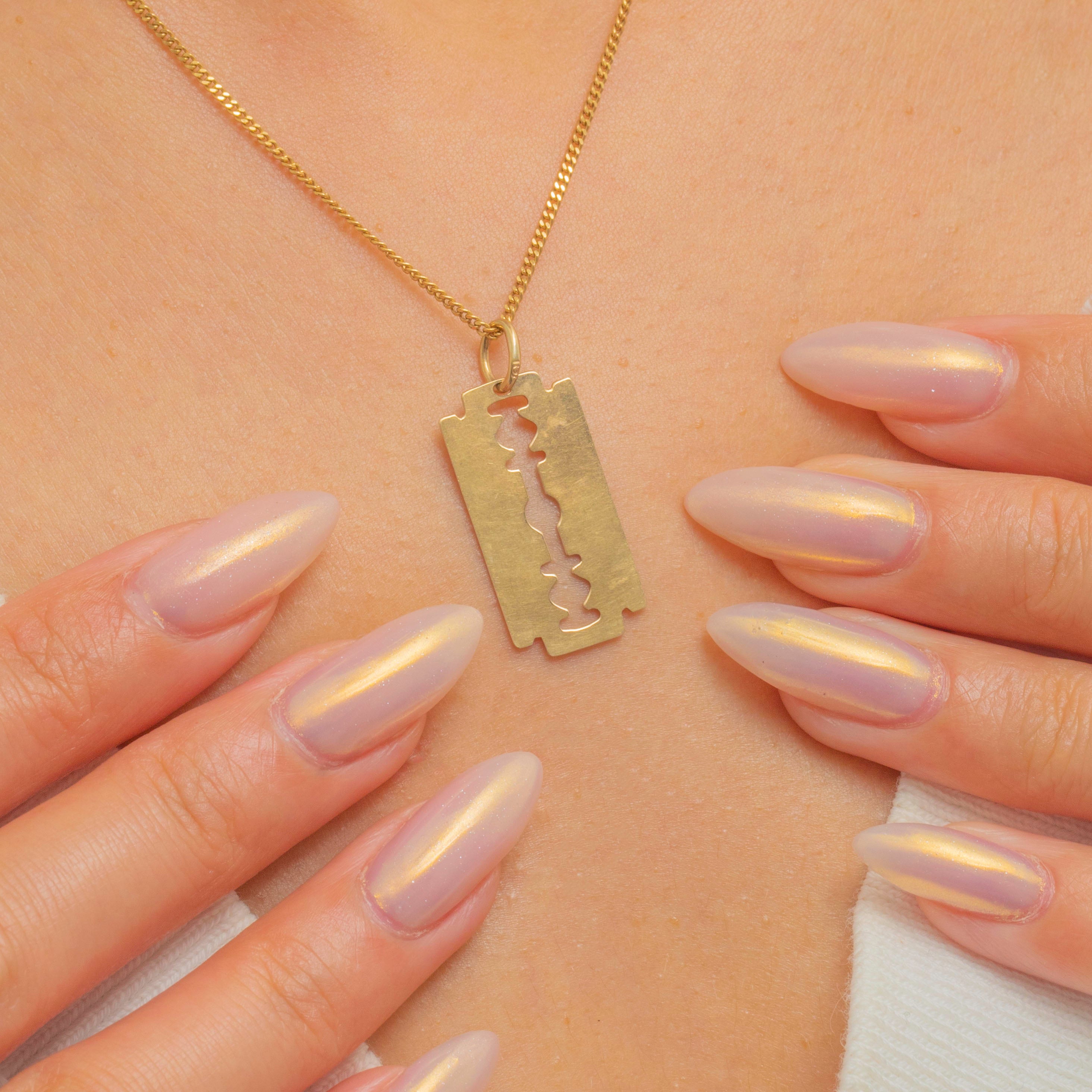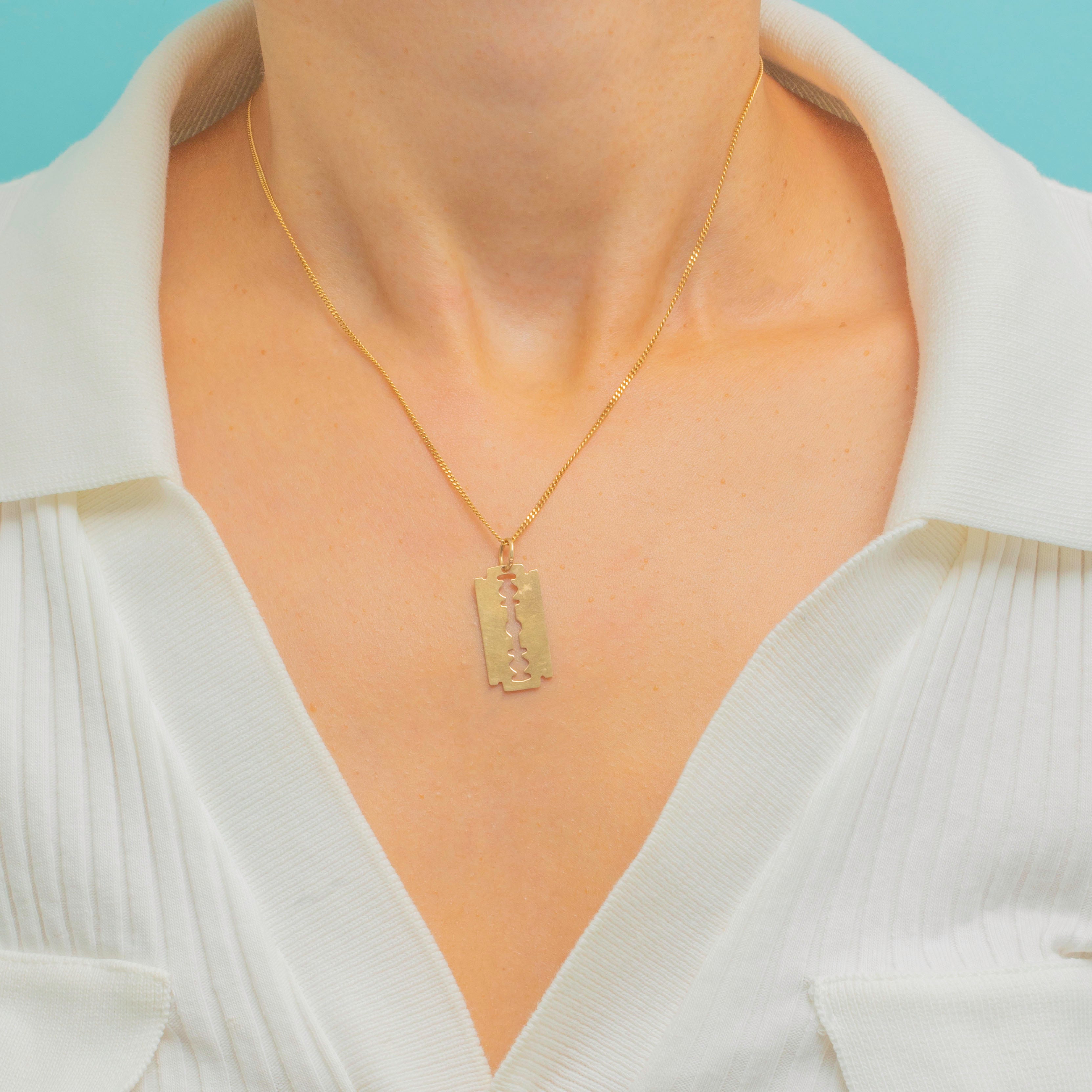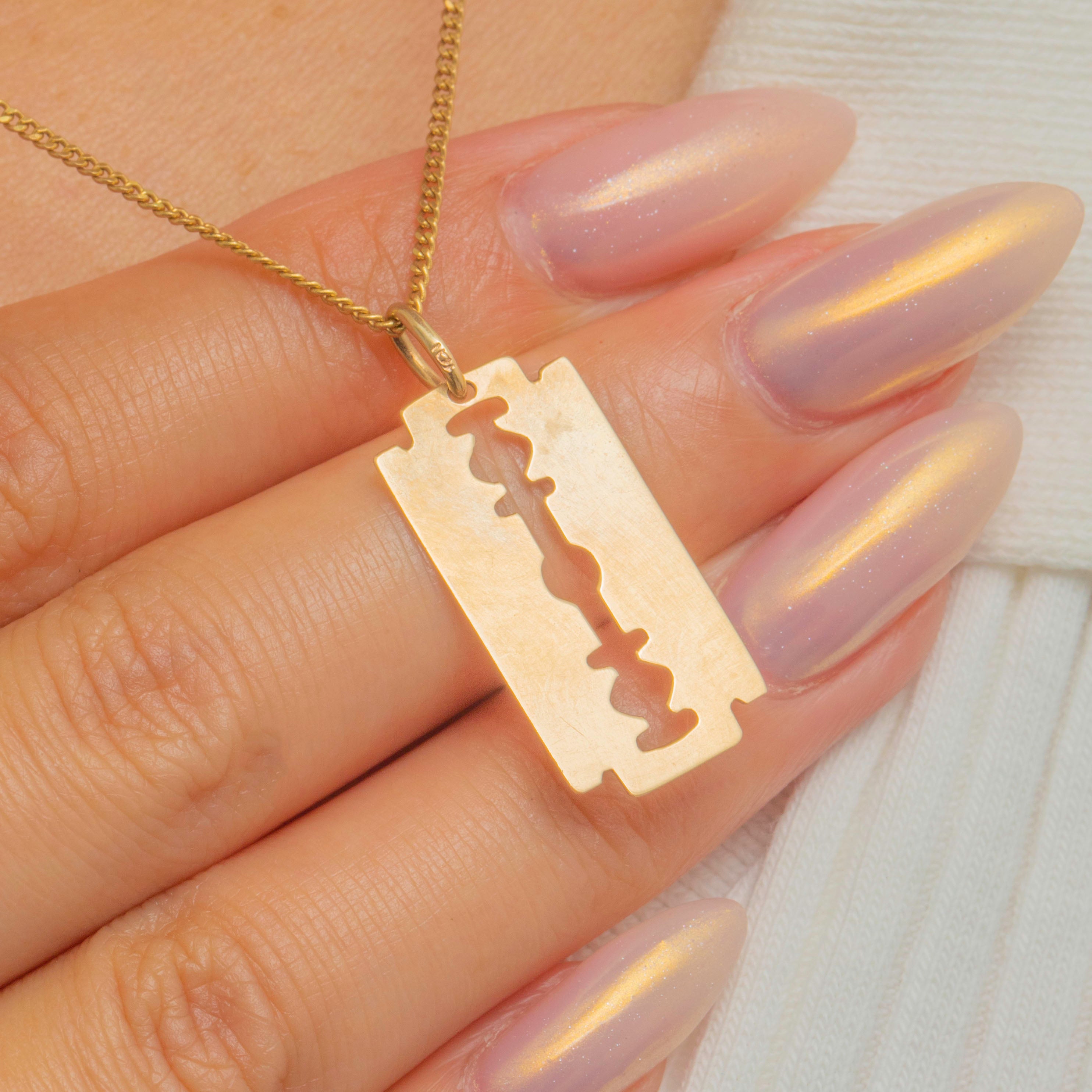 A stylish and unusual 10ct Gold razor blade pendant, a bold design statement with a contemporary edge. Crafted in warm 10ct Gold, this piece has a lightweight feel yet a striking look, perfect for layering or wearing solo.
