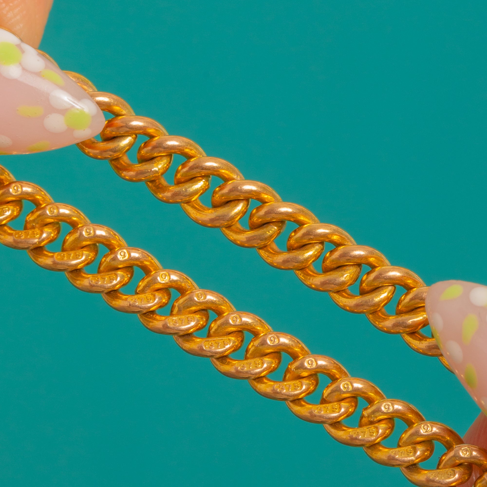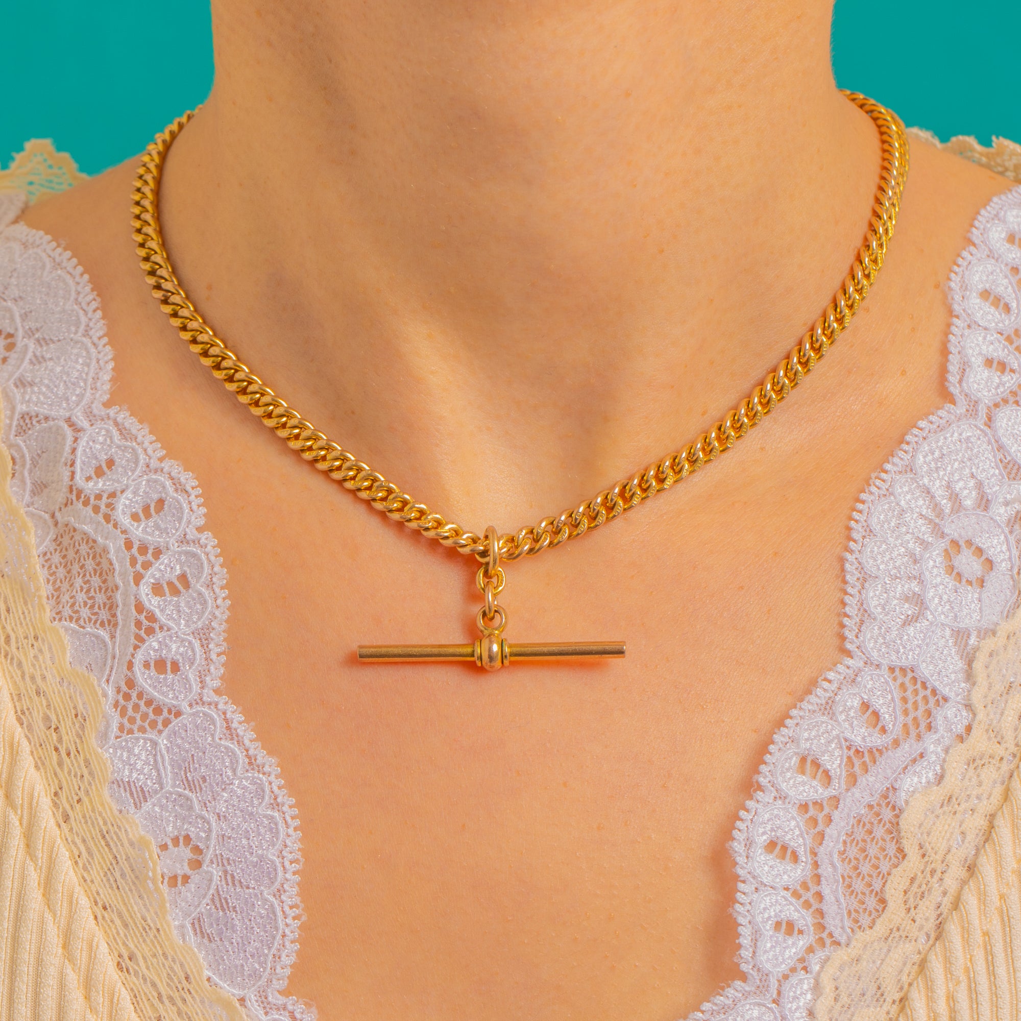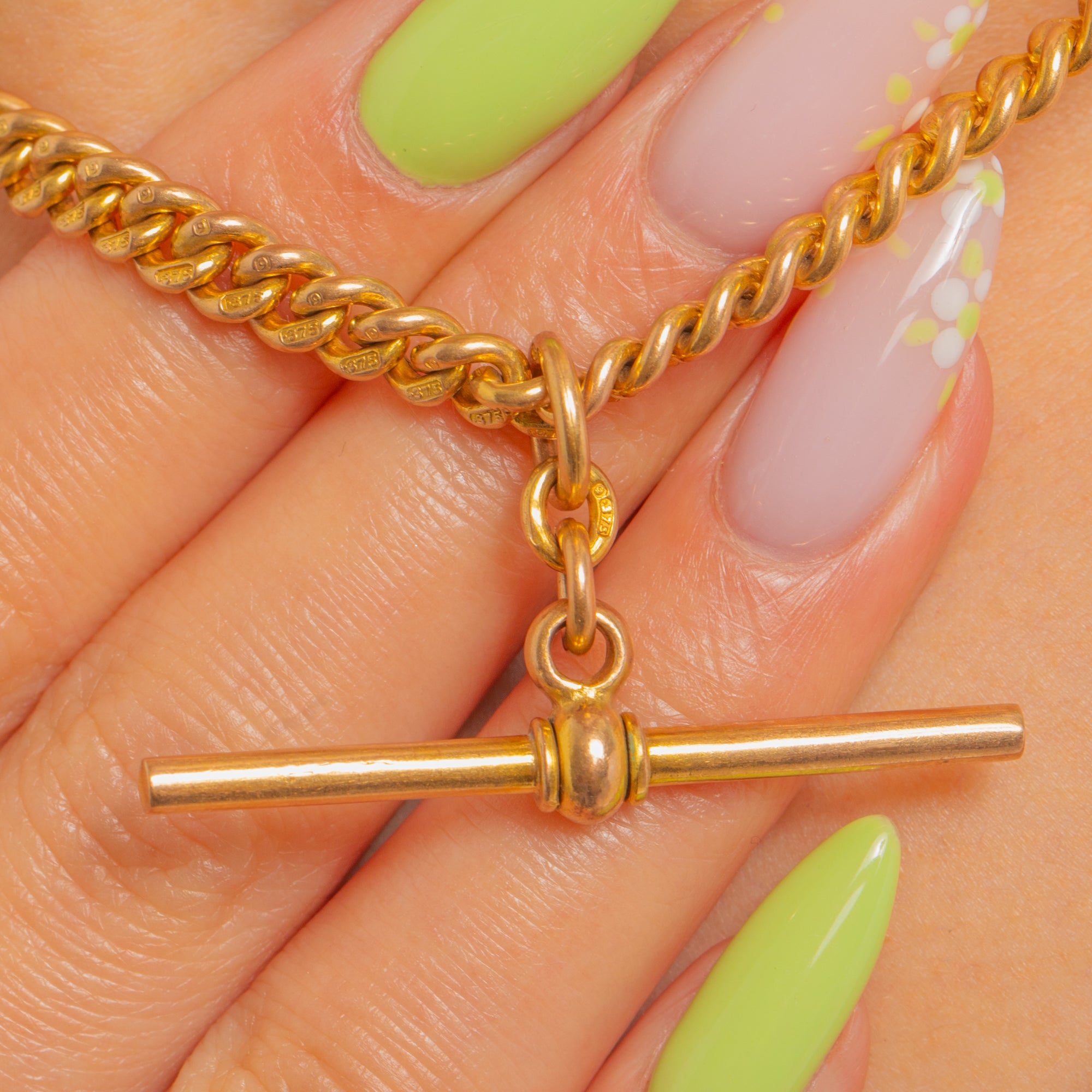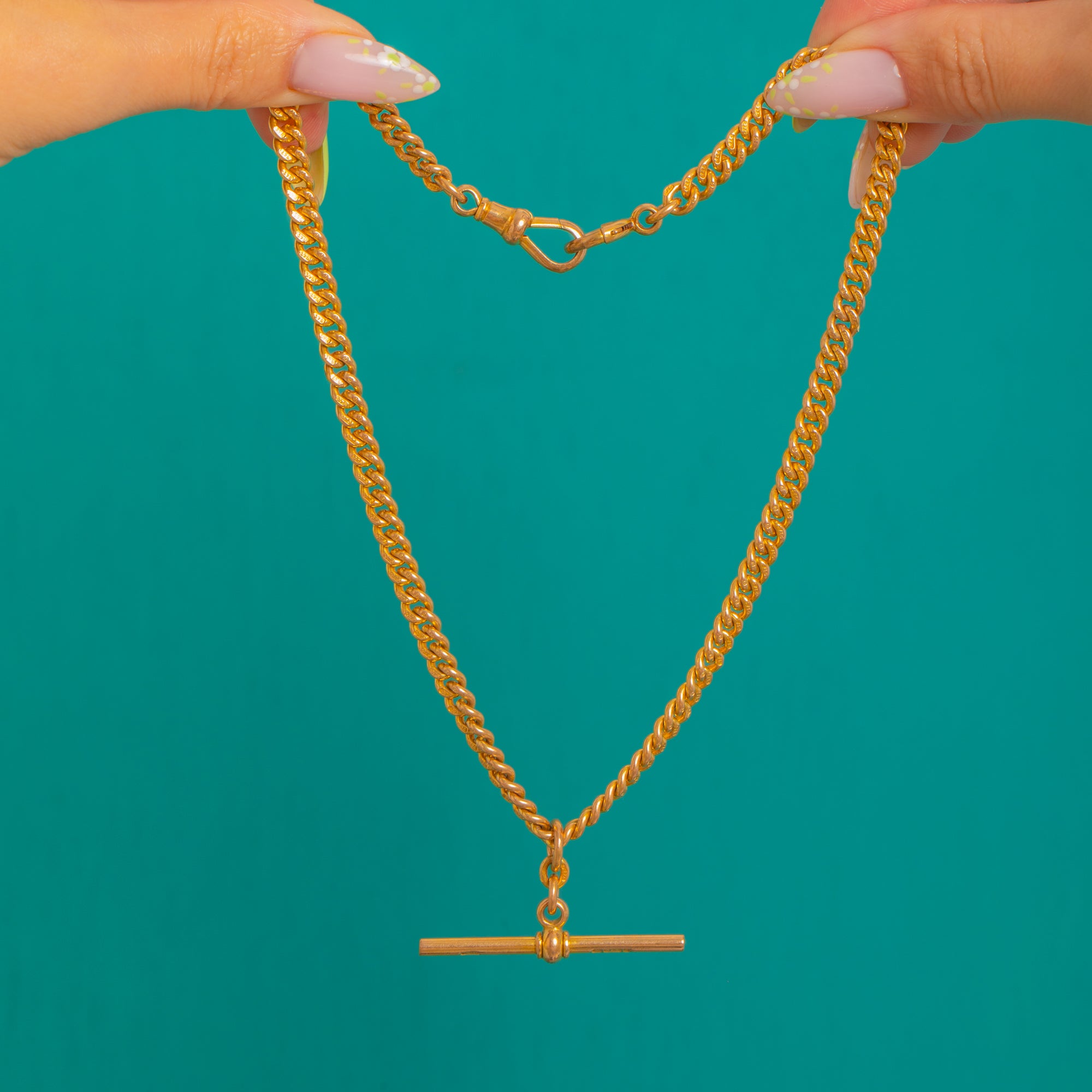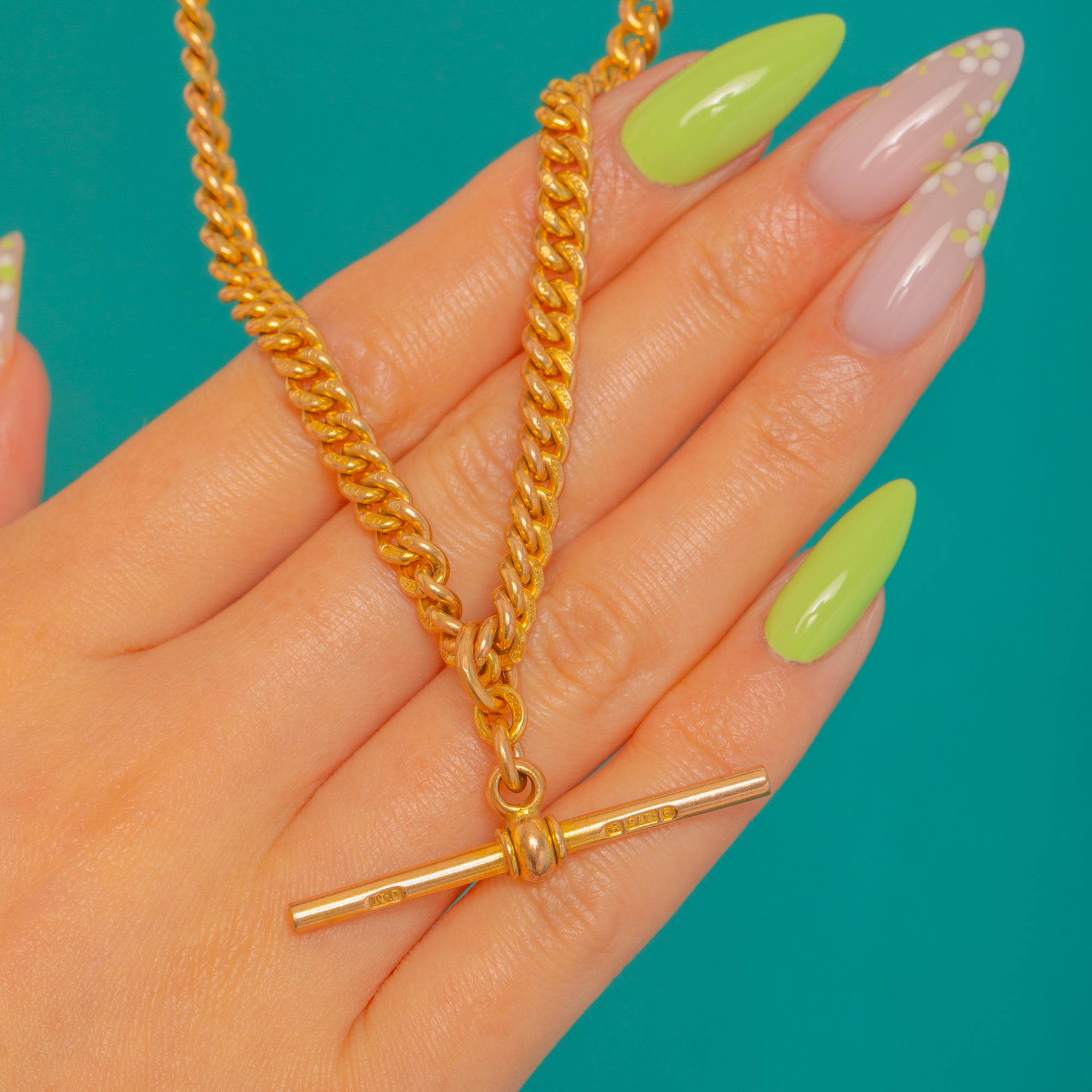 A sumptuous 14" Albert chain in buttery-bright 9ct Yellow Gold, glowing a rich sunshine yellow throughout. The uniform curb links flow into a classic horizontal T-bar, with original dog-clip and bolt-ring for that timeless, utilitarian elegance. Immaculate condition and beautifully polished, it’s a bold, close-to-the-neck collar with irresistible Victorian charm.