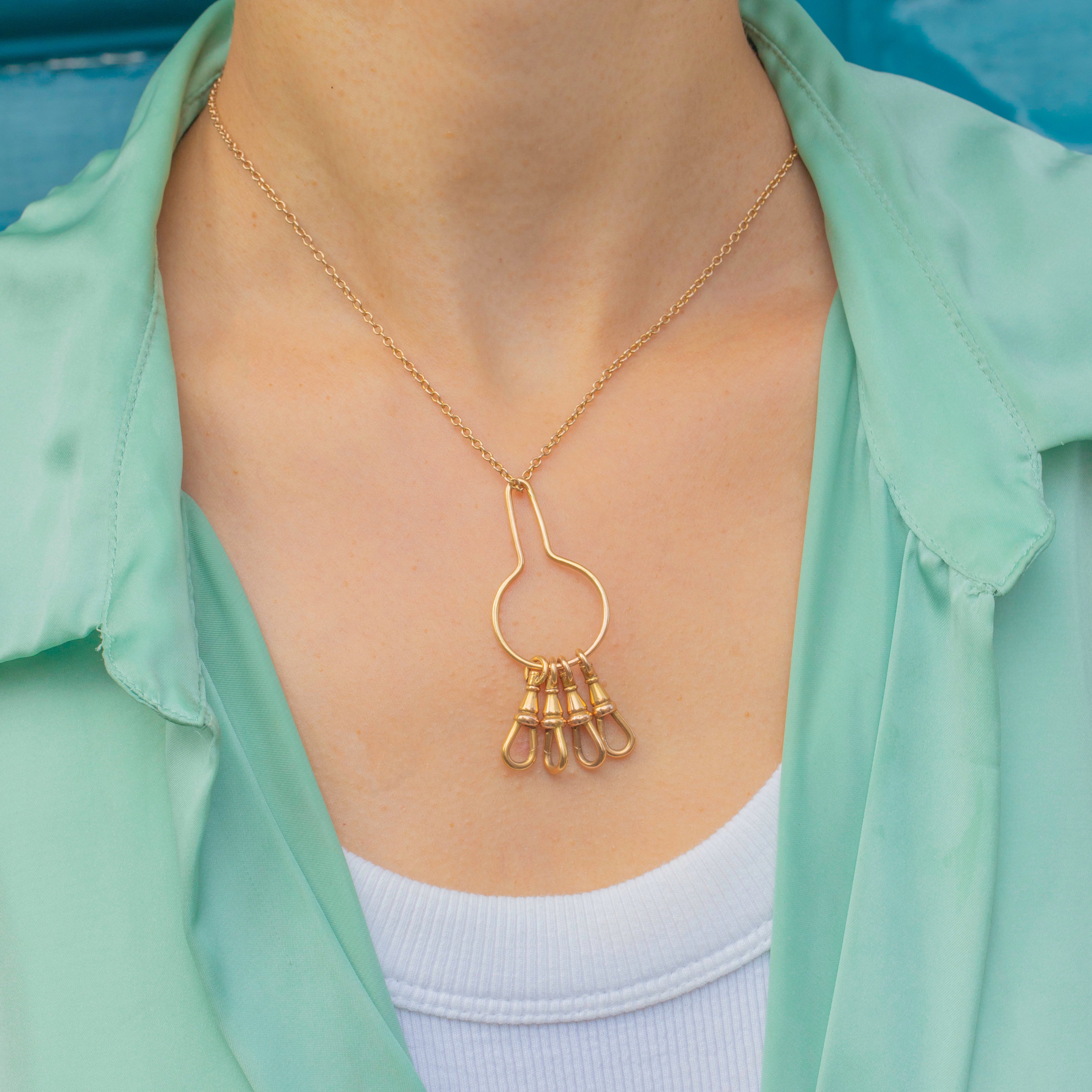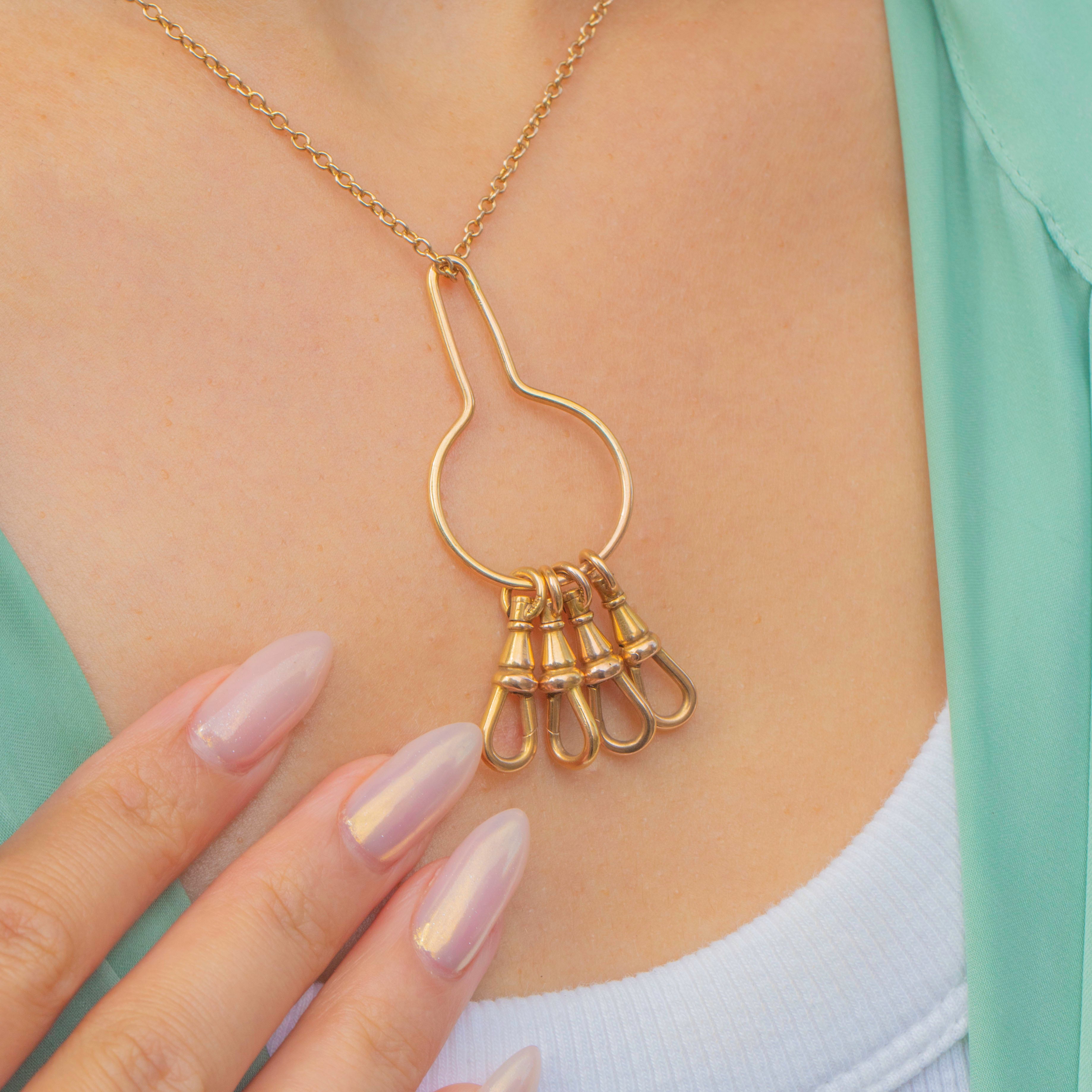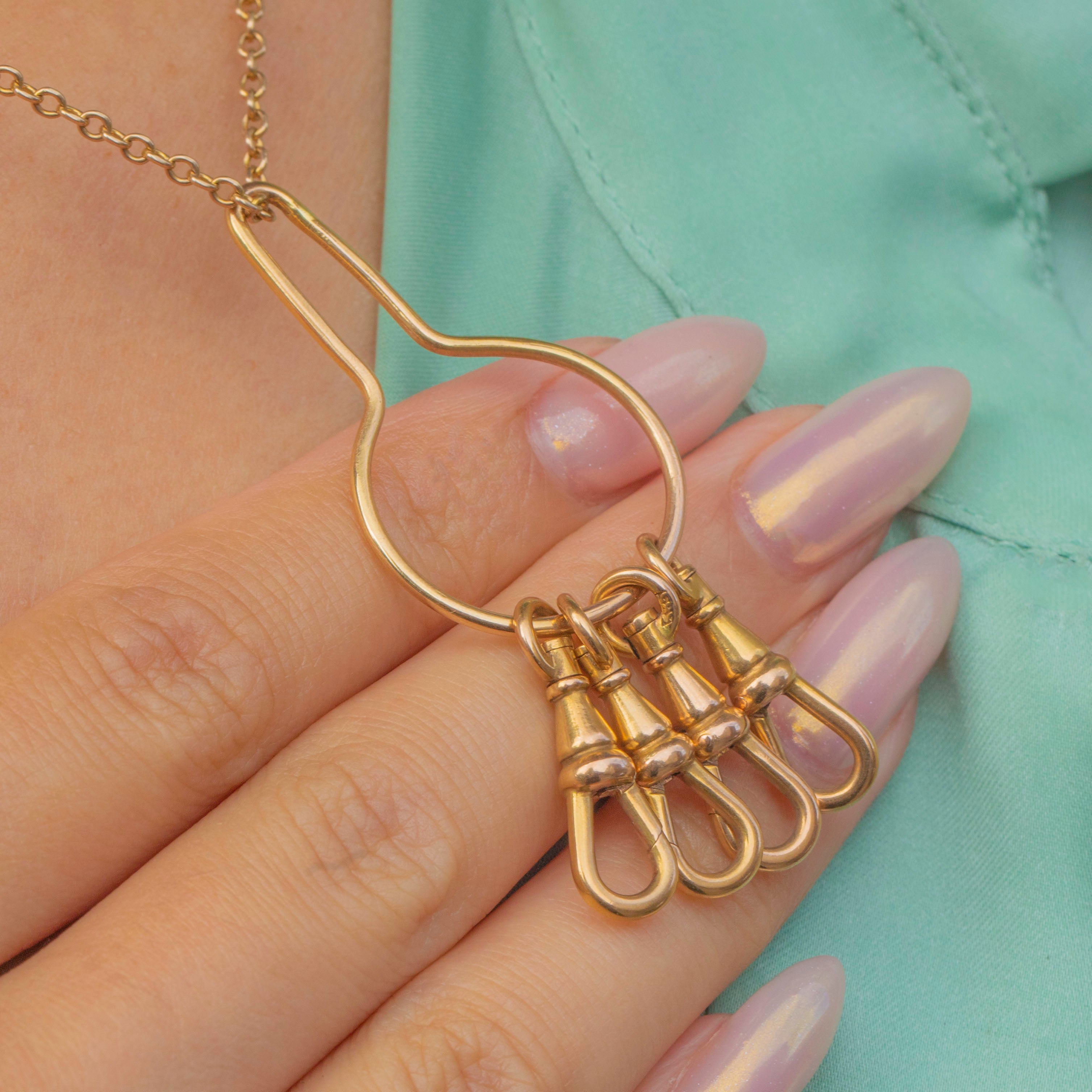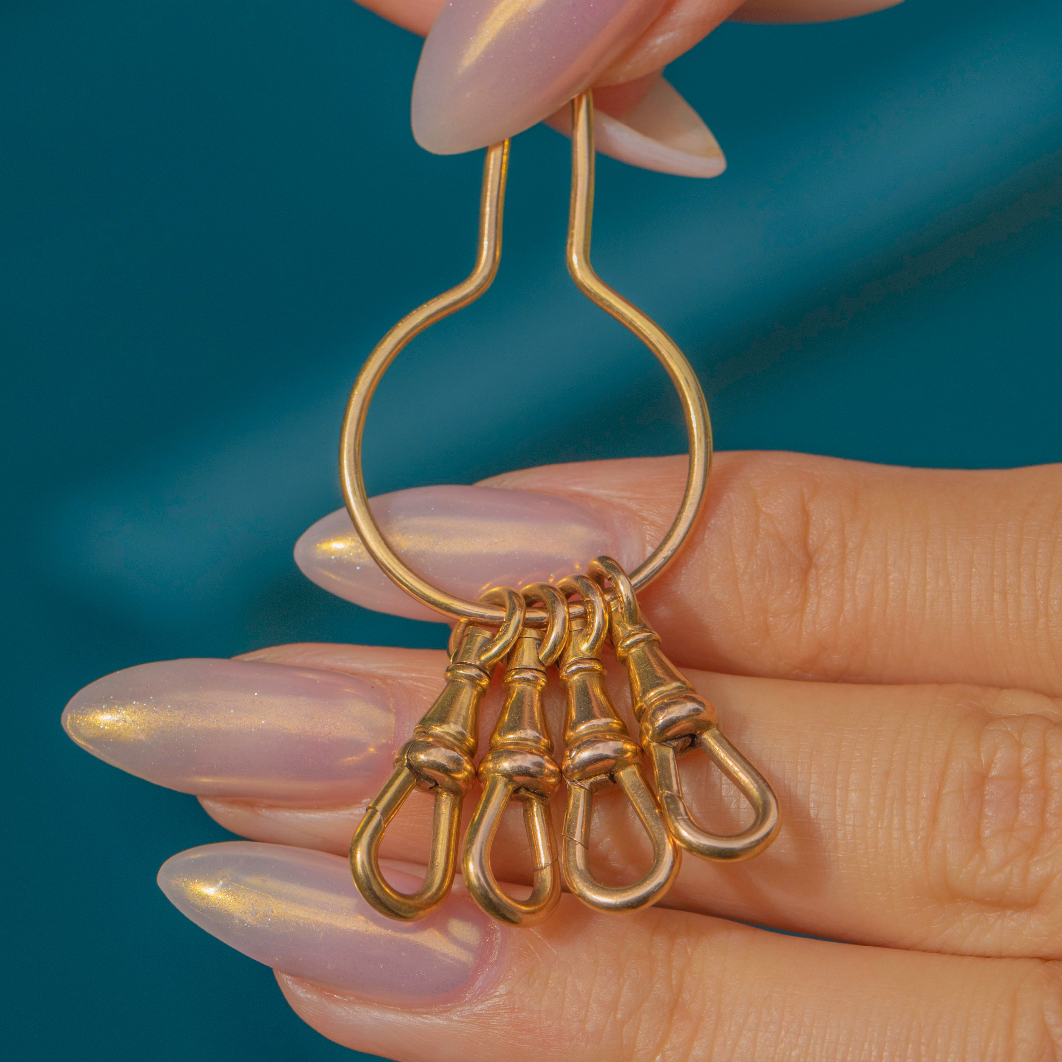 This unusual and versatile charm holder is made up of four antique dog-clip clasps, all stamped “585” for solid 14ct Gold. Dating to the Art Deco period c.1920s, it’s a rare and stylish accessory, allowing you to attach charms, pendants, or chains in multiple creative ways.