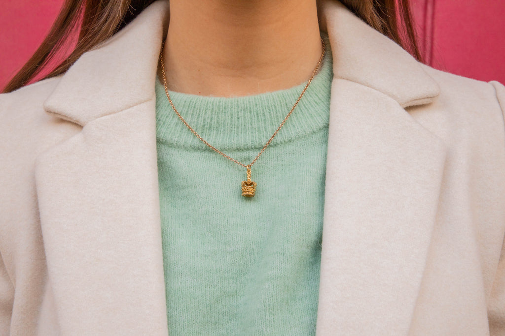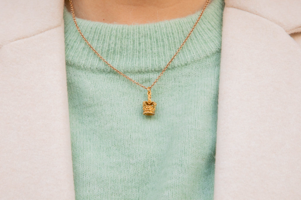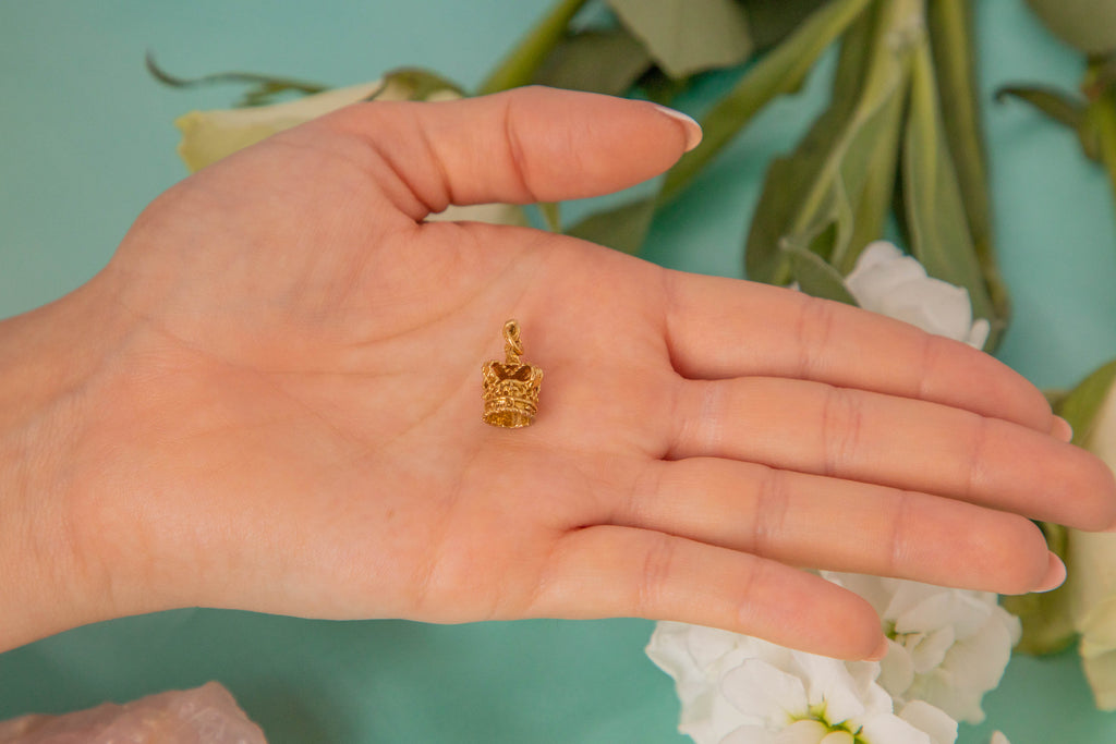 A charming 14ct Gold crown charm pendant to add a regal allure to any look! Created entirely from glossy 14ct Gold, she boasts sunny hues and is packed with fine detailing throughout.