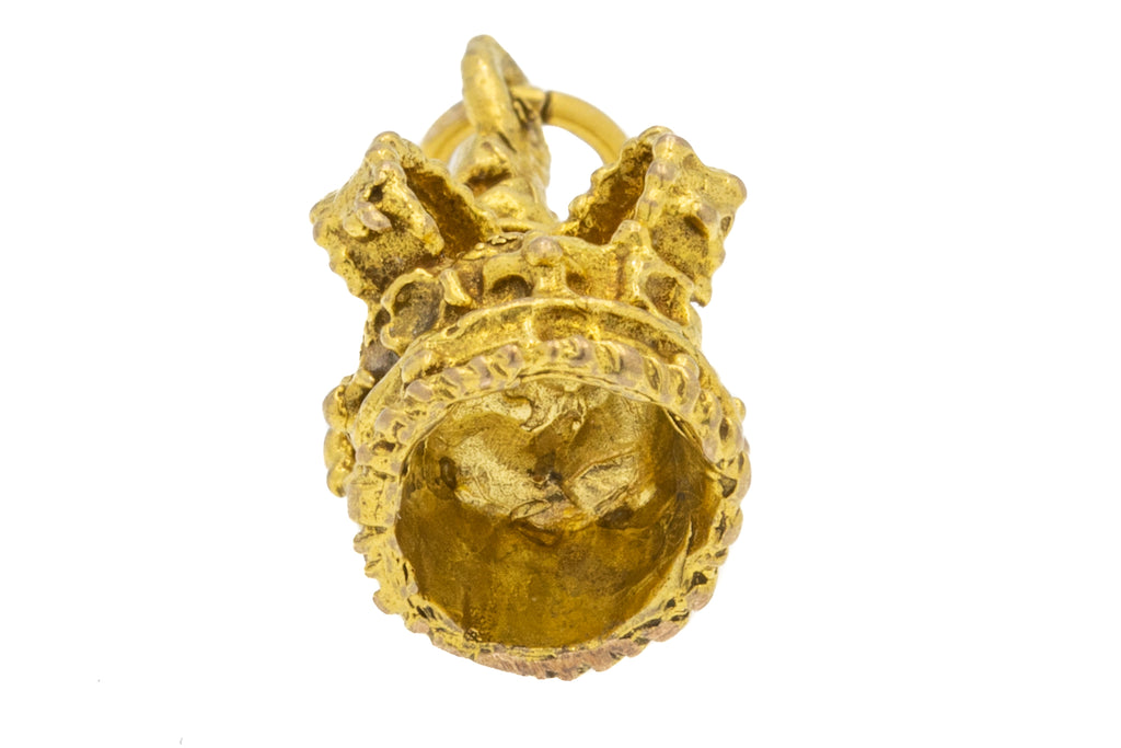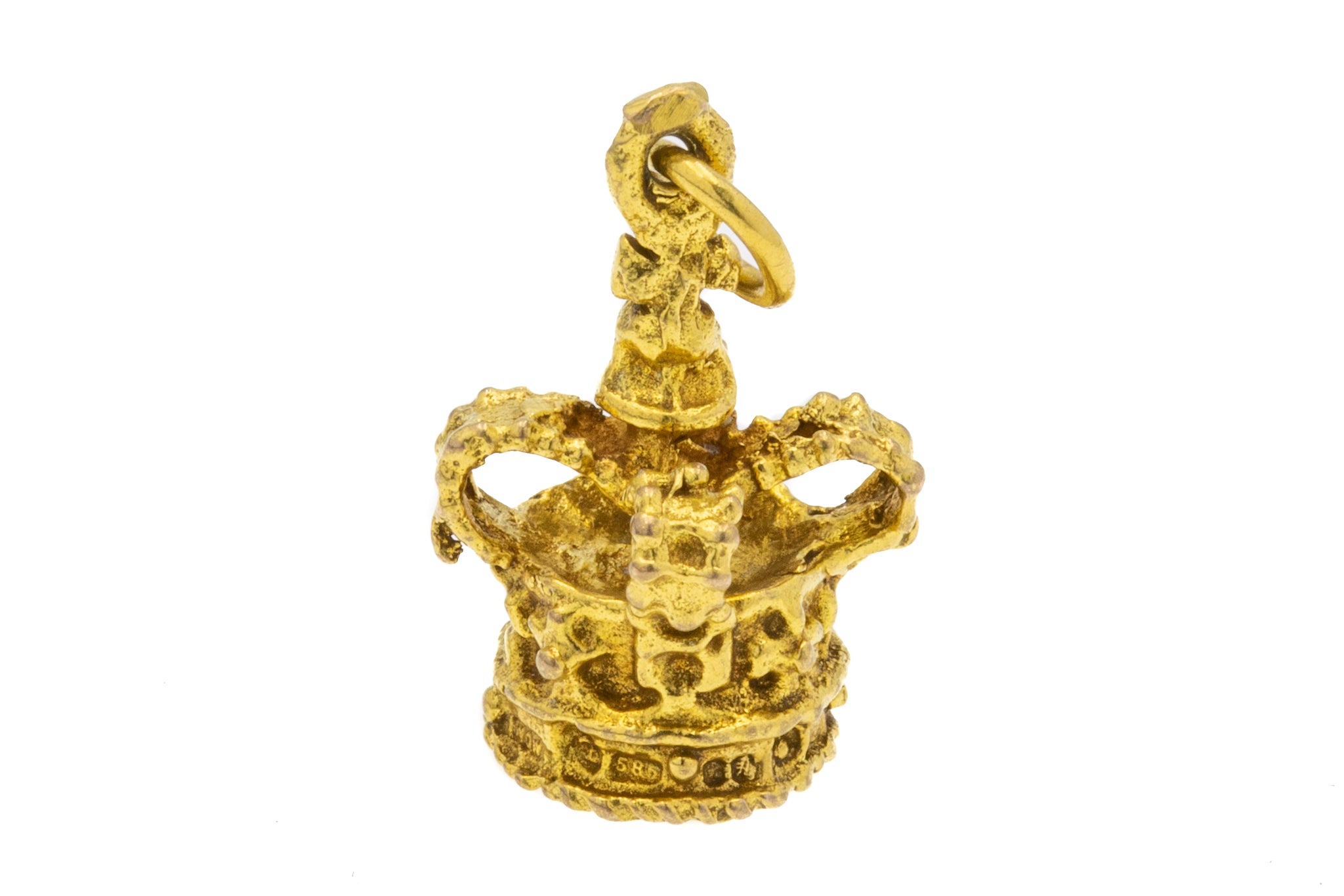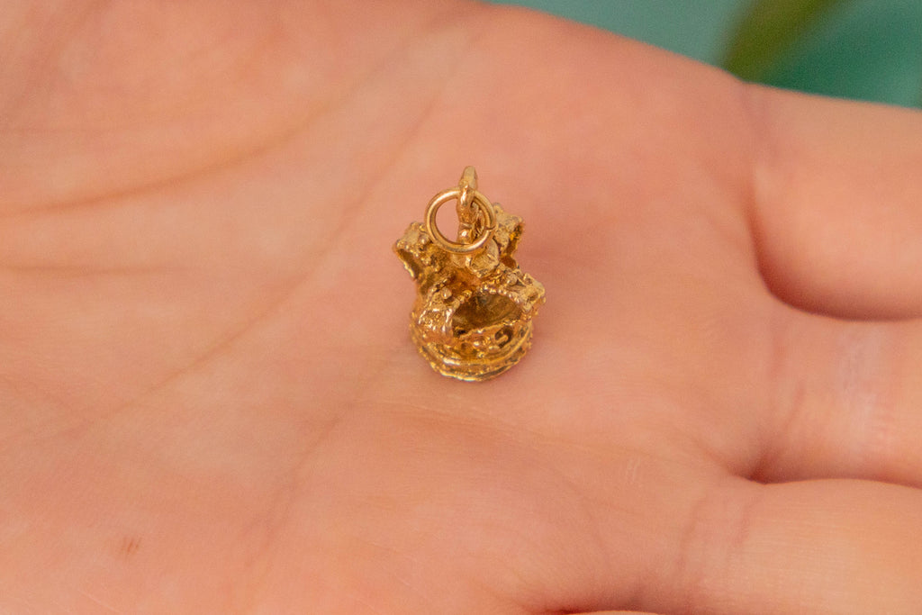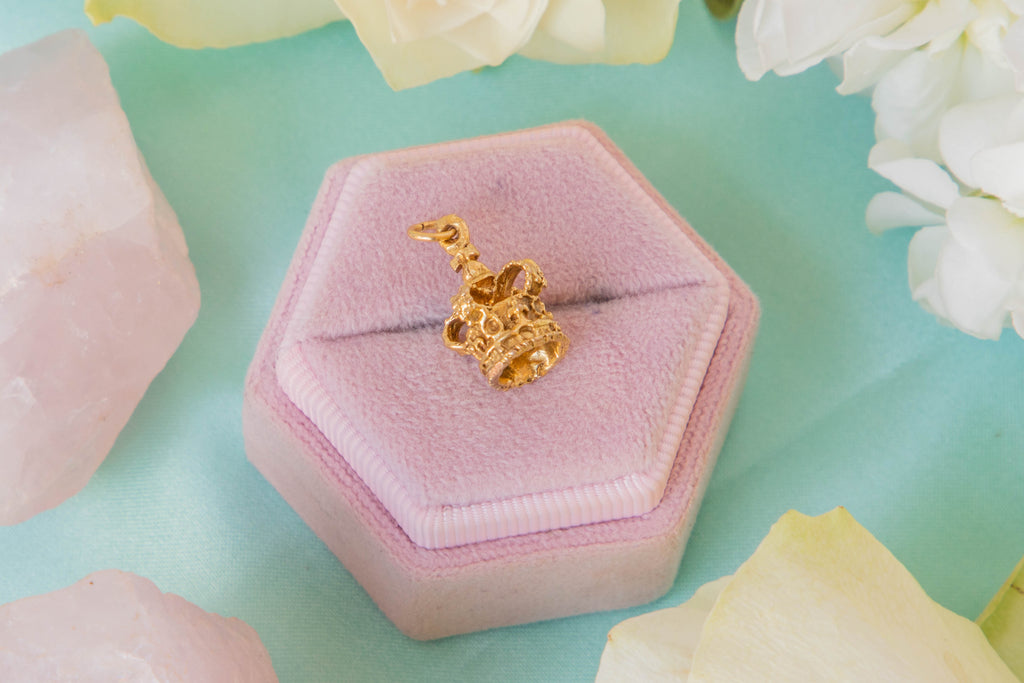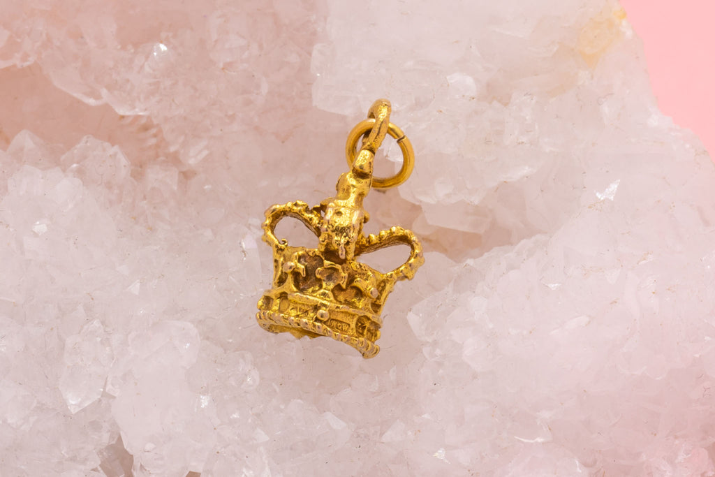 EXCELLENT. A glorious 14ct Gold crown charm pendant in excellent condition! She has amazing fine detailing throughout, with a jump ring for easy. The crown has kept its shape tremendously well, and the Golden hue has remained splendid! There is very little wear overall, making this the perfect piece for anyone looking for a touch of royalty.