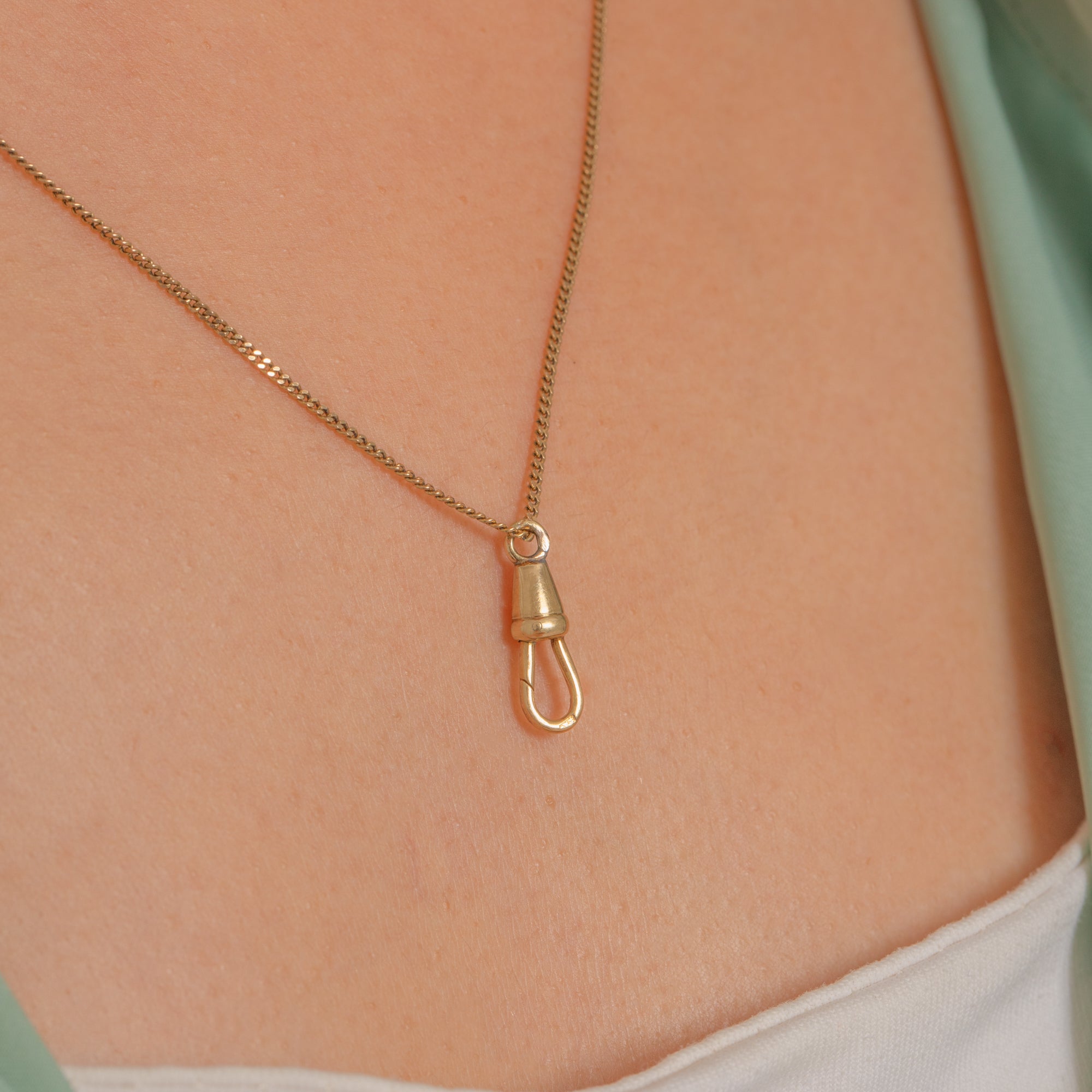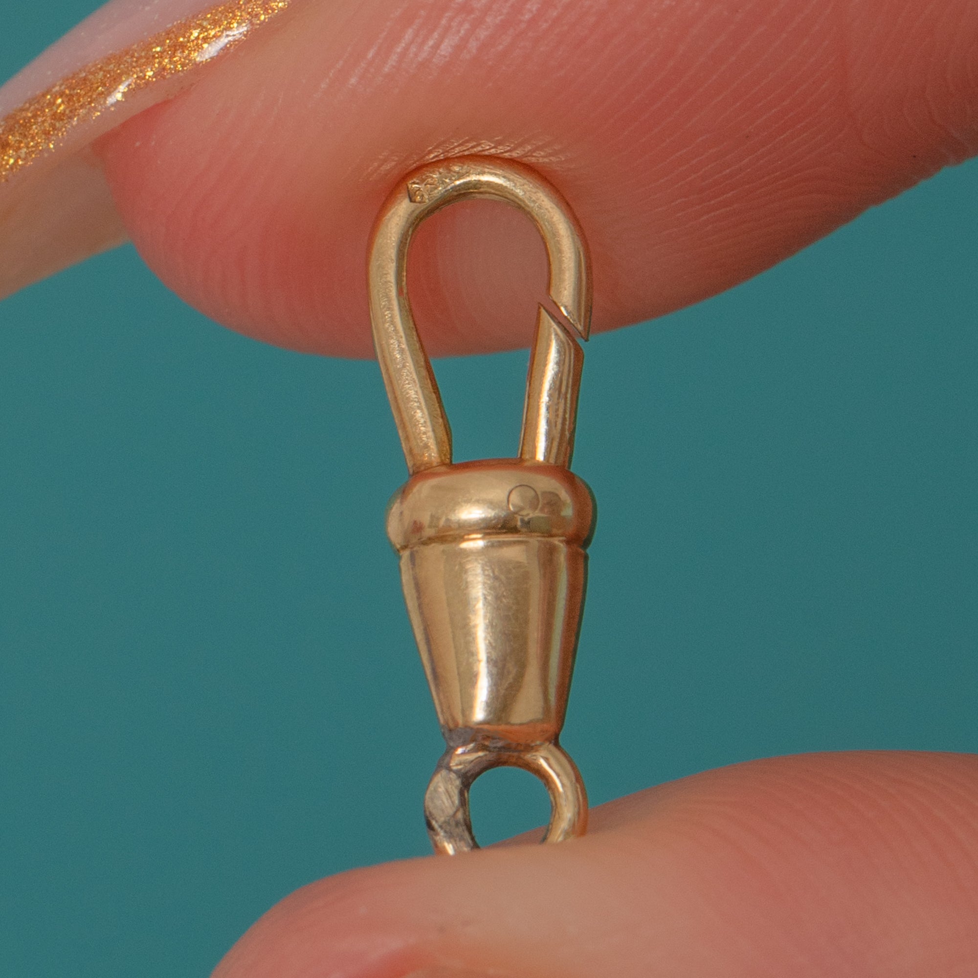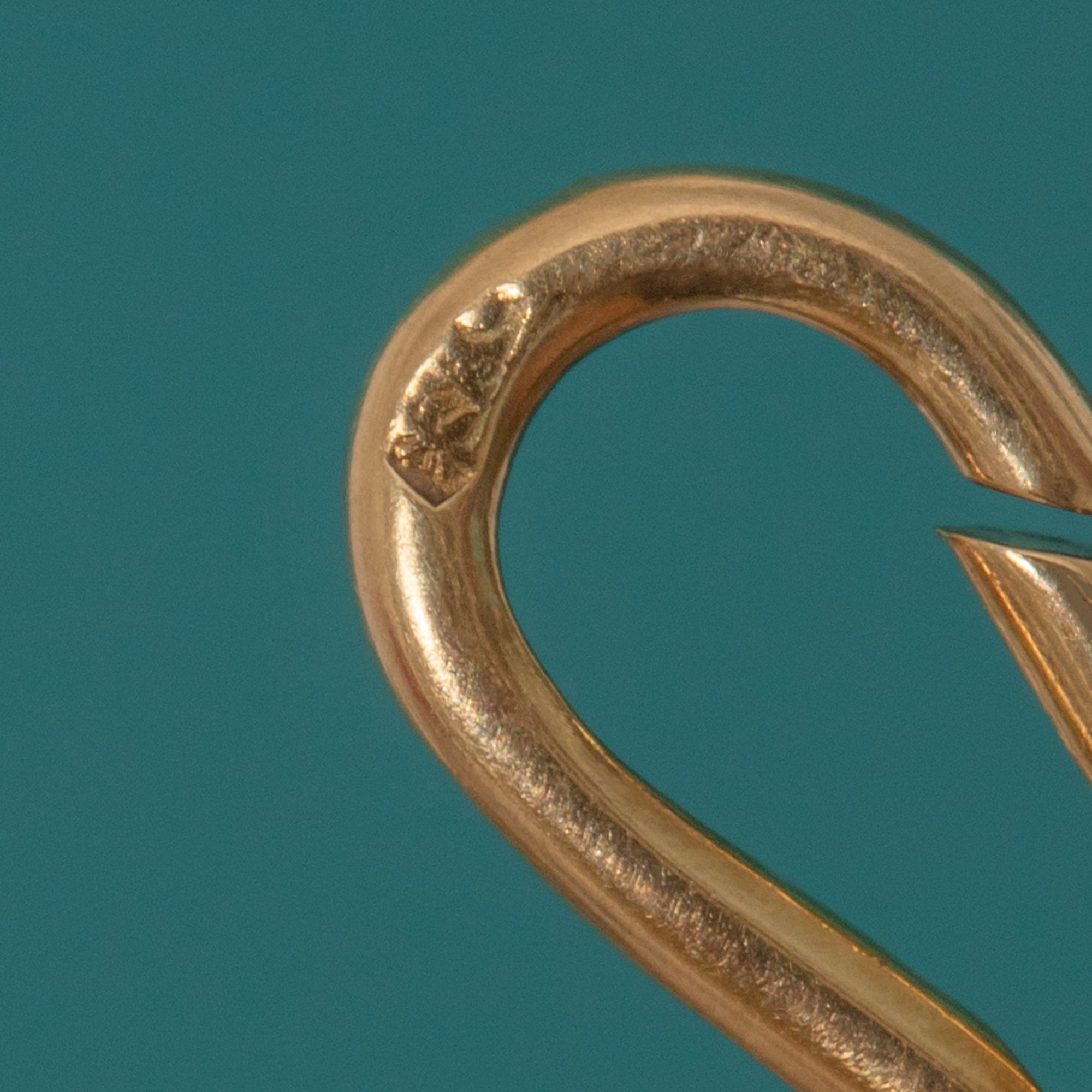This late Art Deco dog clip is a beautiful, high-quality finding from the 1930s. Crafted in rich 14ct Gold Yellow Gold, it features the classic spring mechanism typical of the era — perfect for pairing with antique chains, pendants, or charms.