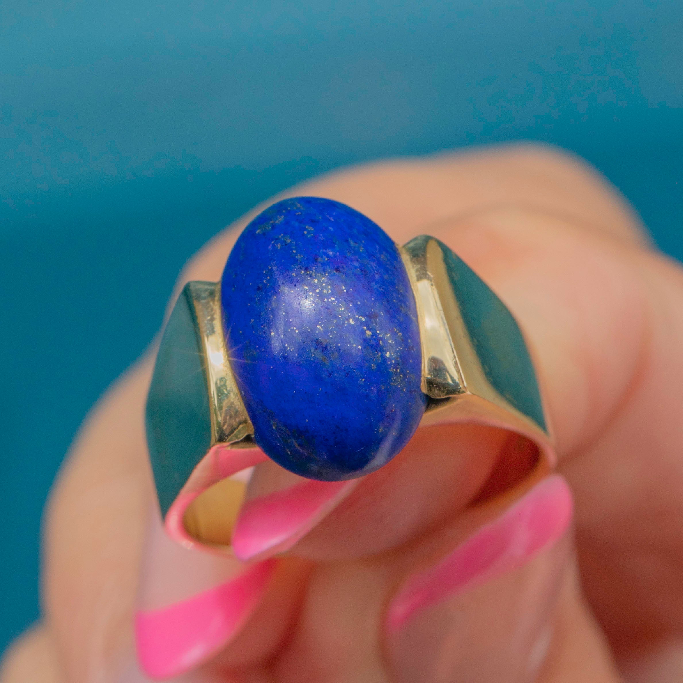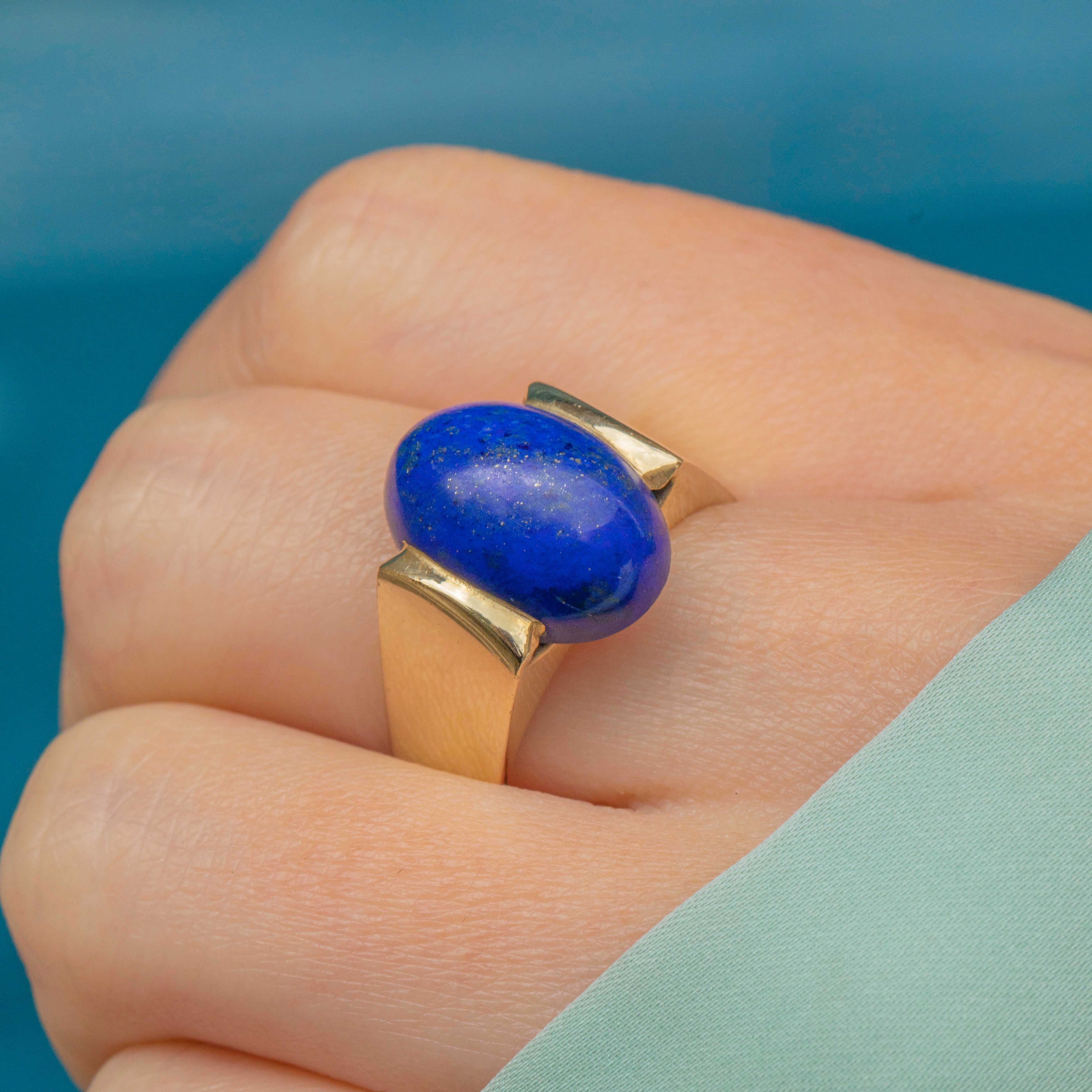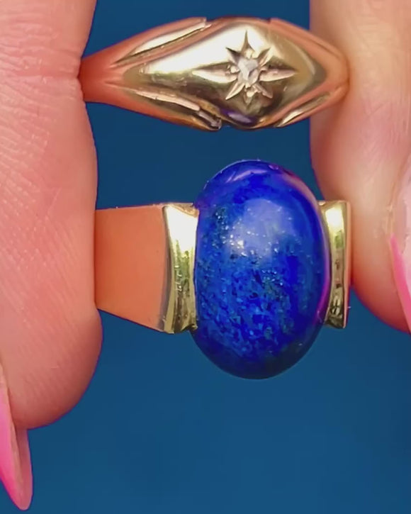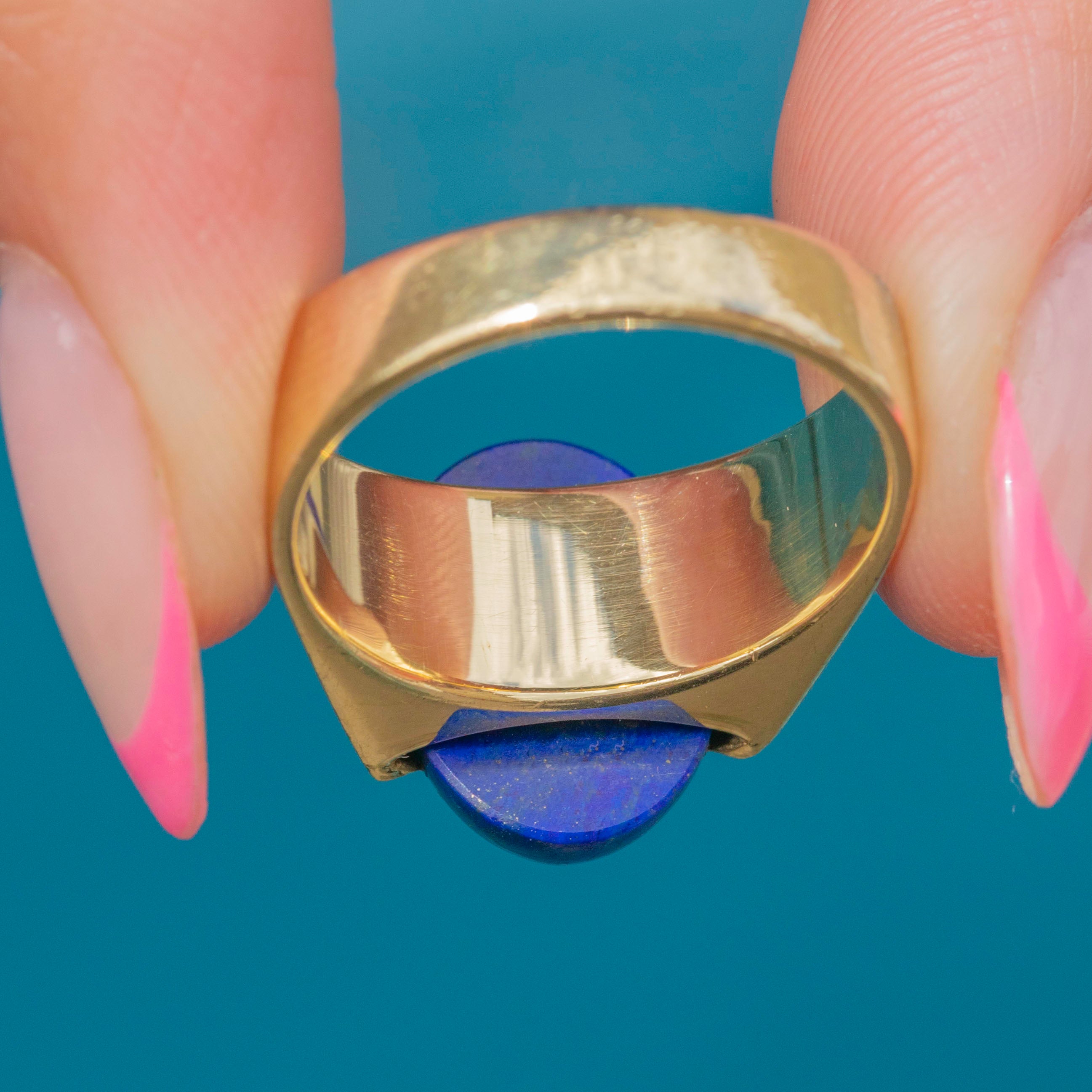 VERY GOOD-EXCELLENT: This 14ct Gold Lapis Lazuli ring is in great condition. The Lapis Lazuli has a lovely domed finish and is securely set. The Gold is bright and buttery, with only some minor dings to the back of the ring band, which are difficult to spot. With little else to note, she is a must-have piece!