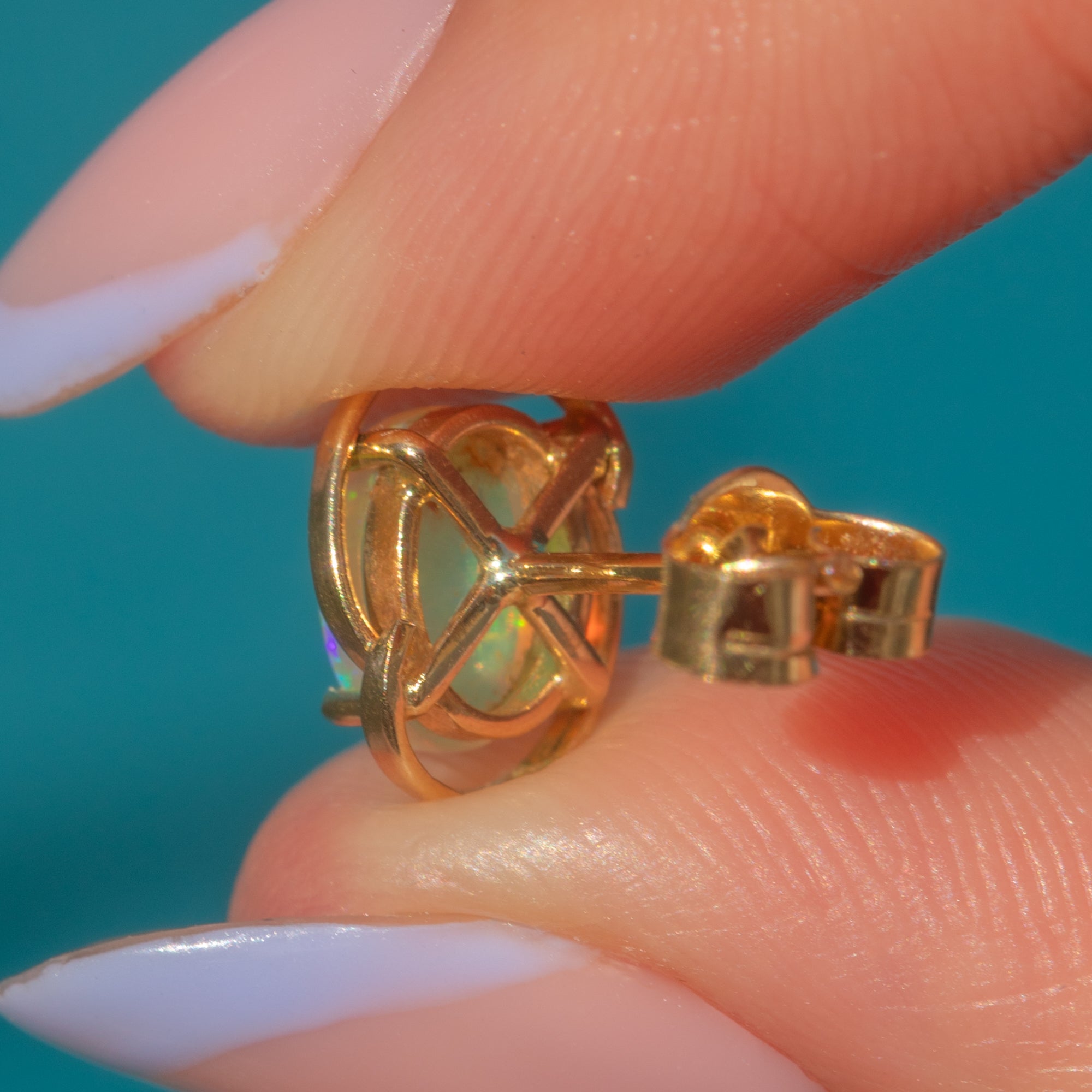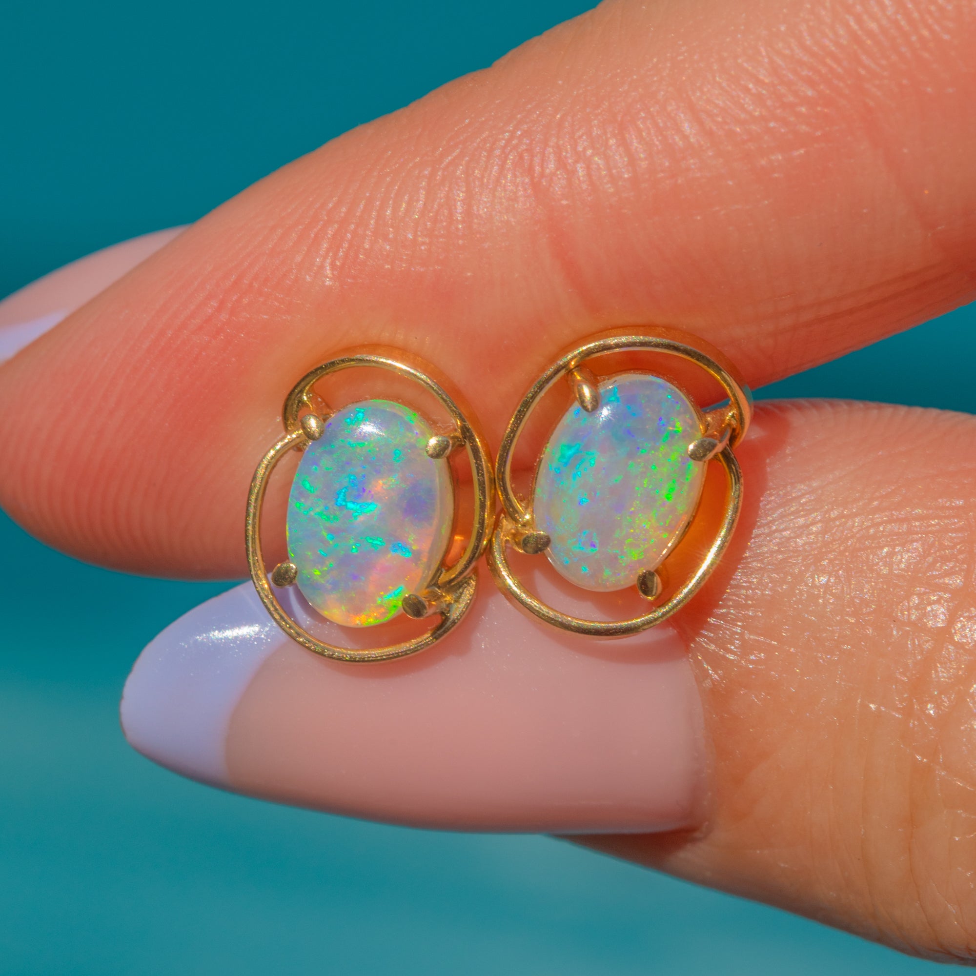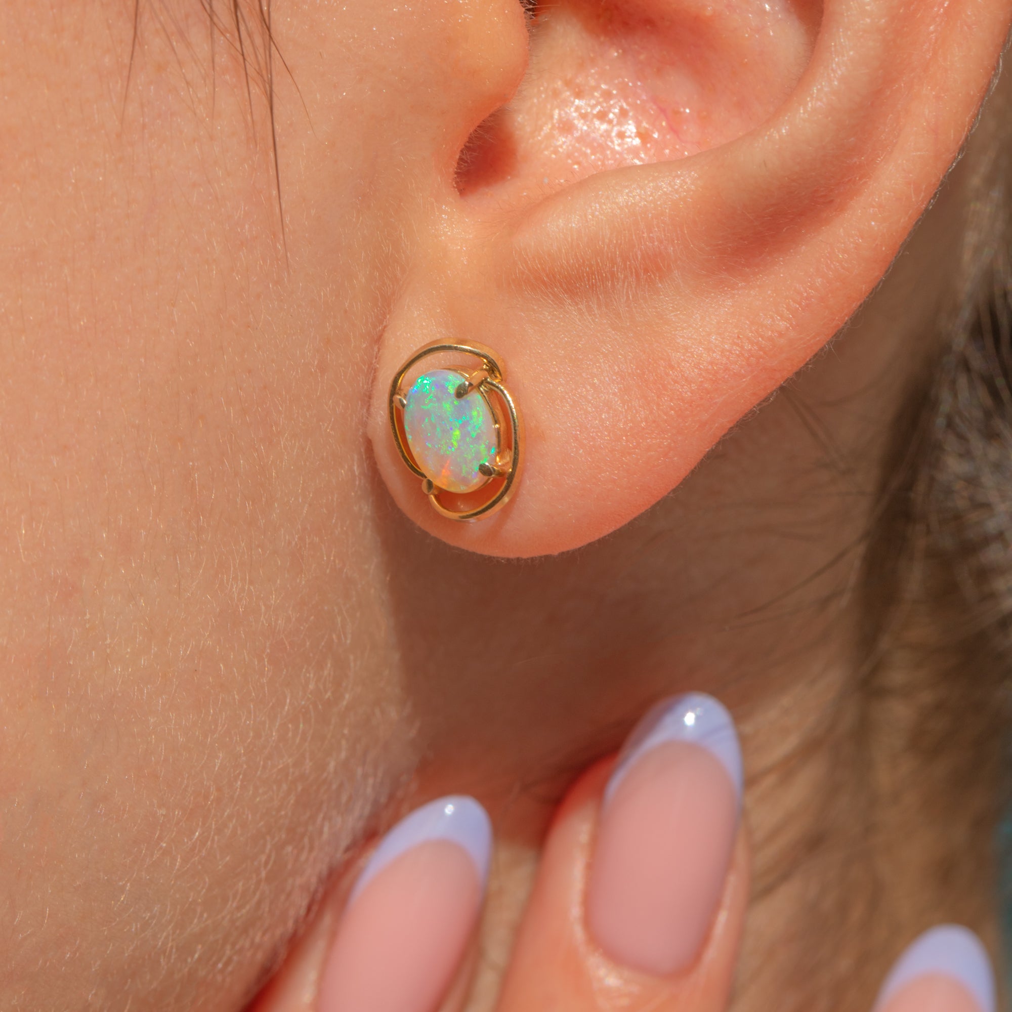Each stud holds a stunning iridescent Opal, radiating a kaleidoscope of soft blues and greens with striking flashes of orange as they catch the light. They are set within buttery 14ct Gold settings, framed by elegantly curving wirework.