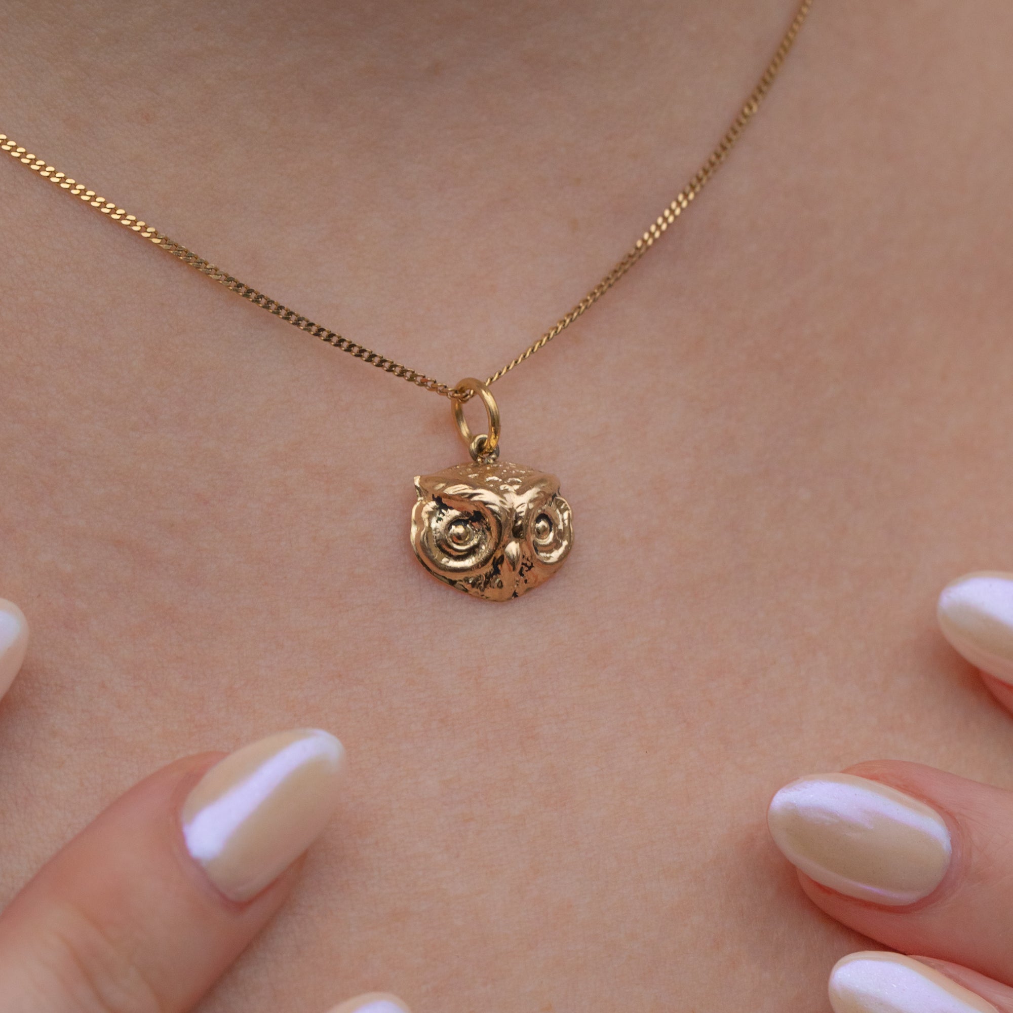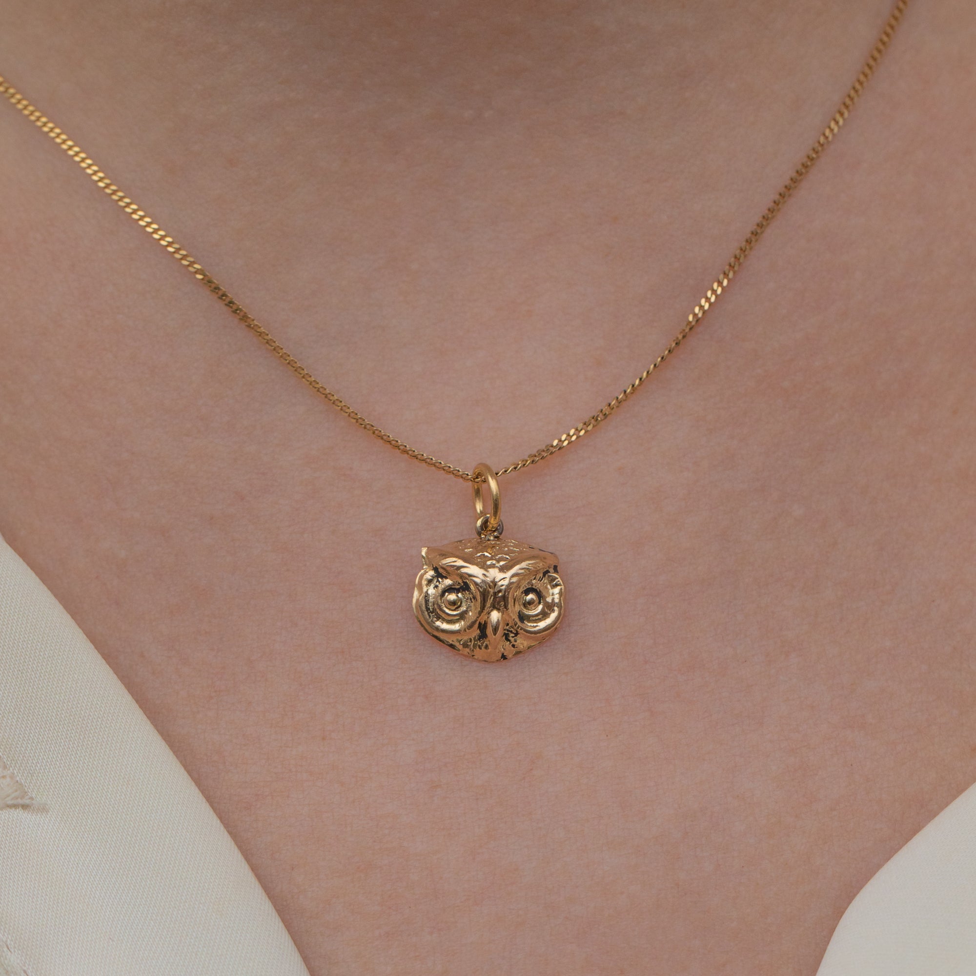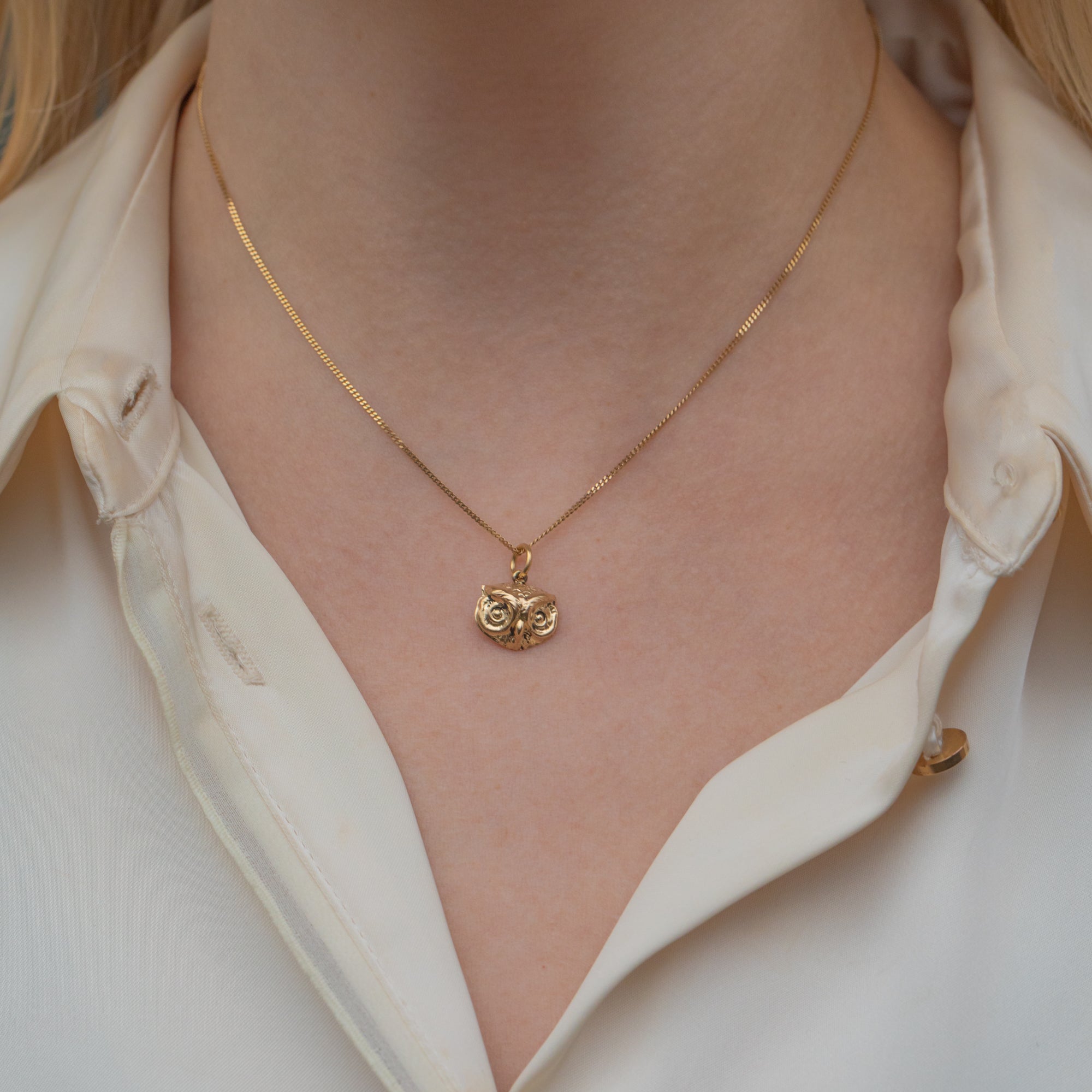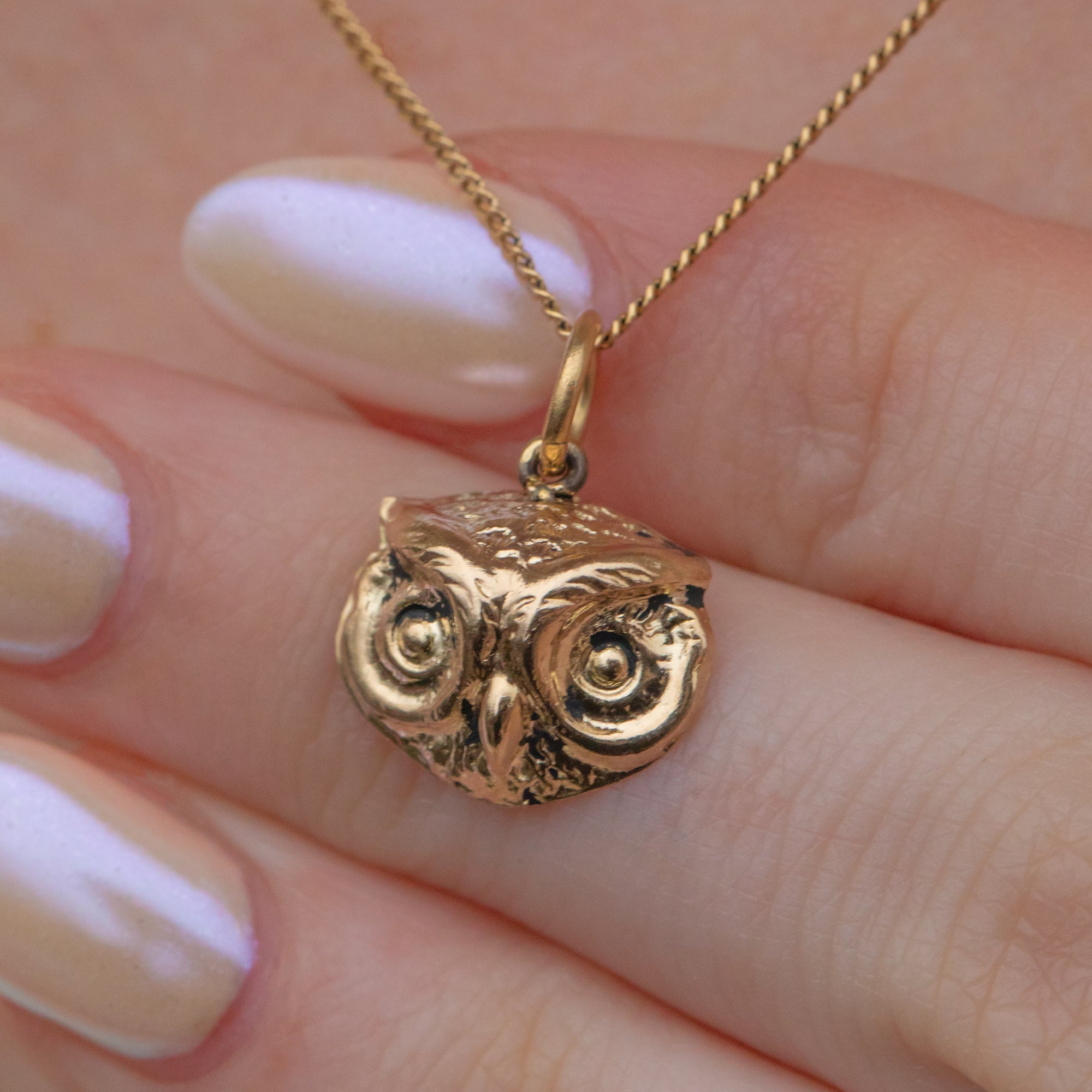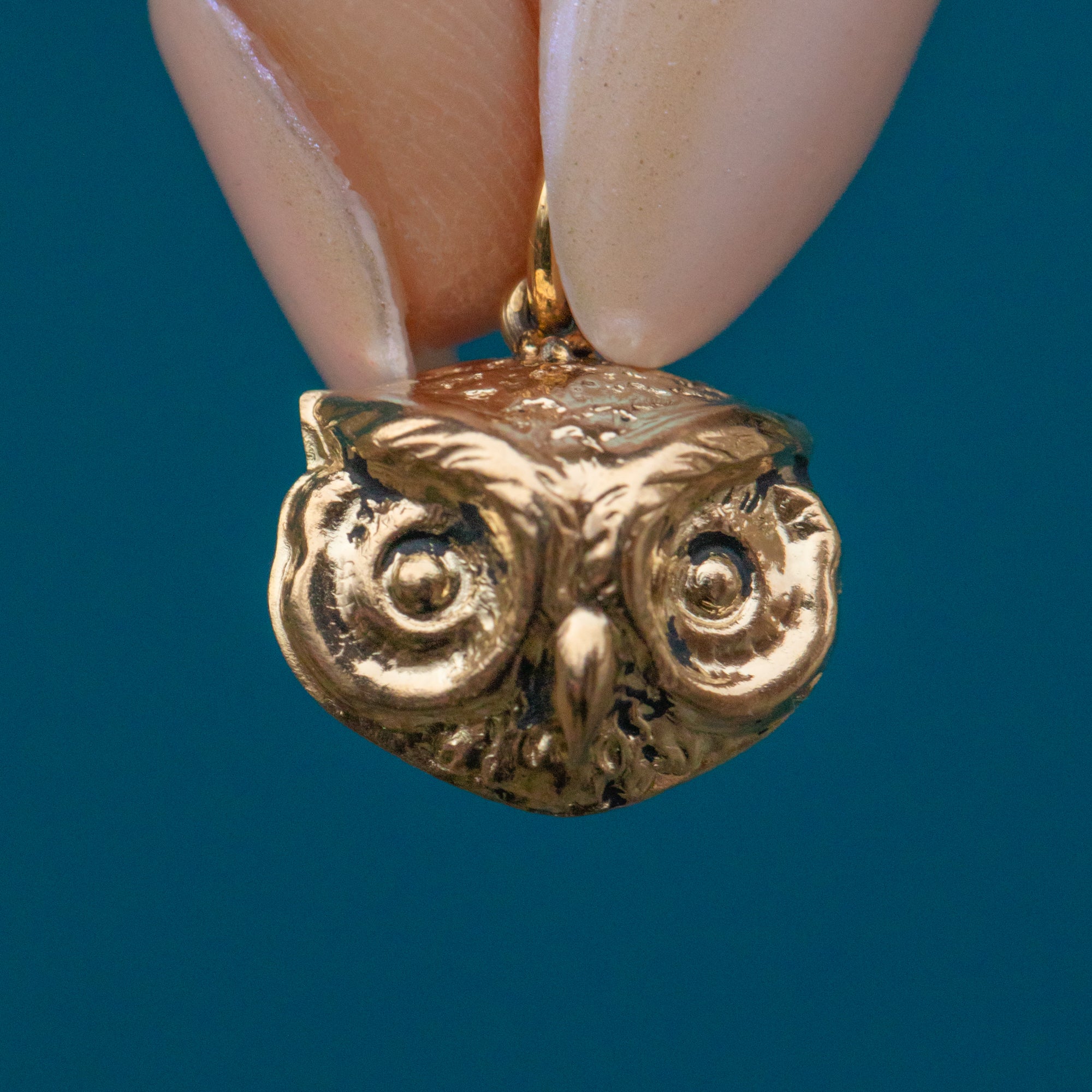 VERY GOOD. This 14ct Gold owl charm is in very good condition. The front of the pendant is pristine, with defined engravings and no visible surface wear. The solder join has come apart in one area on the back, but this cannot be seen when the pendant is worn and it doesn't impact the integrity of the piece. With a securely soldered jump ring, you can suspend this solid Gold owl pendant from a chain with confidence!