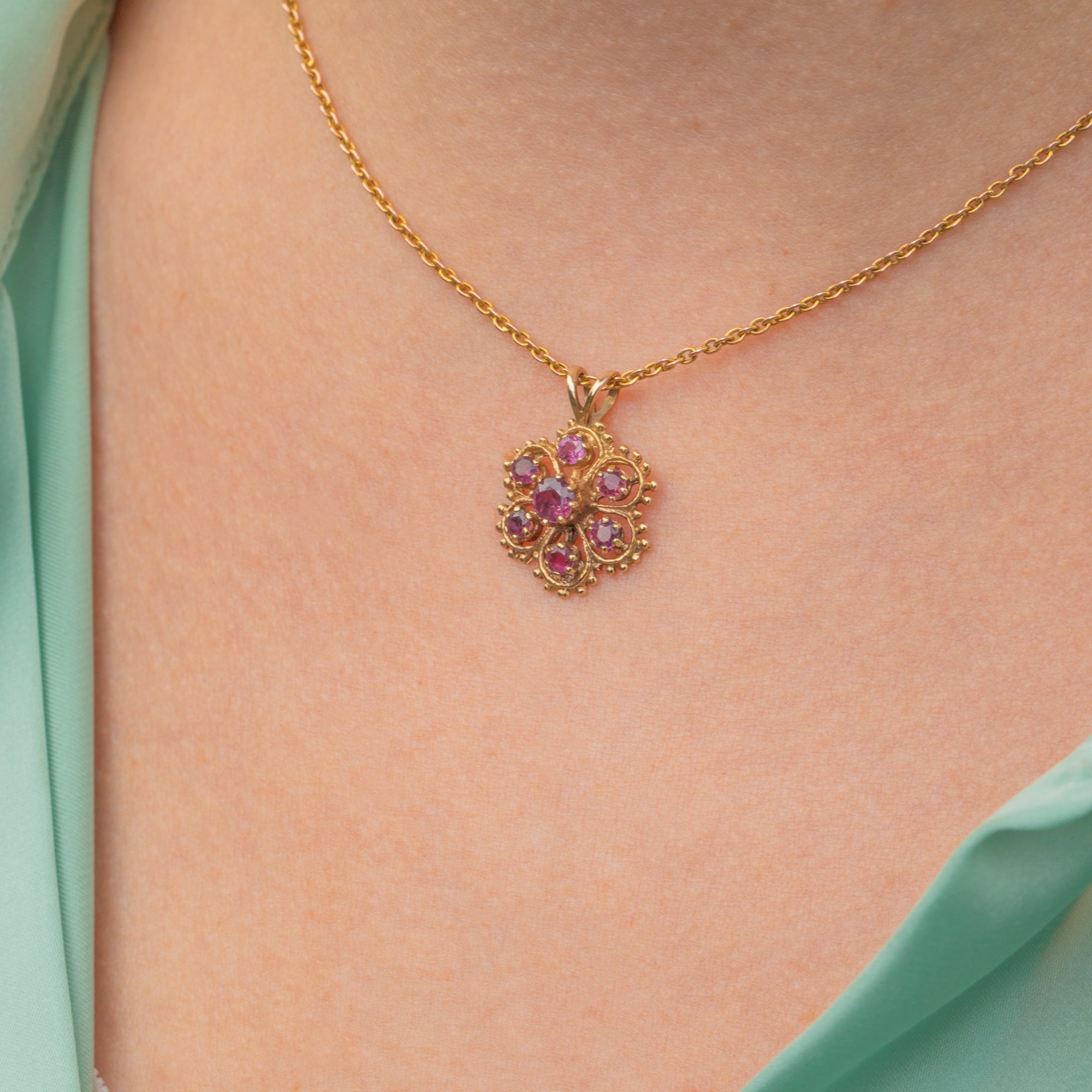 EXCELLENT. With all her Sapphires secure and free from any wear, the Gold buttery and the body of the pendant having remained well formed, this 14ct Gold pink Sapphire flower pendant is in excellent condition and can be worn with confidence with the use of its robust bale!