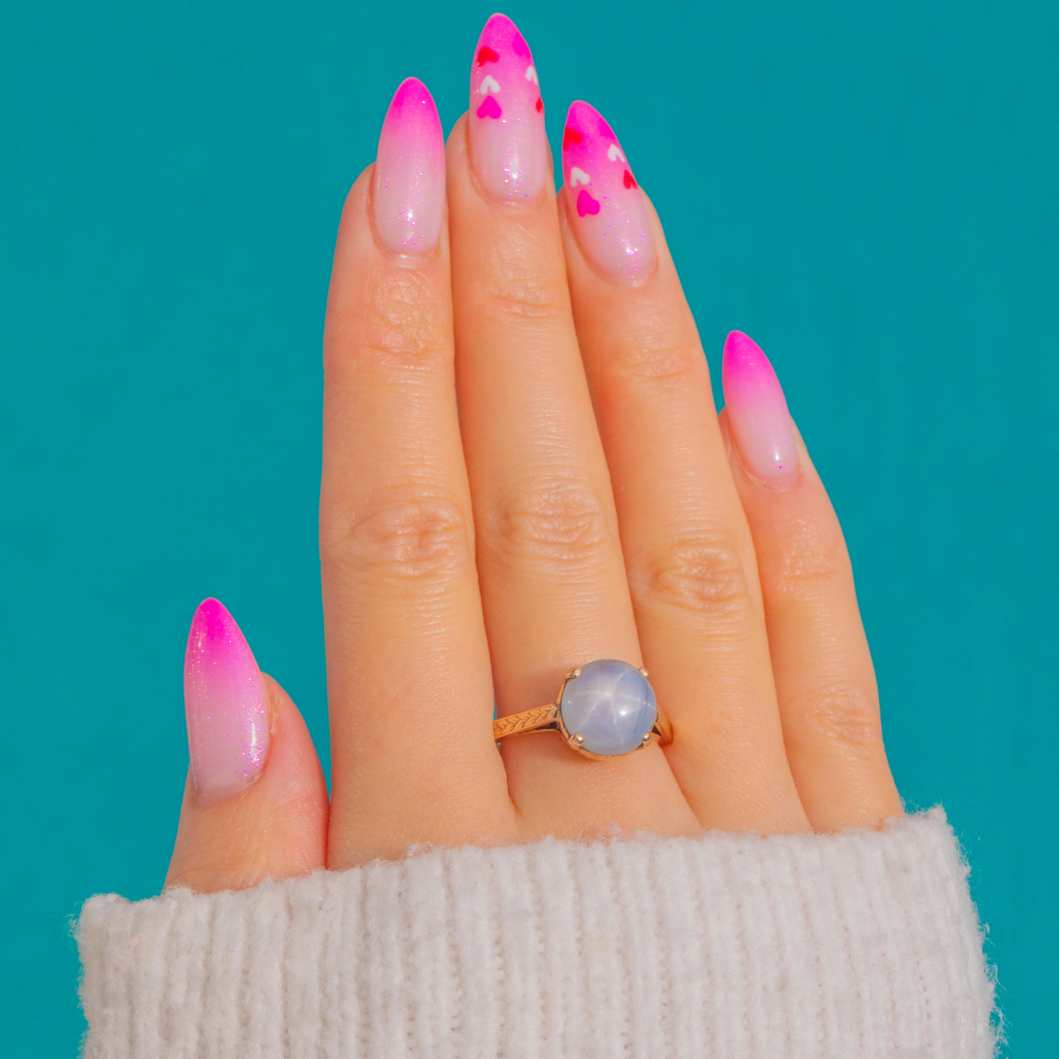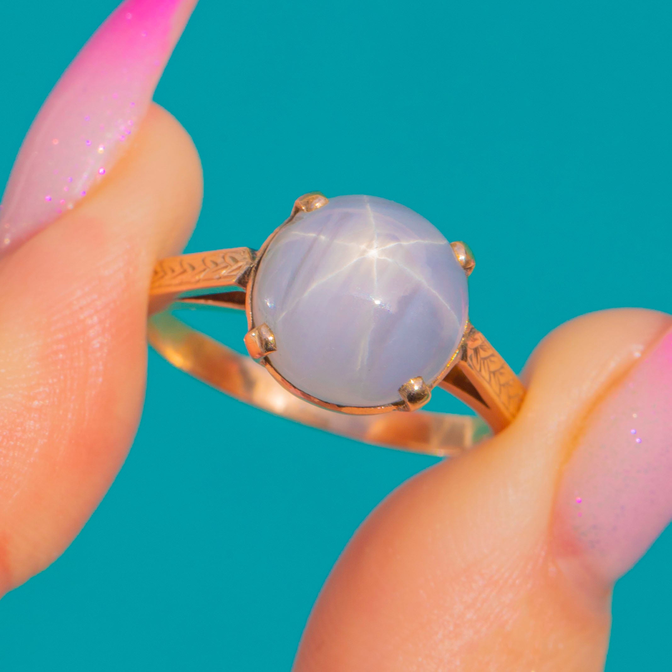 EXCELLENT: The Star Sapphire is bright with a well-defined star; only faint natural surface lines and light abrasions are visible under magnification. The 14ct Gold setting and engraved shoulders are crisp with minimal surface wear, and the claws are secure. No obvious signs of resizing or restoration.