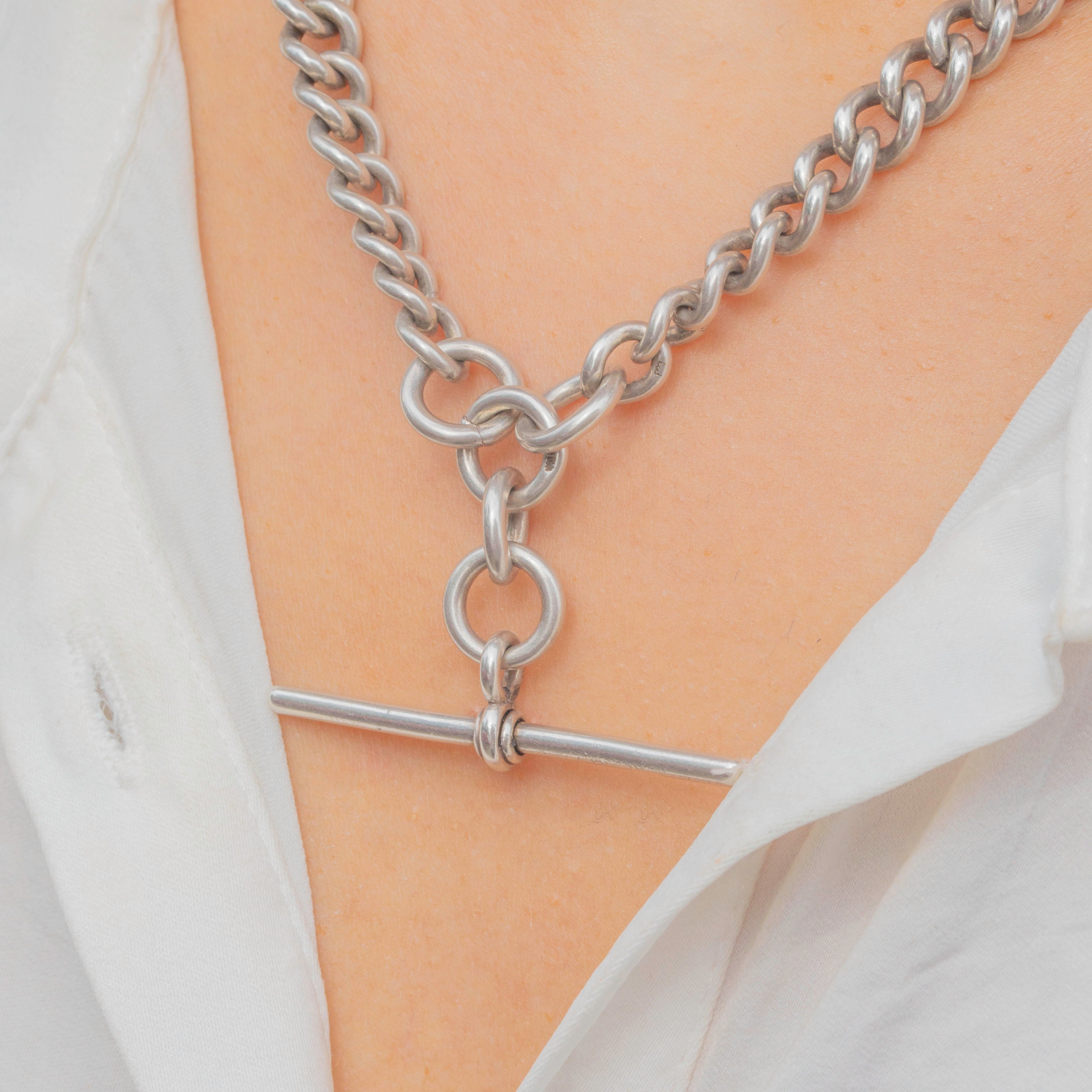 Radiating antique charm, this Silver Albert chain is formed of glossy graduating links which catch the light brilliantly and project a lustrous sheen from their curvaceous forms.