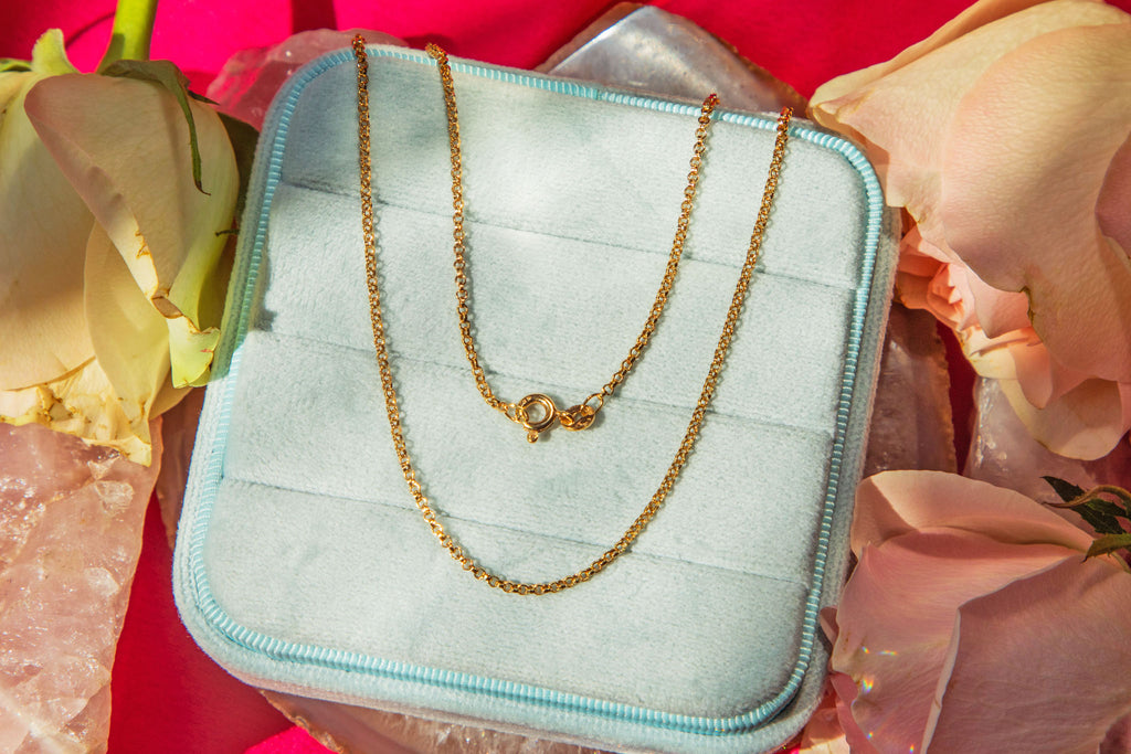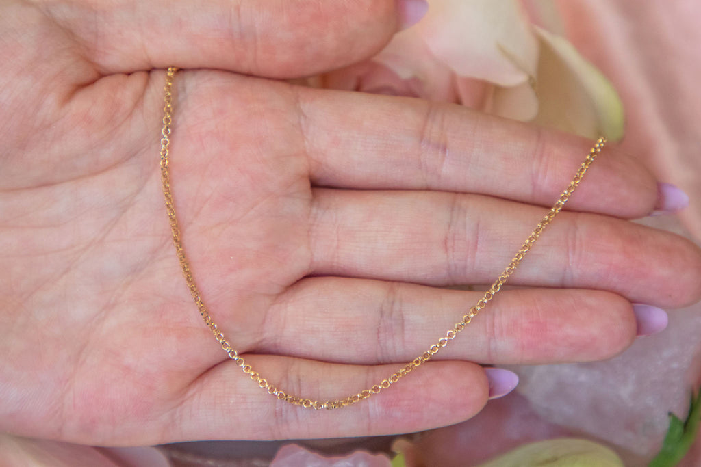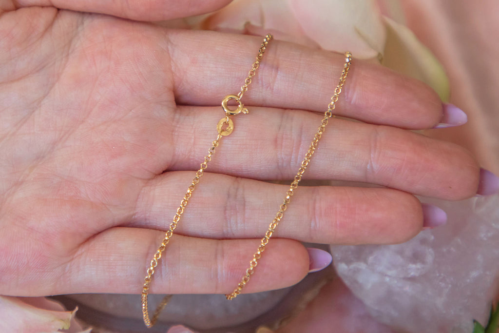 This versatile 15.5" skinny 9ct Gold pendant chain has been crafted from solid, buttery solid 9ct Gold and radiates warmth! A vintage chain is a necessity in everyone's jewellery collection, and this could be your perfect one attending to all your charm and pendant holding needs.