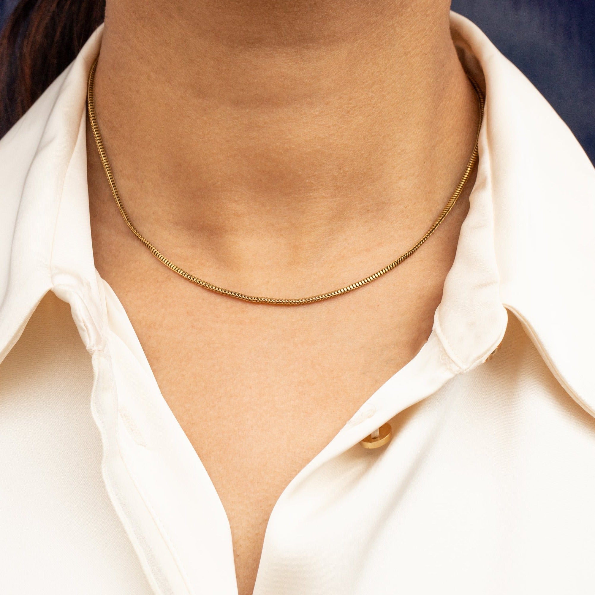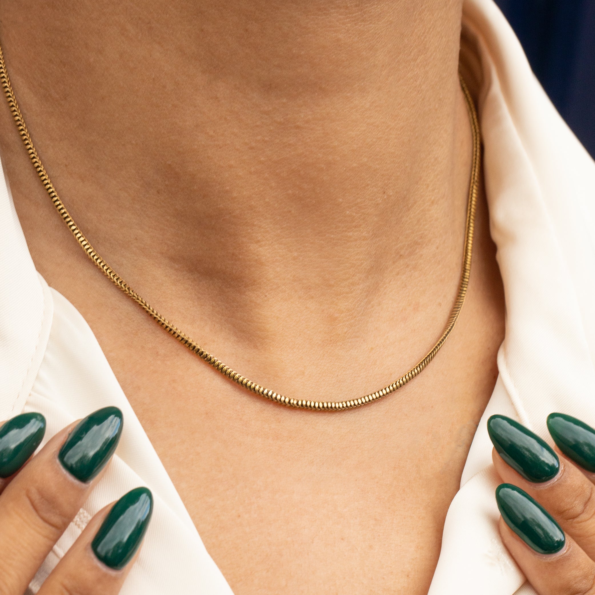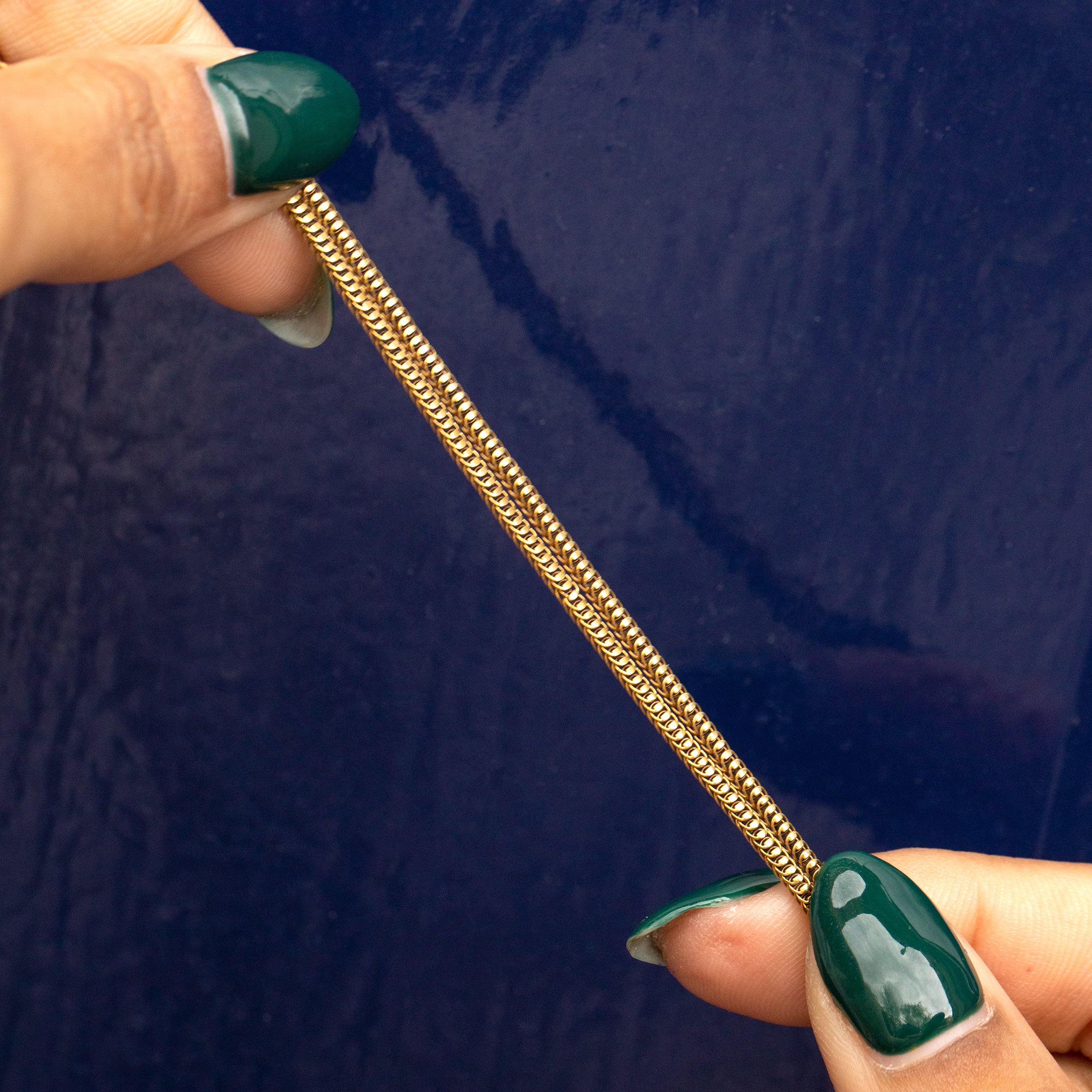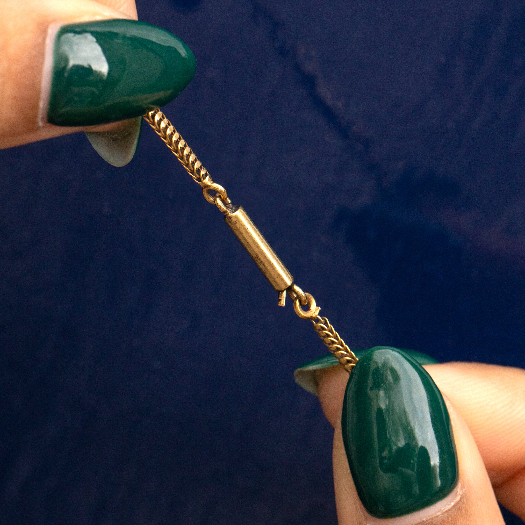 This 15" antique 15ct Gold snake chain is a wonderful piece to have in your antique jewellery collection. Measuring at 15", the fluid links will shape themselves to the contours of your collarbones, draping elegantly across your décolletage.