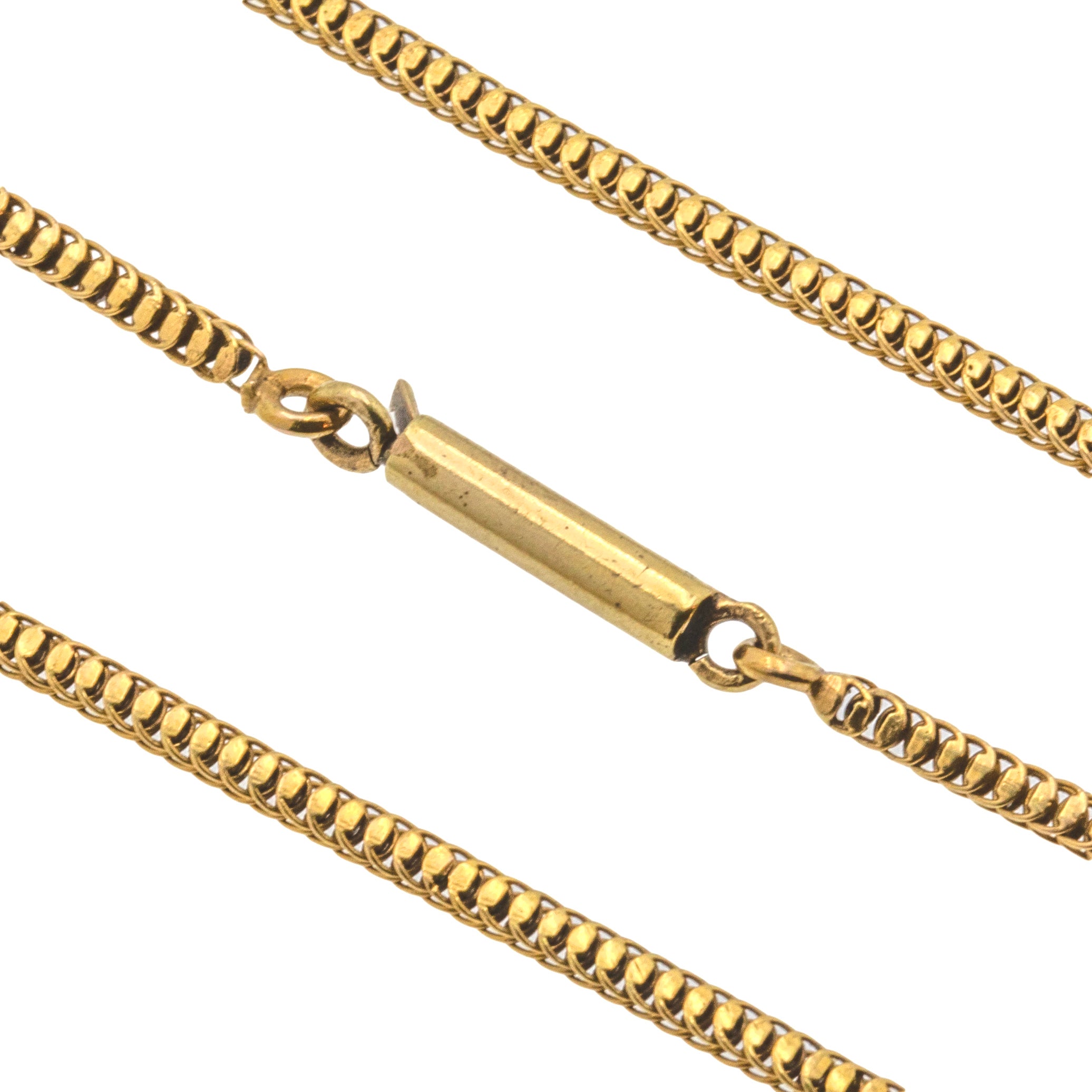 VERY GOOD. This 15" antique 15ct Gold snake chain is offered in very good condition. The chain is perfectly thick and round, giving this piece plenty of weight and a substantial feel. The 15ct Gold is buttery with only some minor age-related surface wear throughout. The antique barrel clasp is in perfect working condition allowing you to wear this Victorian Gold snake chain confidently.
