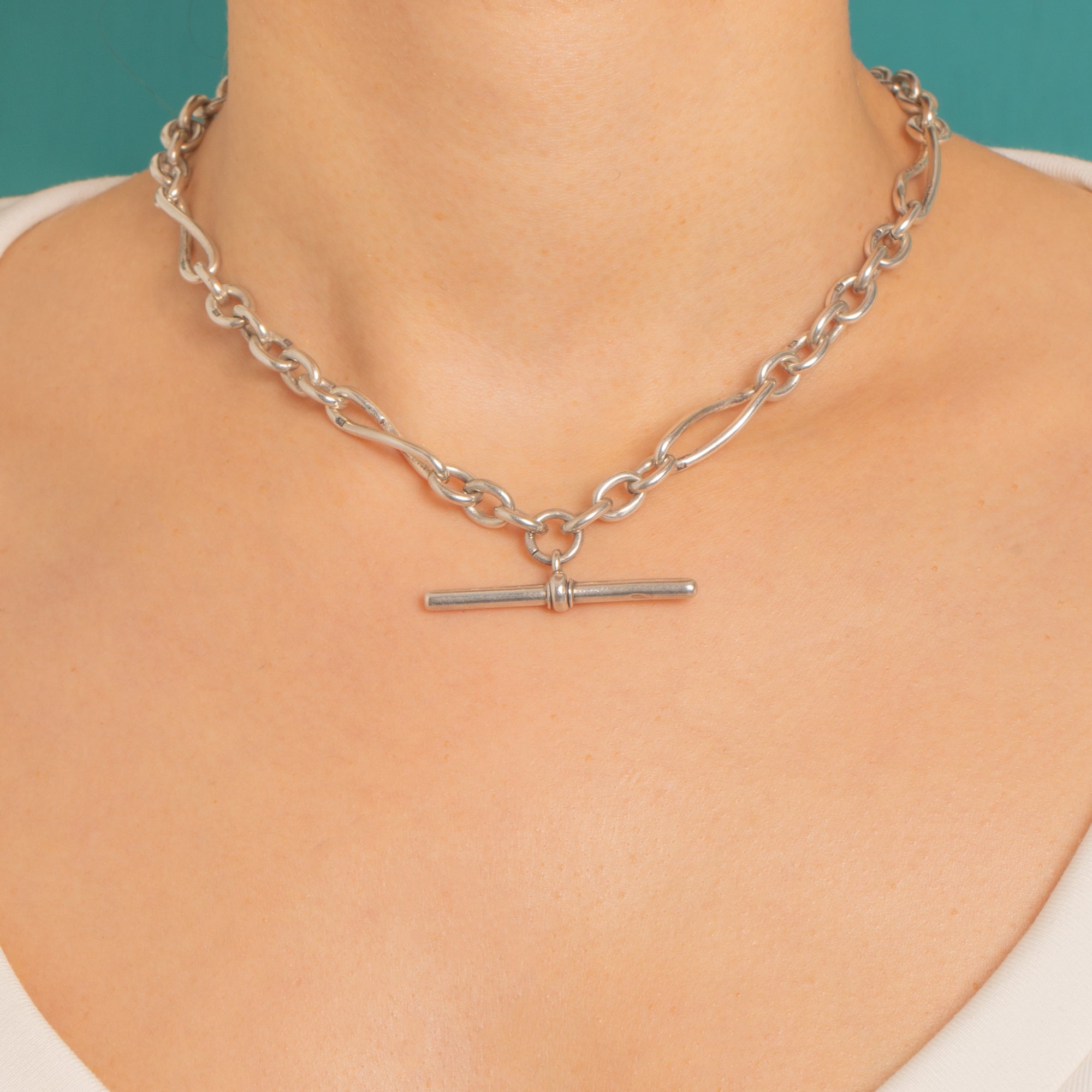 Every link is stamped with the Lion Passant and the date letter U for 1894, a wonderful testament to quality and authenticity. Dress it with the T-bar worn front and centre, or style it with the dog-clip suspending a charm or pendant—this versatile 15" chain delivers effortless Victorian elegance in a sleek, wearable silhouette.