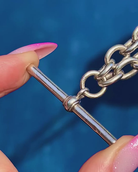 VERY GOOD-EXCELLENT: Silver surfaces are bright with some age-related wear, subtle dings, and a gentle antique patina. Links are secure, and the dog clip and T-bar fasten smoothly. No repairs observed, indicating the piece has been well cared for.