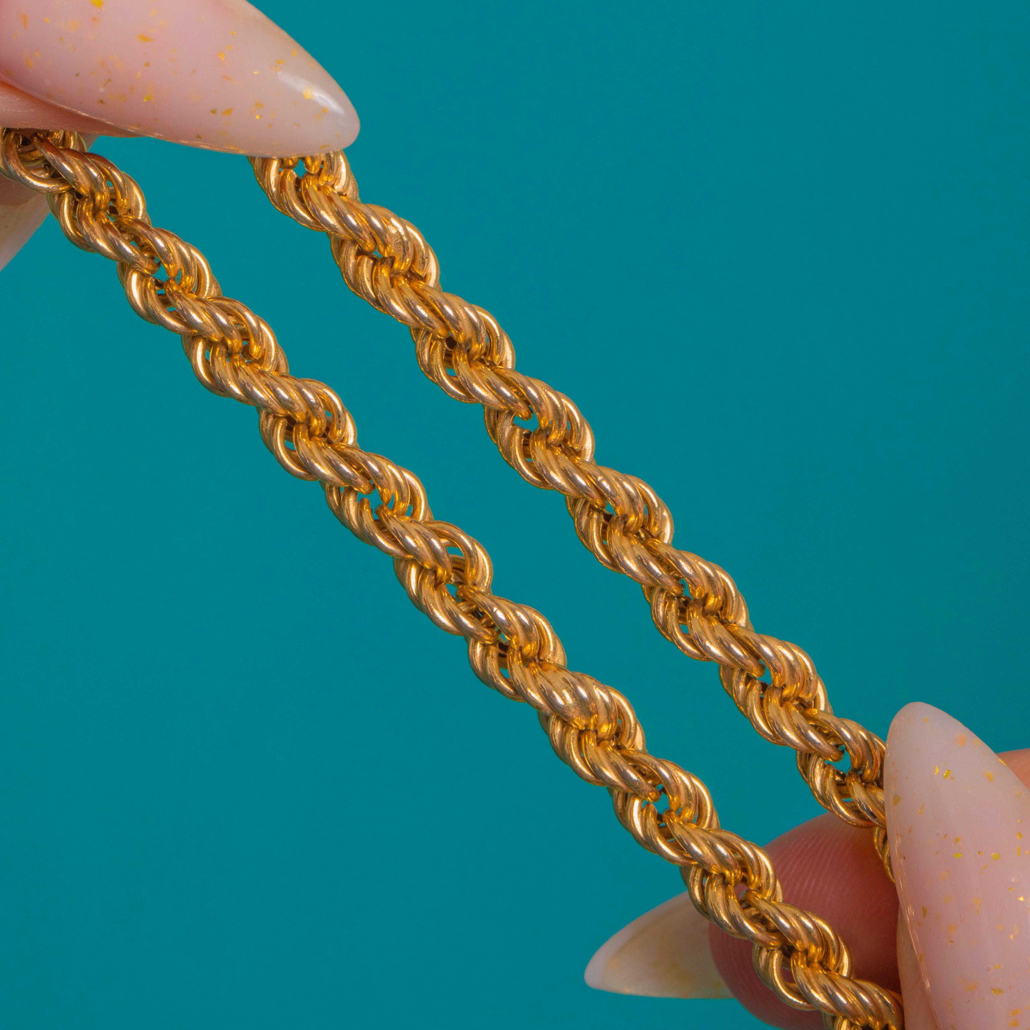 EXCELLENT: Bright high-polish finish with only the lightest surface wear seen under close inspection. The rope links are even, intact and securely soldered throughout, and the bolt-ring clasp is in good working order. Well cared for with no visible repairs or distortions.