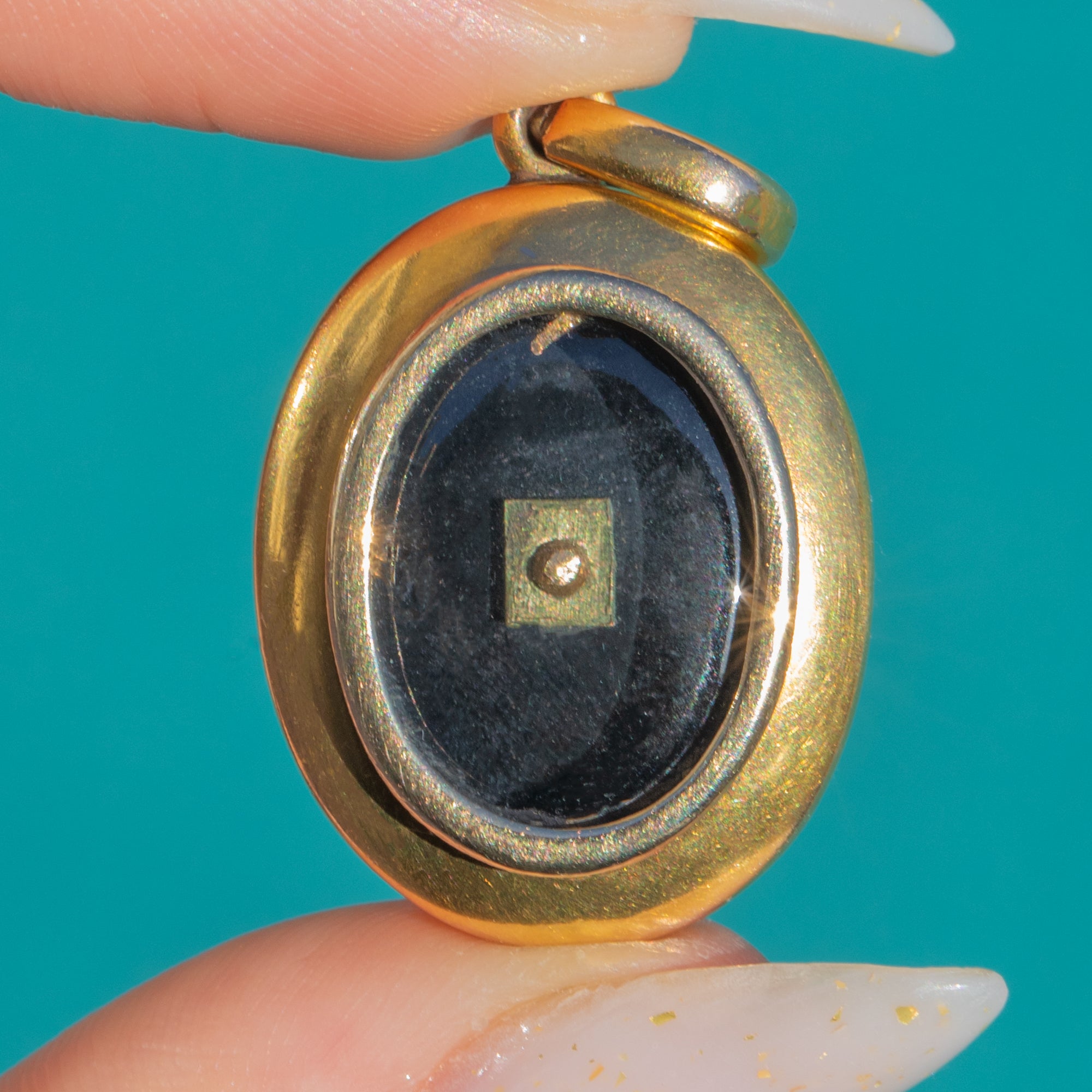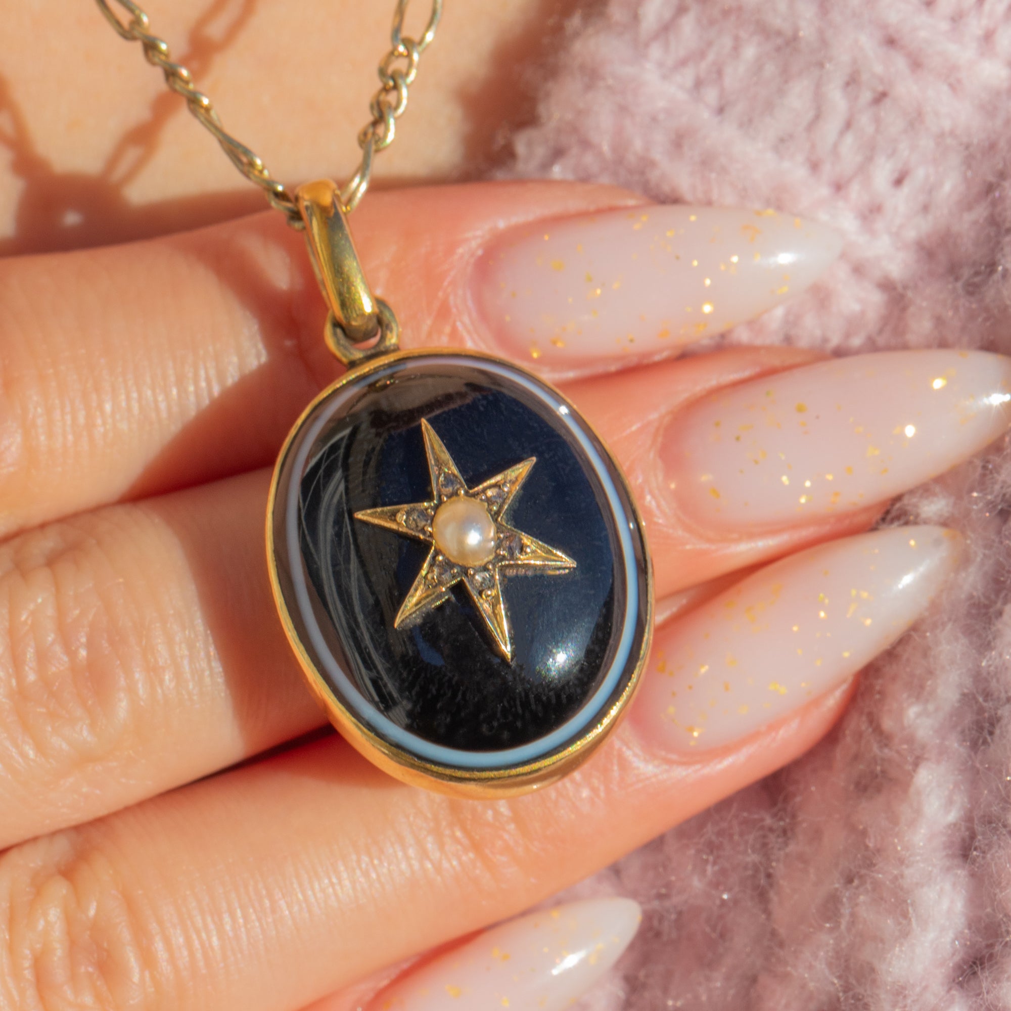 A celestial Victorian treasure in buttery 15ct Gold, this oval pendant pairs an inky black Agate with a domed glazed locket back. At its heart sits a luminous Pearl with twinkling Diamond highlights, the high-contrast palette giving that refined, keepsake allure we adore from the era.