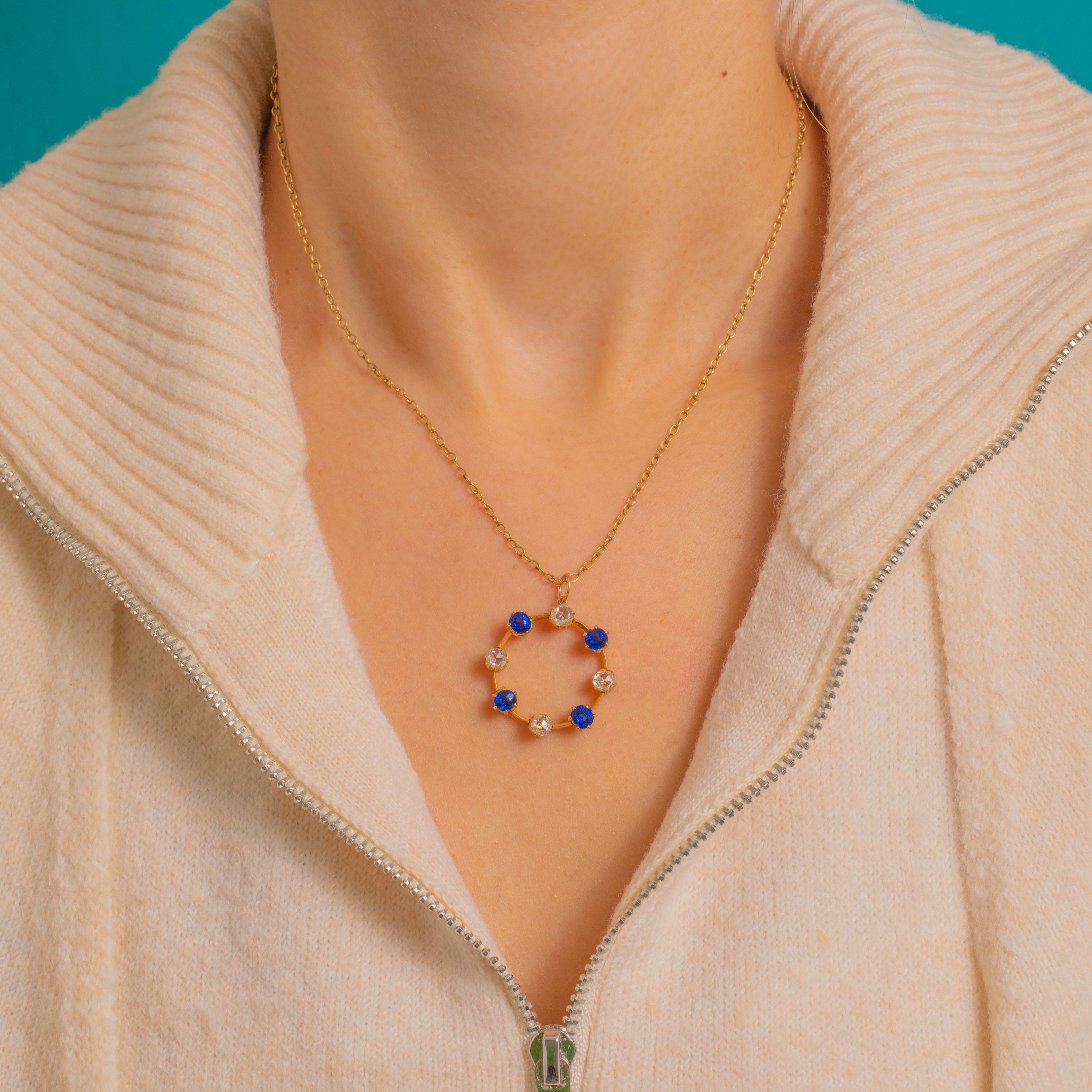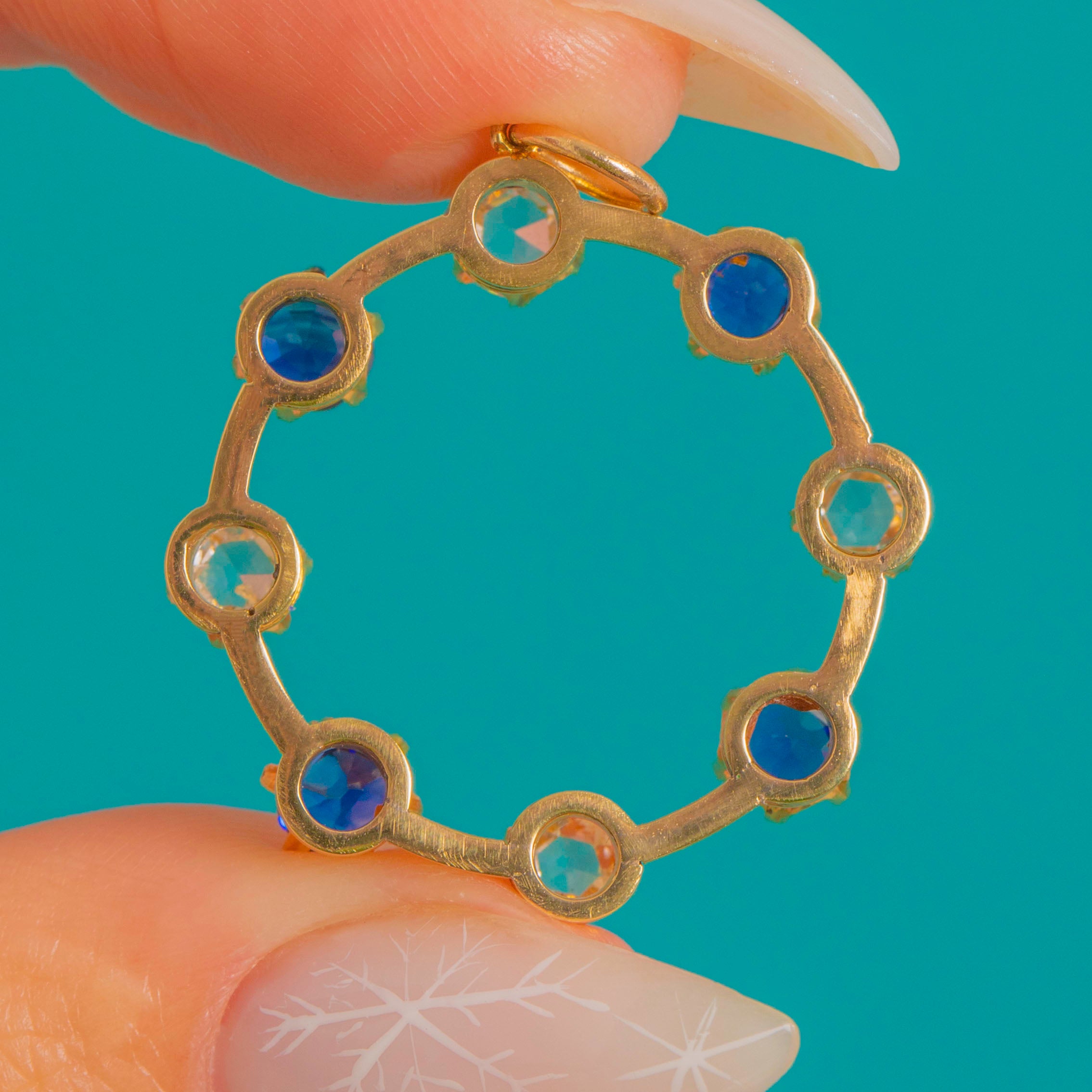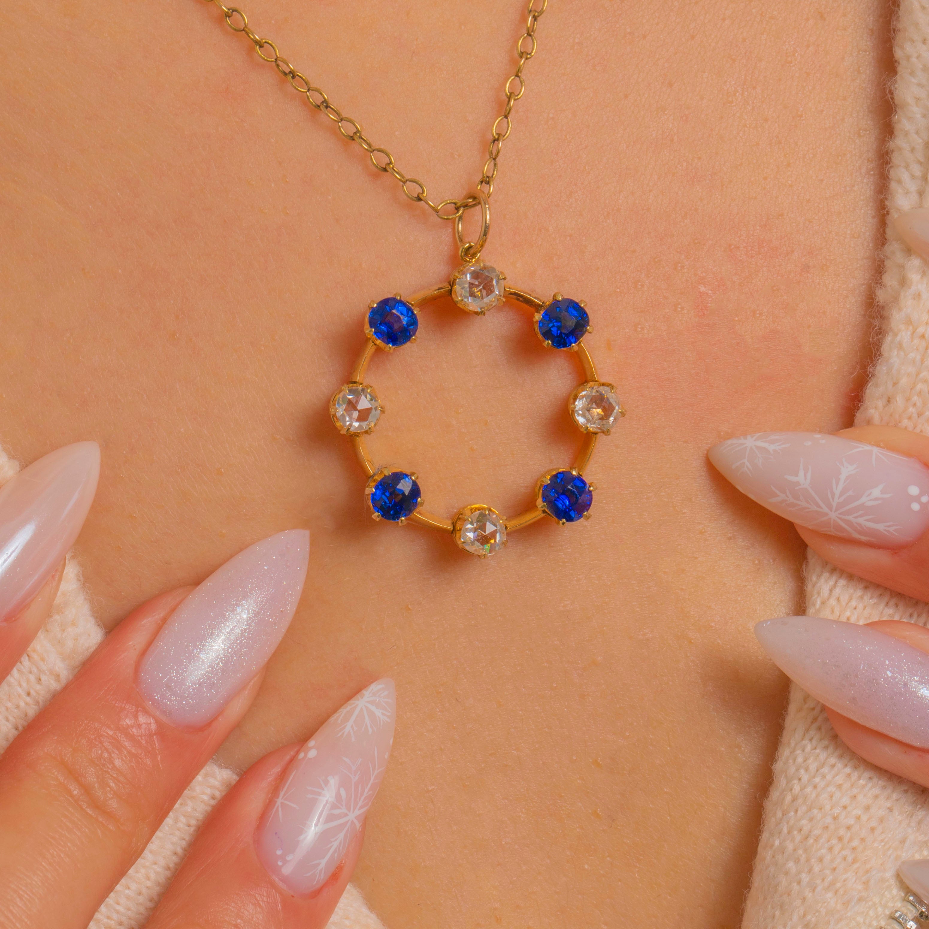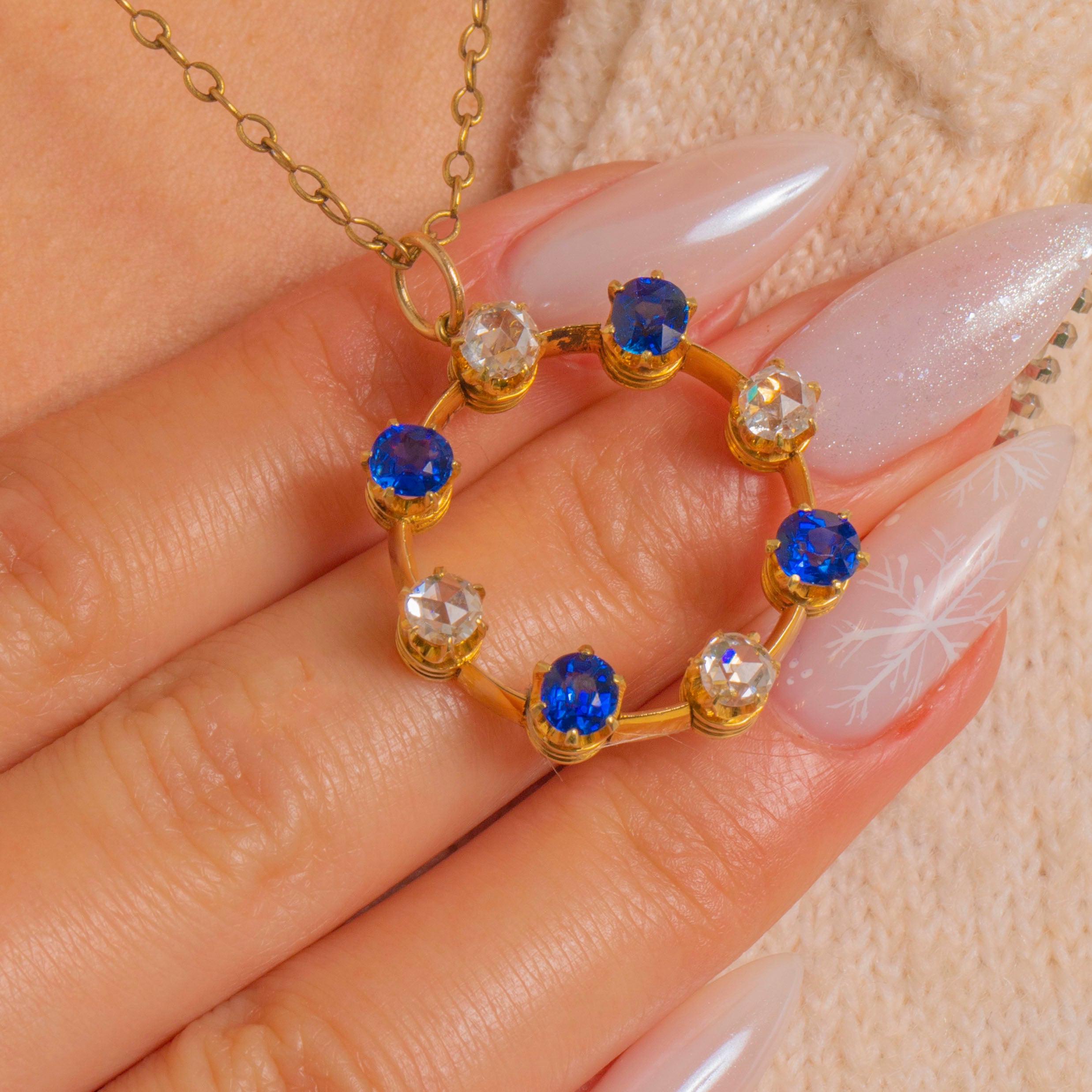A beautiful Victorian roundel pendant in rich 15ct Gold. Eight old‑style round facets alternate around the circle, with bright, lively Diamonds playing against vivid royal blue stones for a timeless, ribbon‑like sparkle. The stones sit in airy open‑back coronet settings applied to a slender hoop, lending elegant lightness and that coveted antique finesse.