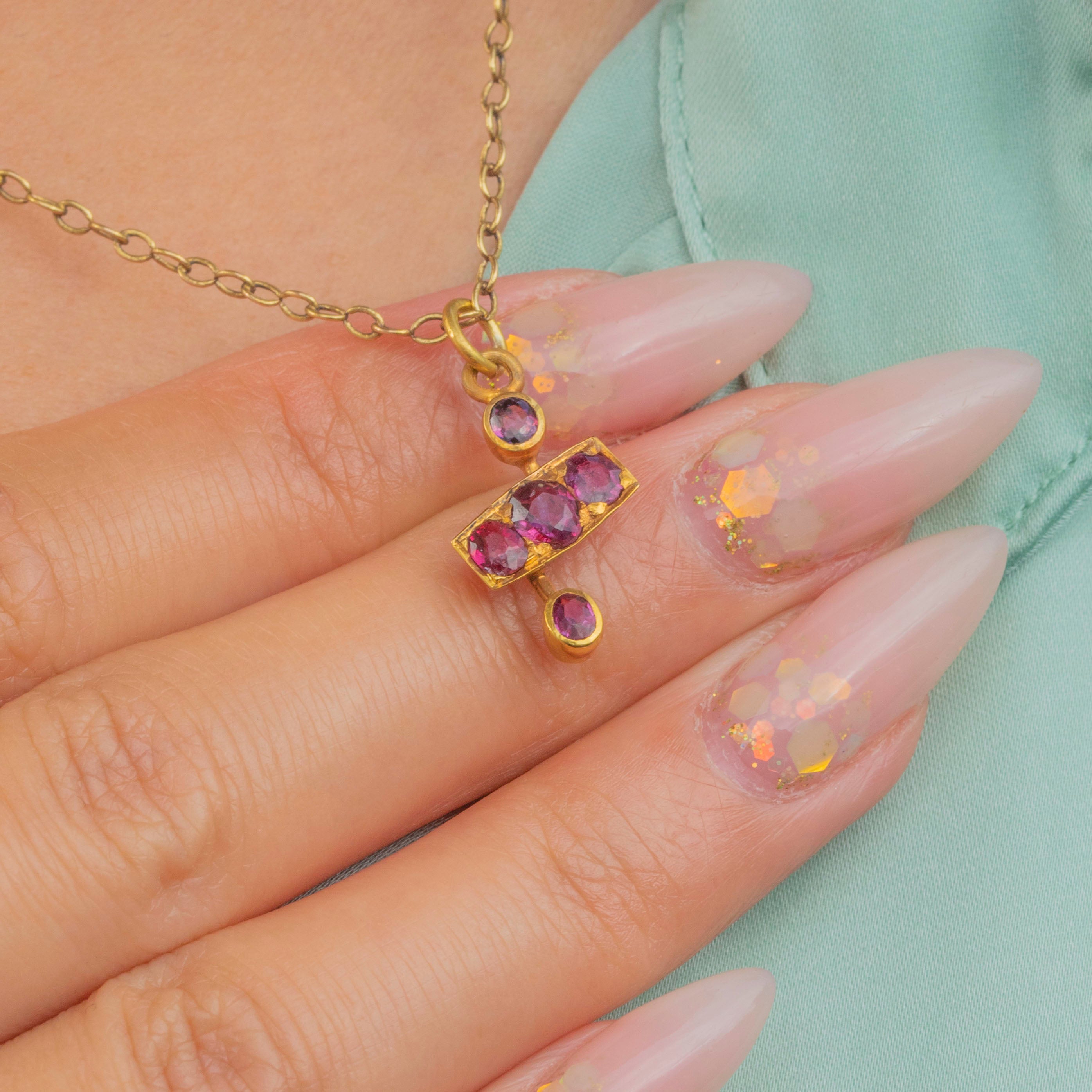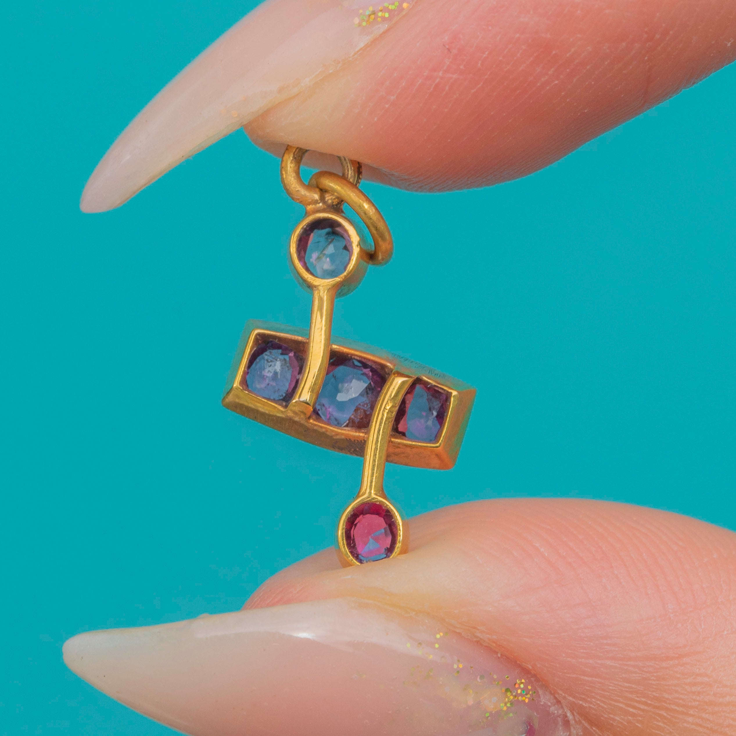 A dainty late-Victorian charm set with glowing raspberry-hued Garnets in warm 15ct Gold. The design features a trio of Garnets set in a slim rectangular panel, accented by single collet-set Garnets above and below for a graceful, elongated silhouette. Lovely on a fine Gold chain or added to a curated charm stack.