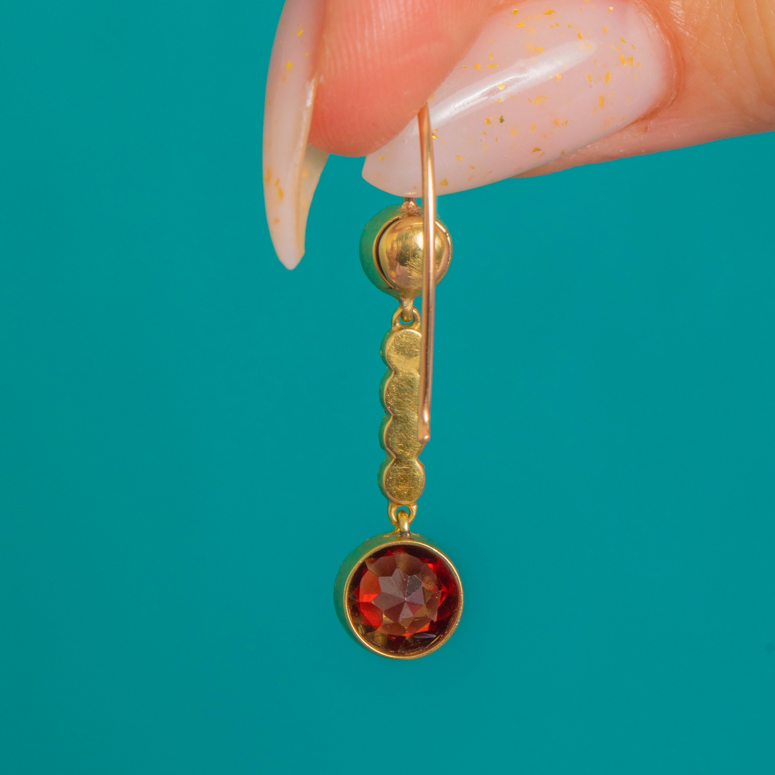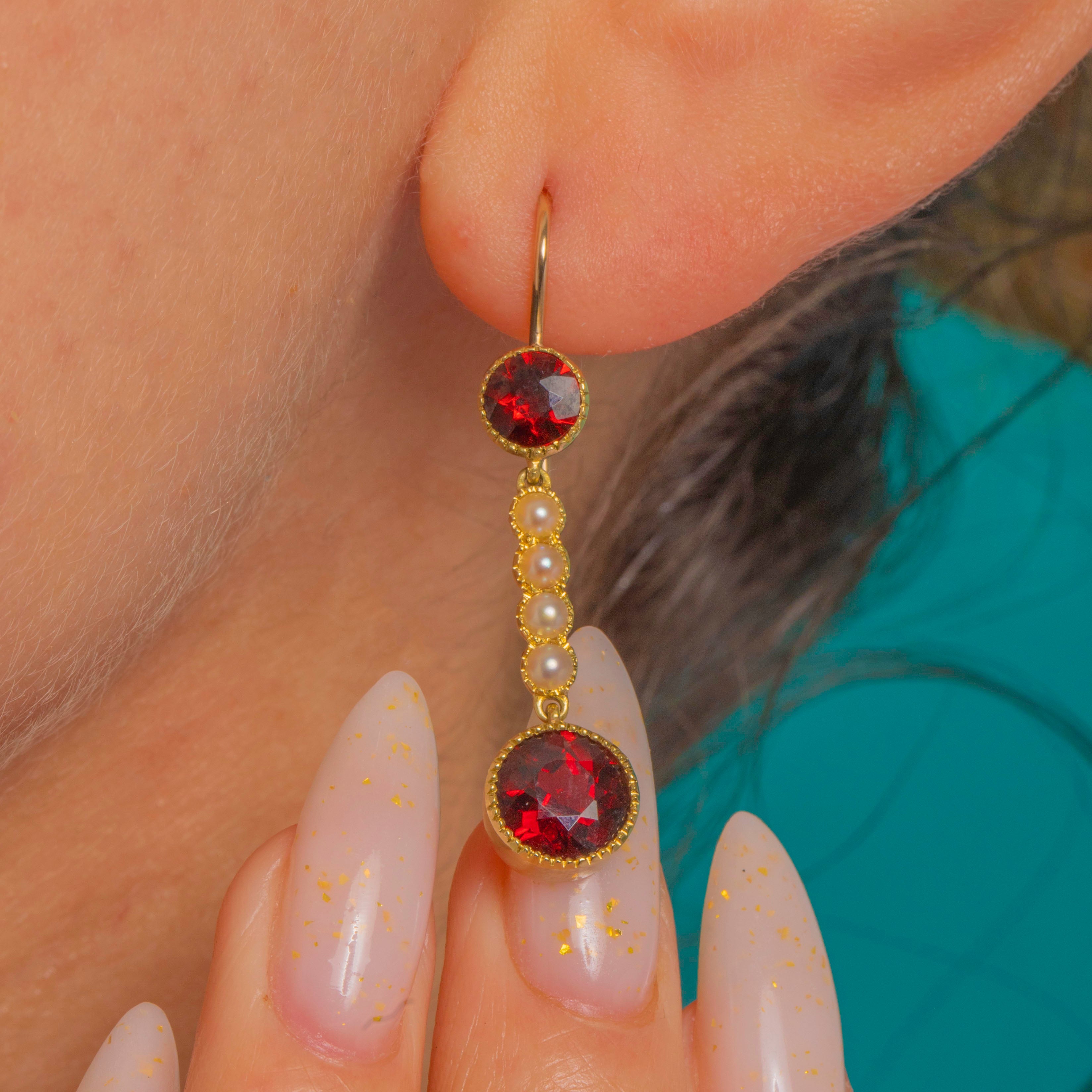 A graceful Victorian pair of articulated drop earrings, crafted in rich 15ct Gold and set with deep red round Garnets punctuated by a slender vertical line of creamy Seed Pearls. The design is beautifully balanced: a petite Garnet sits above the seed Pearl bar, leading the eye to a larger Garnet below, each stone framed by fine beaded, milgrain-edged collet settings that add delicate texture and antique charm.
