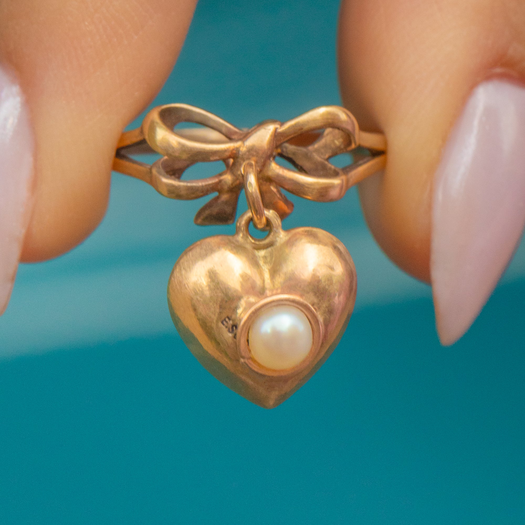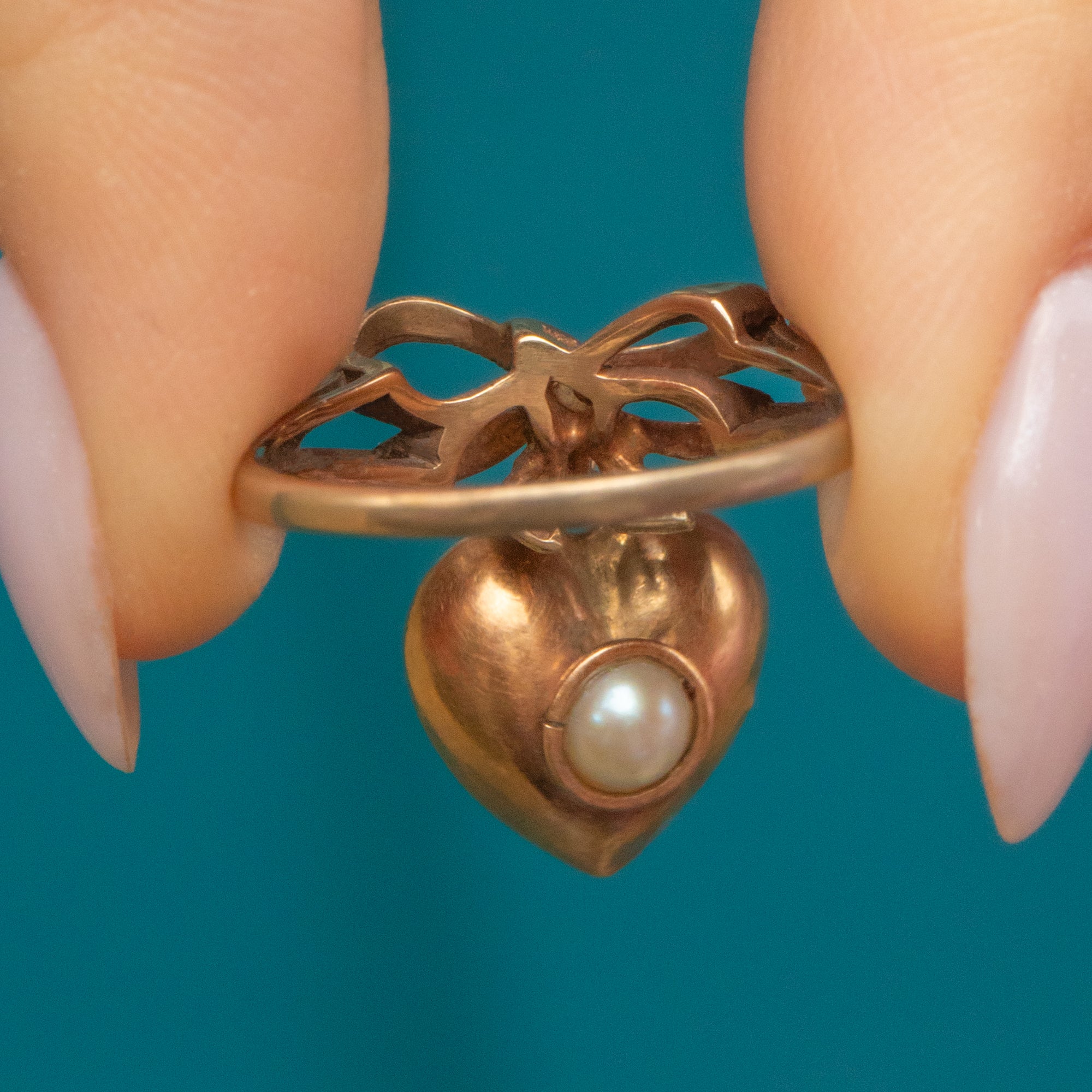 This 15ct Gold ring, complete with a Pearl heart charm, is exquisite! Truly unique, her vintage features are romantic and charming, with a supple Pearl poised at the center adding a touch of decadence.
