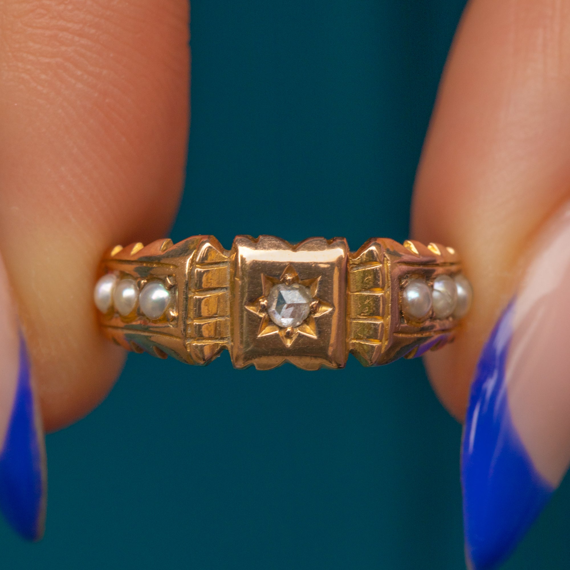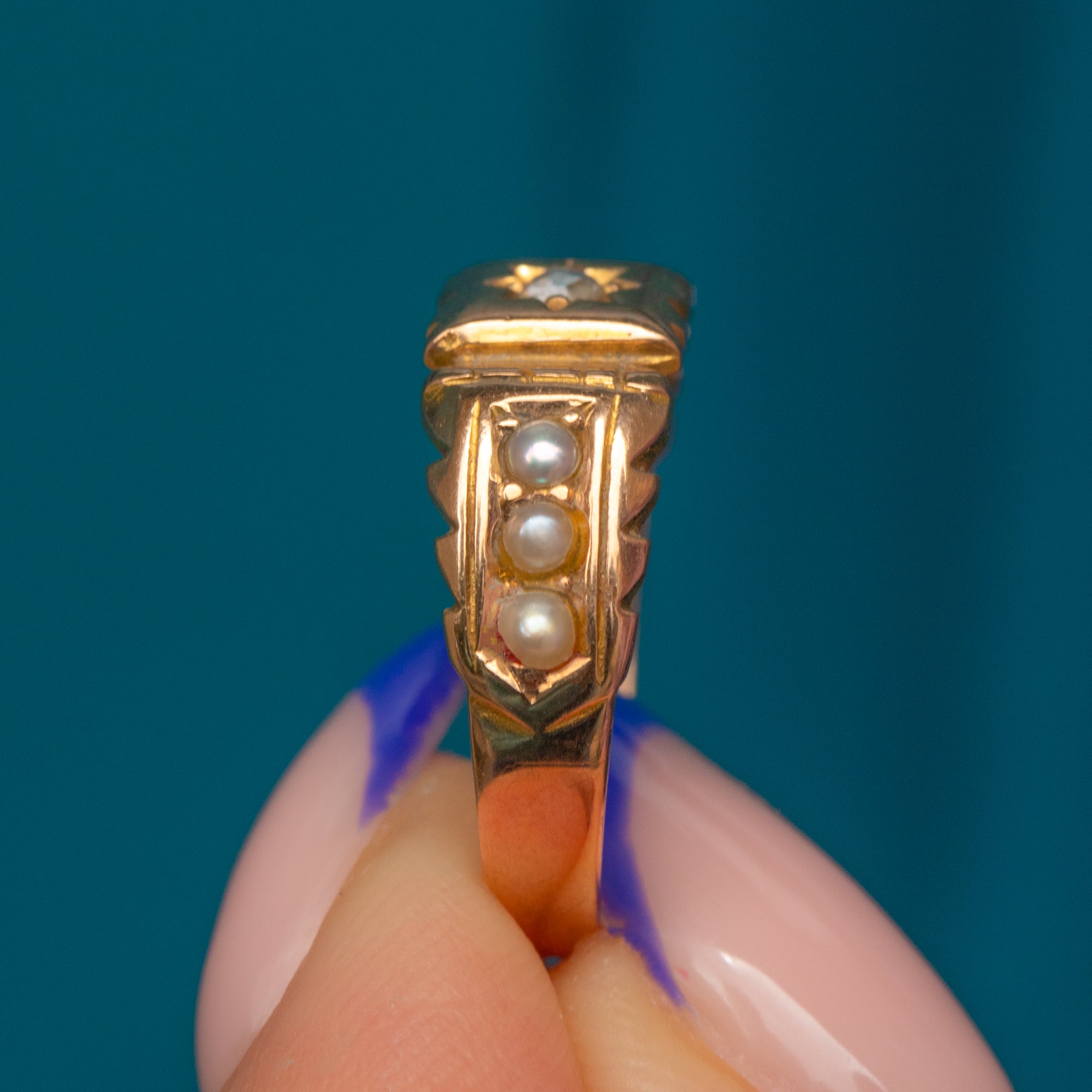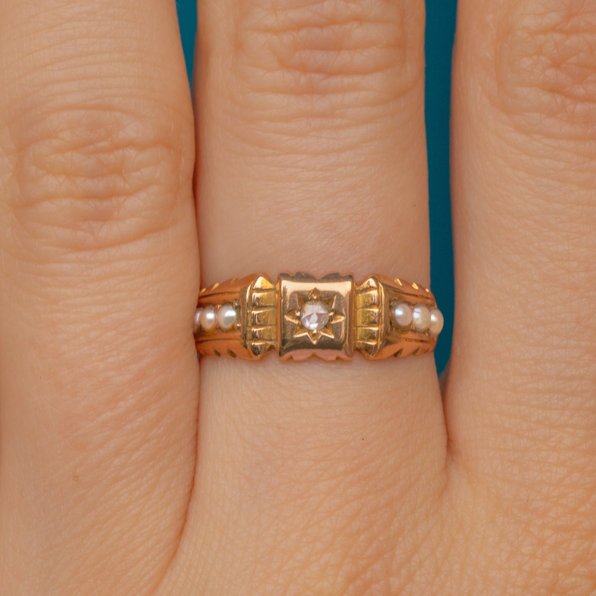 15ct Gold Rose-Cut Diamond Pearl Gypsy Ring, c.1894