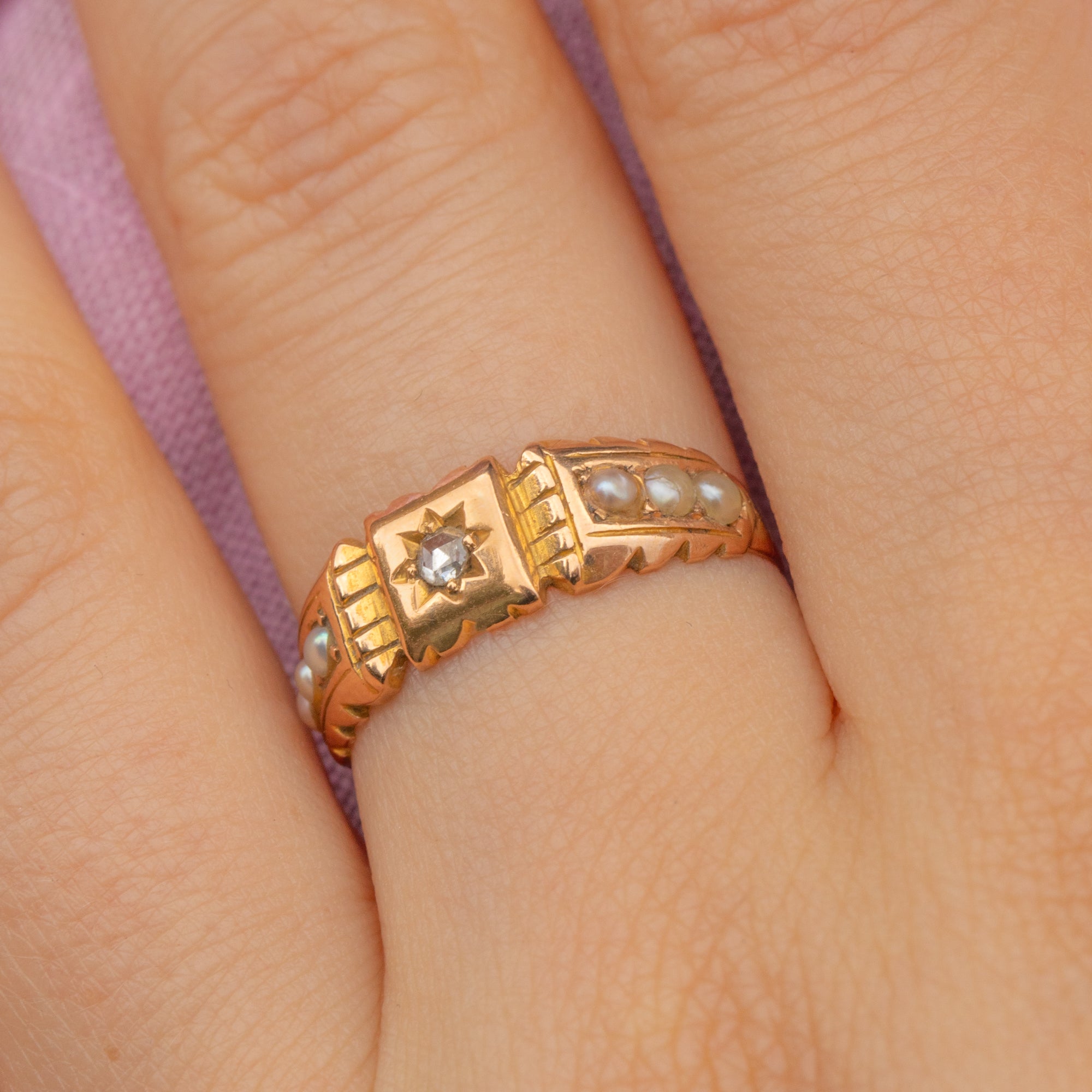 VERY GOOD. This 15ct Gold Rose-Cut Diamond Pearl gypsy ring is in very good condition. The Gold is buttery and the details have remained defined. There are some visible solder join marks on either shoulder and the back of the band, but these are only visible under close inspection and do not impact the integrity of the ring. The gemstones are all secure within their settings and free from any wear. With a full set of hallmarks on the inside of the band, this Victorian ring is a highly collectible piece and will make a fine heirloom!