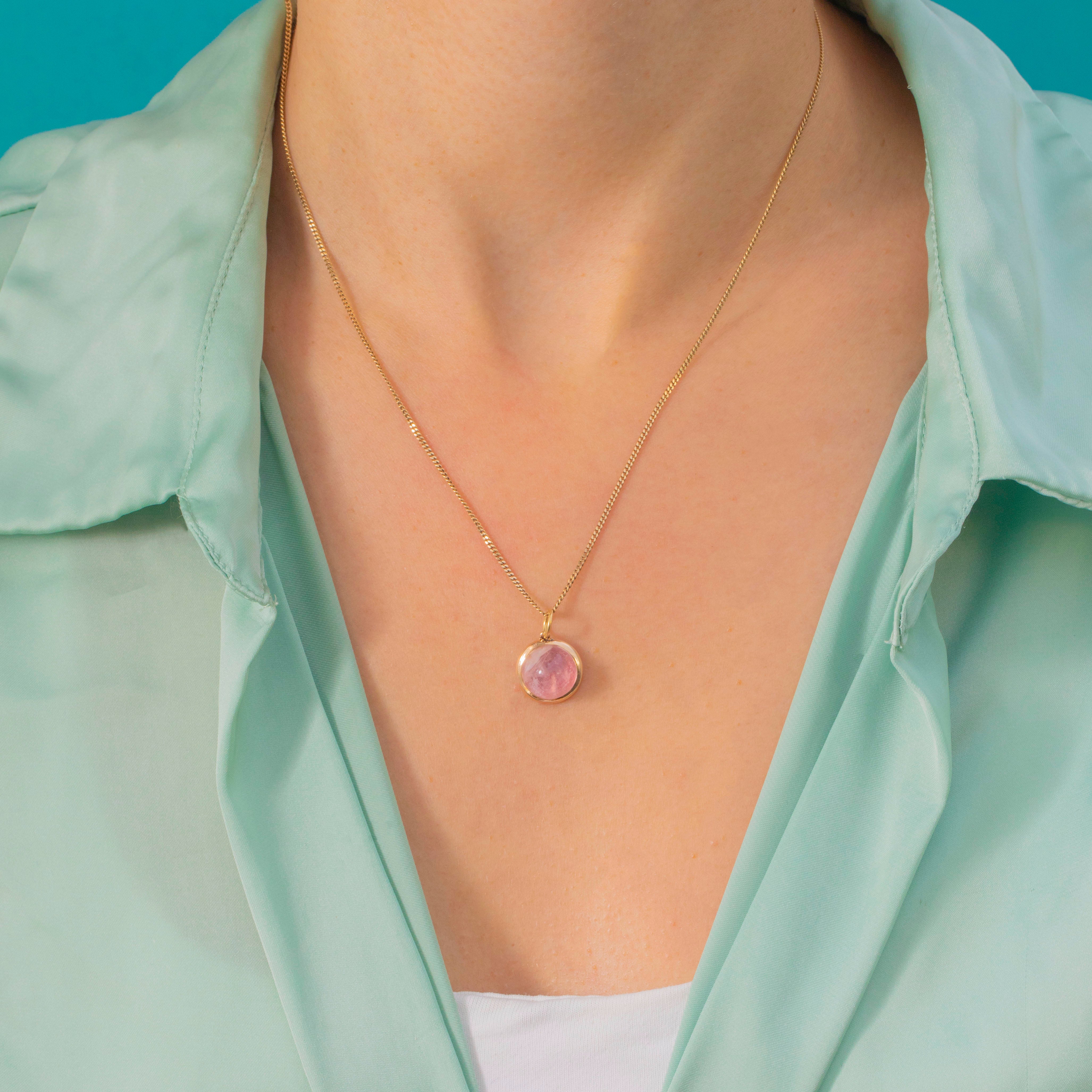 EXCELLENT: The Rose Quartz cabochon is glossy and smooth with no chips or cracks, displaying beautiful natural internal inclusions. The 15ct Gold bezel is clean and attractive, and the jump-ring bale is soldered securely. Minimal light wear consistent with careful preservation.