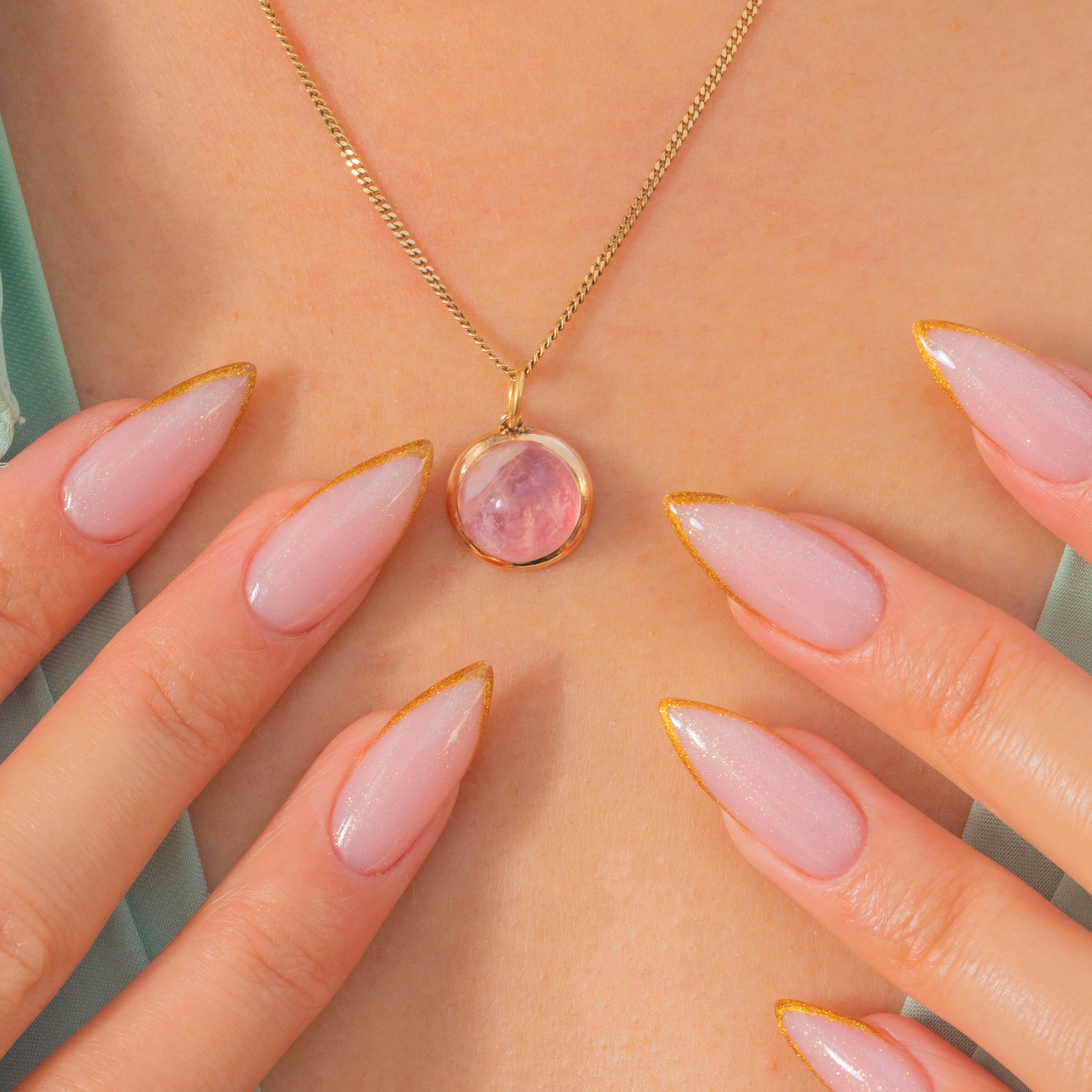 A soft blush Rose Quartz sugarloaf cabochon glows serenely within a smooth 15ct Gold bezel, creating a quietly luxurious Art Deco charm you’ll reach for every day. The gem’s delicate translucency and natural internal inclusions lend an ethereal light, while the minimalist silhouette keeps the look timeless and refined.