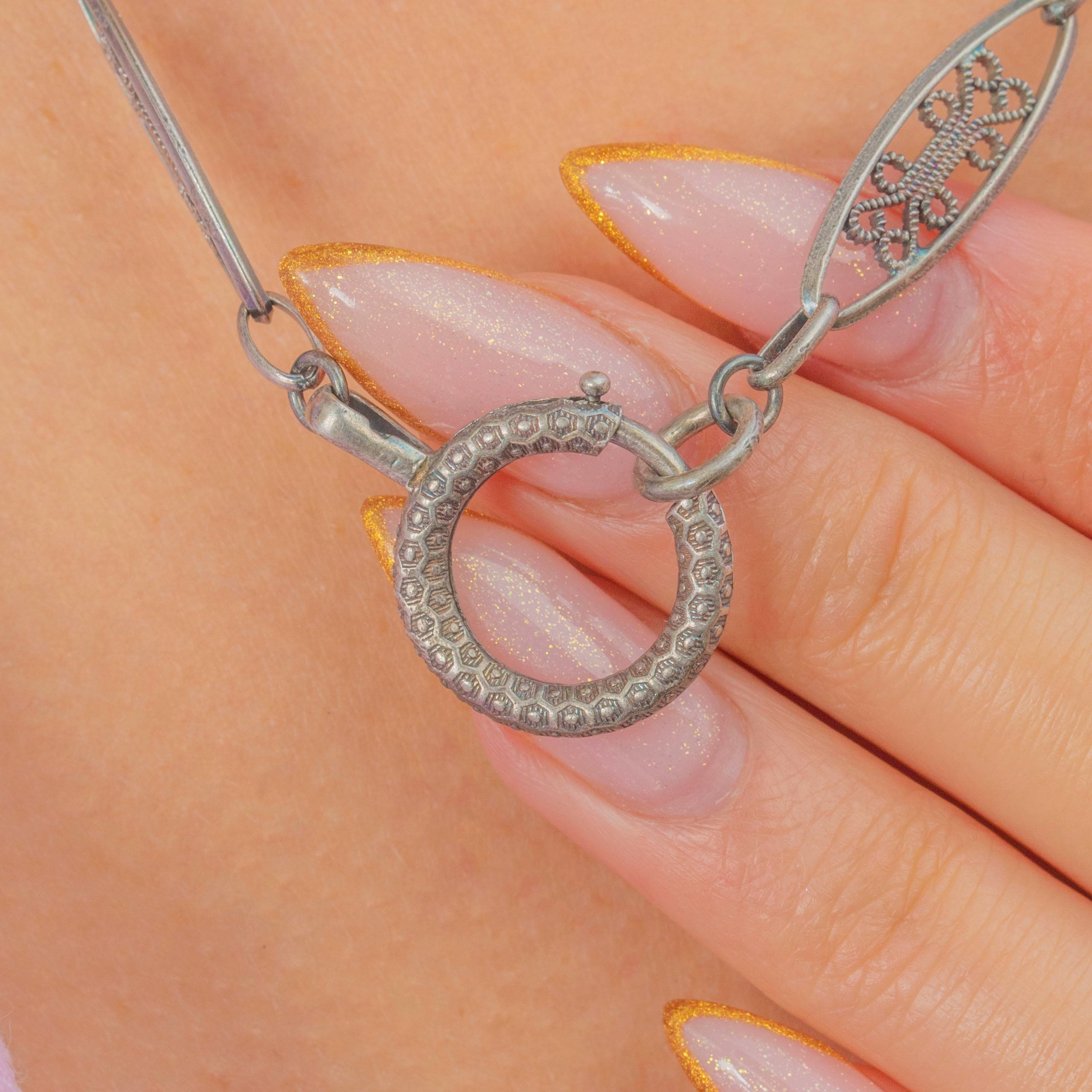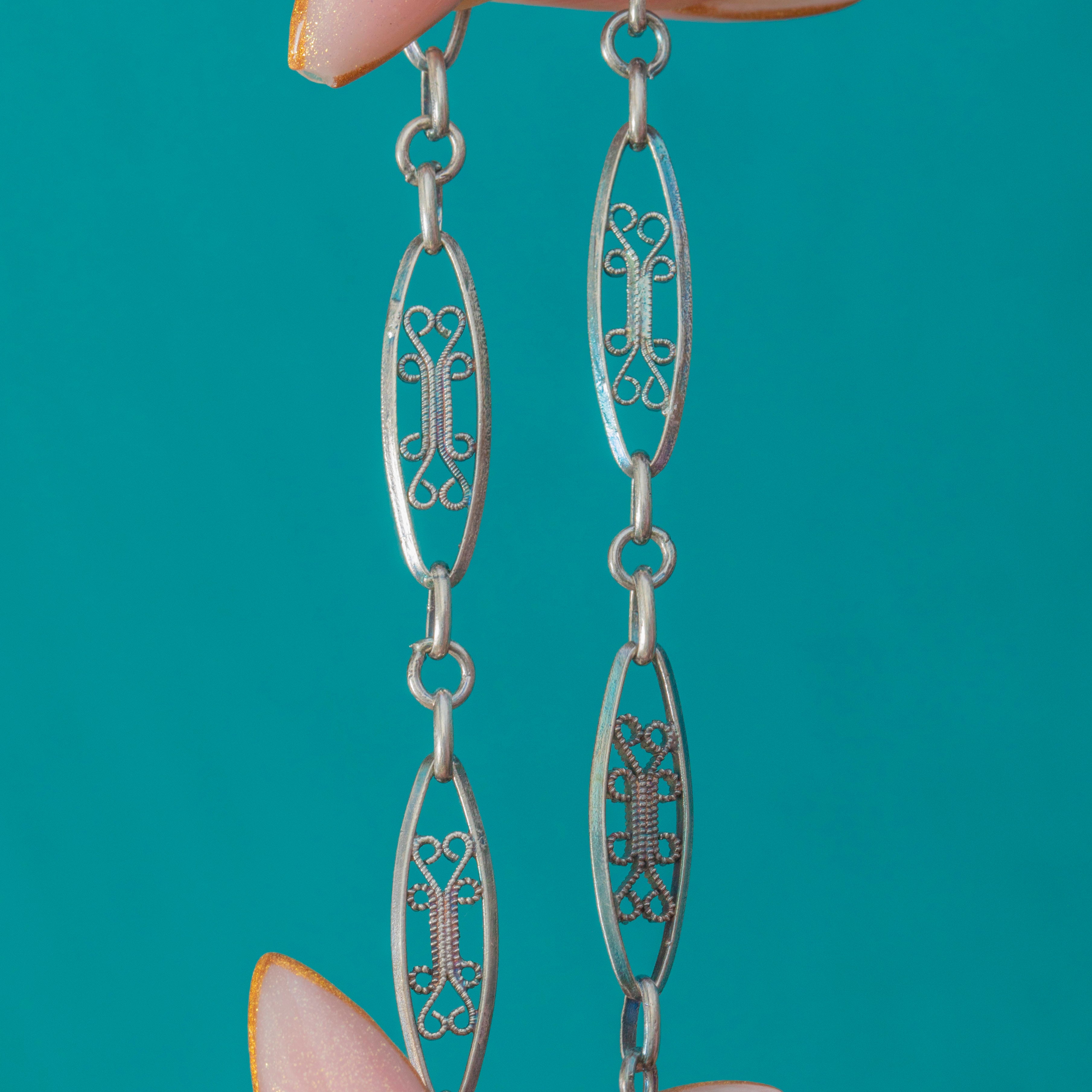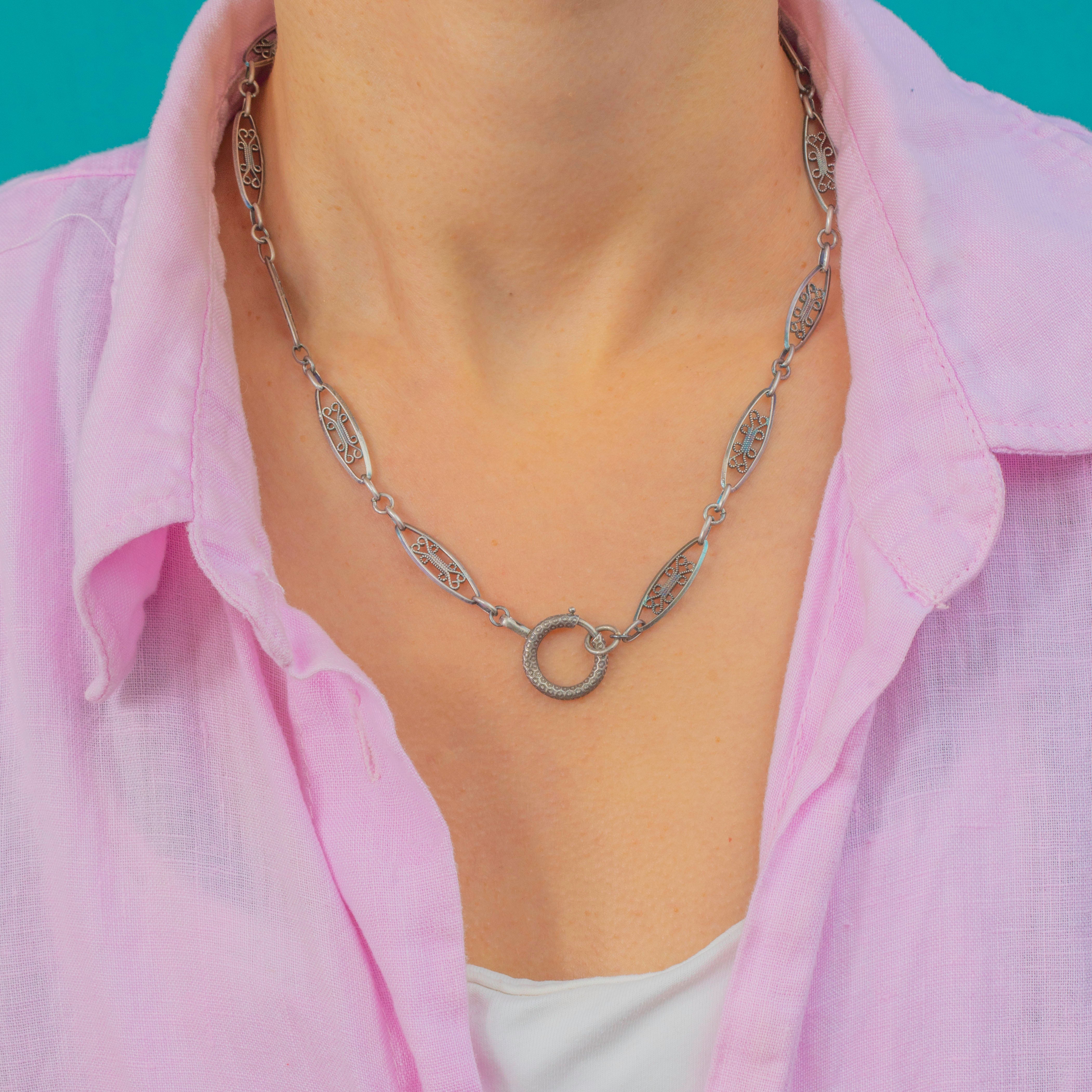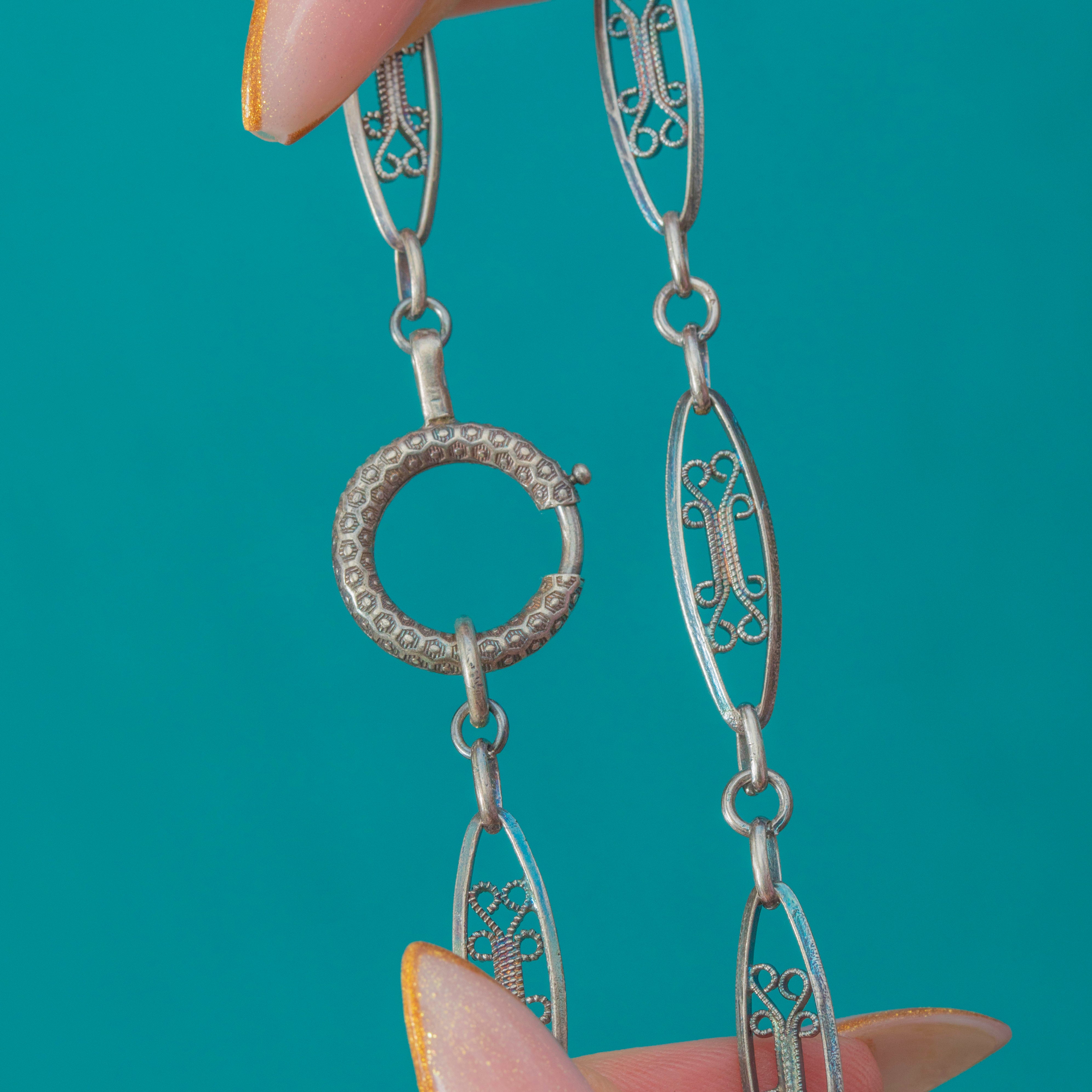 This Victorian French Silver filigree chain is beautifully crafted, showcasing intricate openwork links and a substantial antique bolt-ring clasp. The elongated filigree links give the chain an elegant, airy look while still feeling wonderfully decorative and wearable.