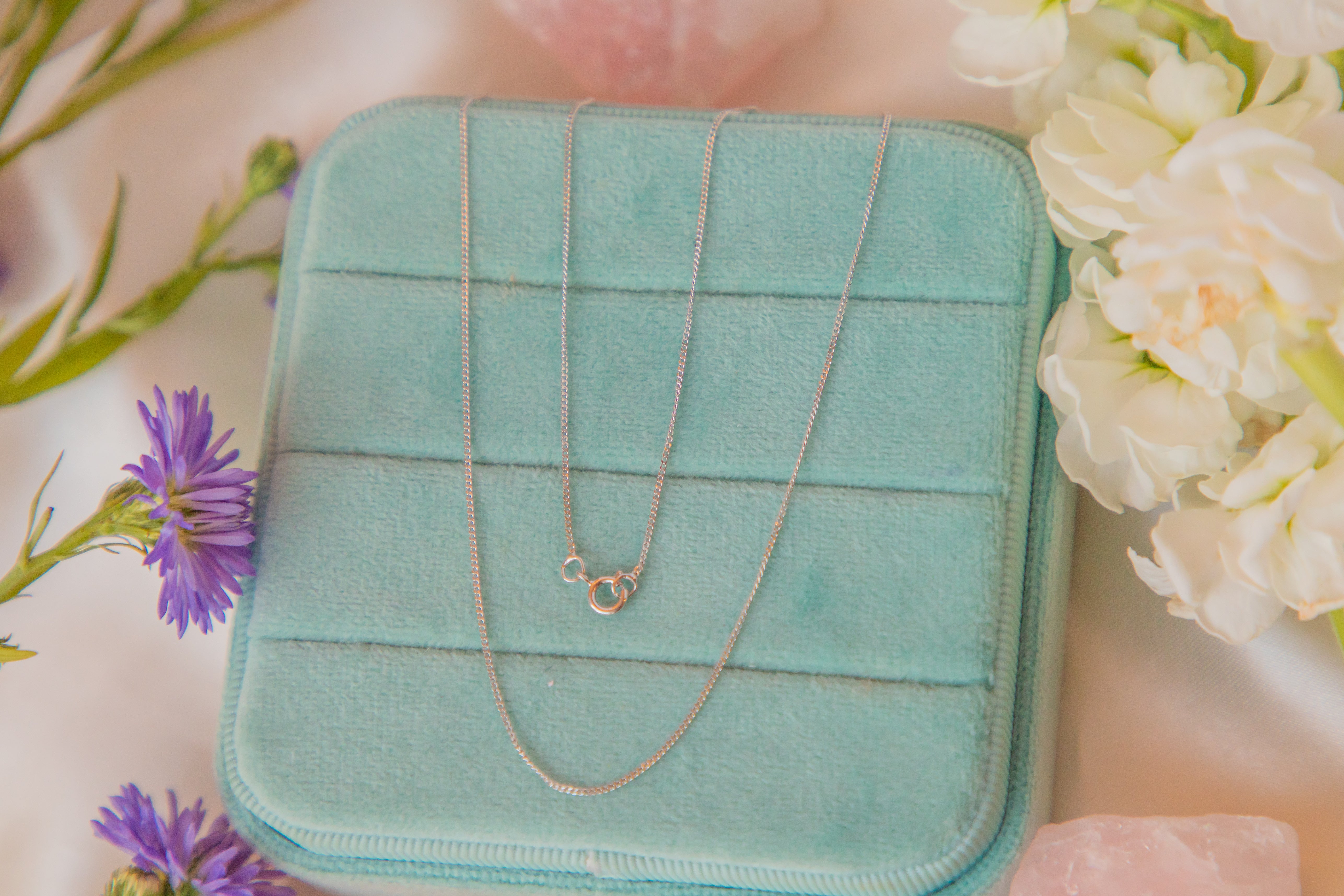 This is a gorgeous 9ct White Gold skinny curb chain! This lovely piece has a bright finish and will accompany one of your antique charms perfectly.