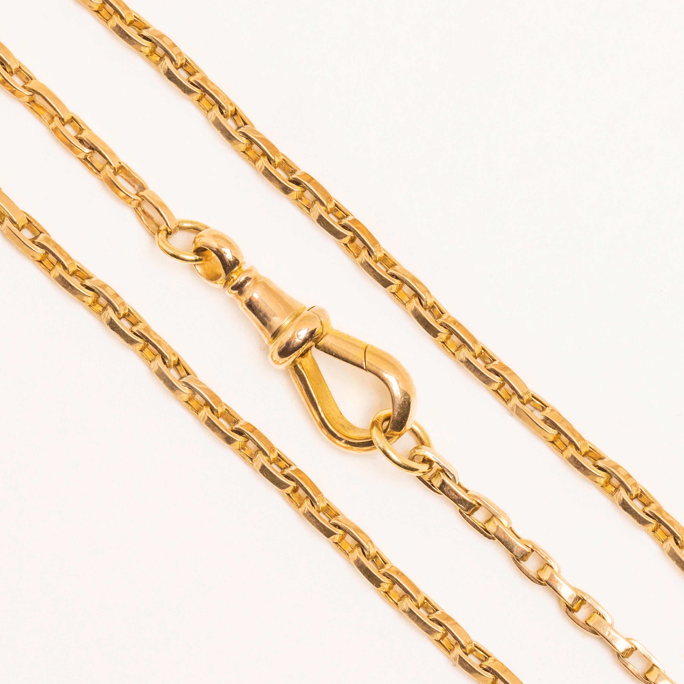 EXCELLENT. This 16" antique 9ct Gold belcher chain is in excellent condition, with nothing to report! The links are buttery and smooth and the dog-clip clasp / charm-holder functions perfectly. She's robust and a lovely period feature to admire.