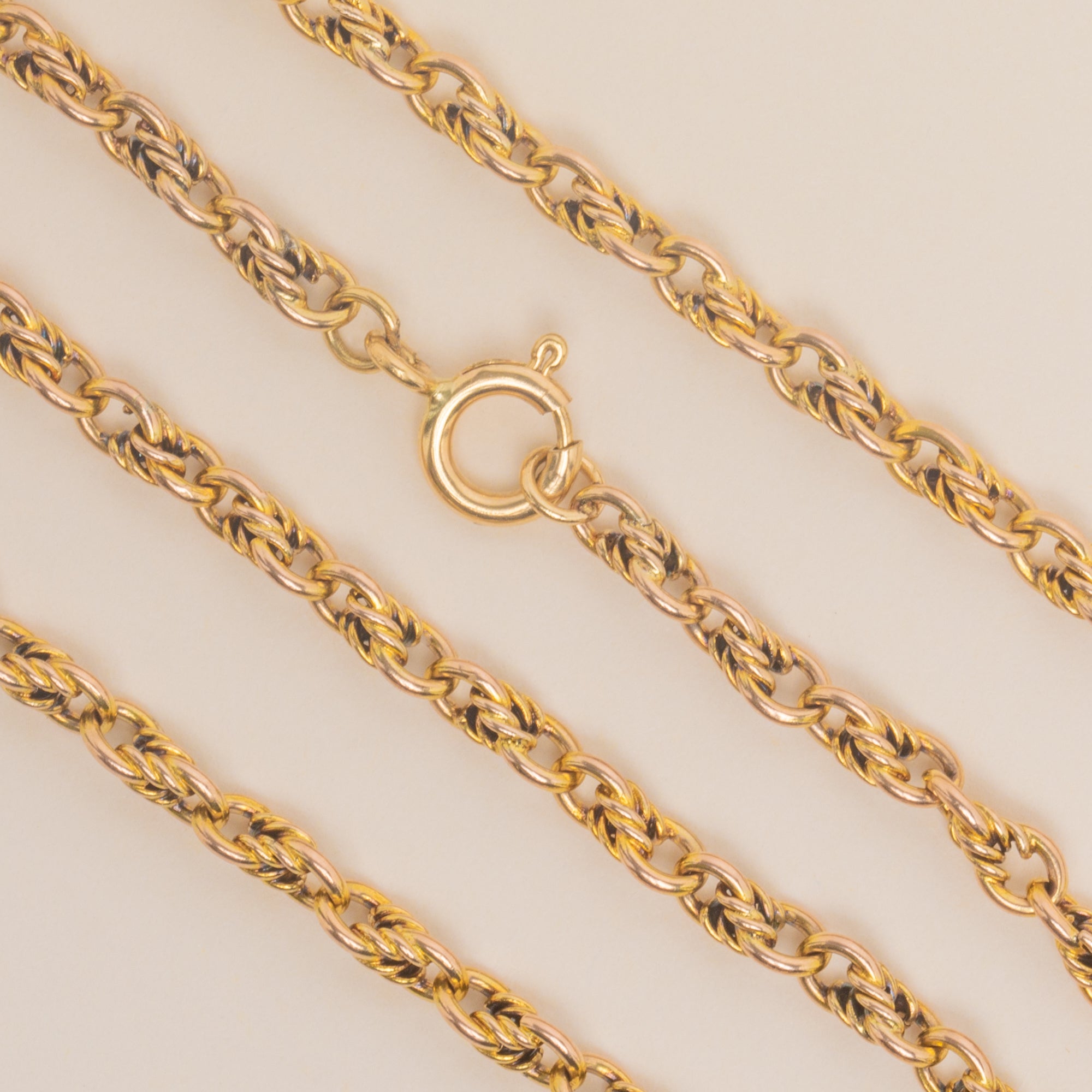 EXCELLENT. We are pleased to present this 16" antique 9ct Gold lover's knot link chain in excellent condition! The links are all firmly connected and uniform, with no damage to note. The later added bolt-ring is in perfect working order, securely holding this Victorian Gold chain around your neck!