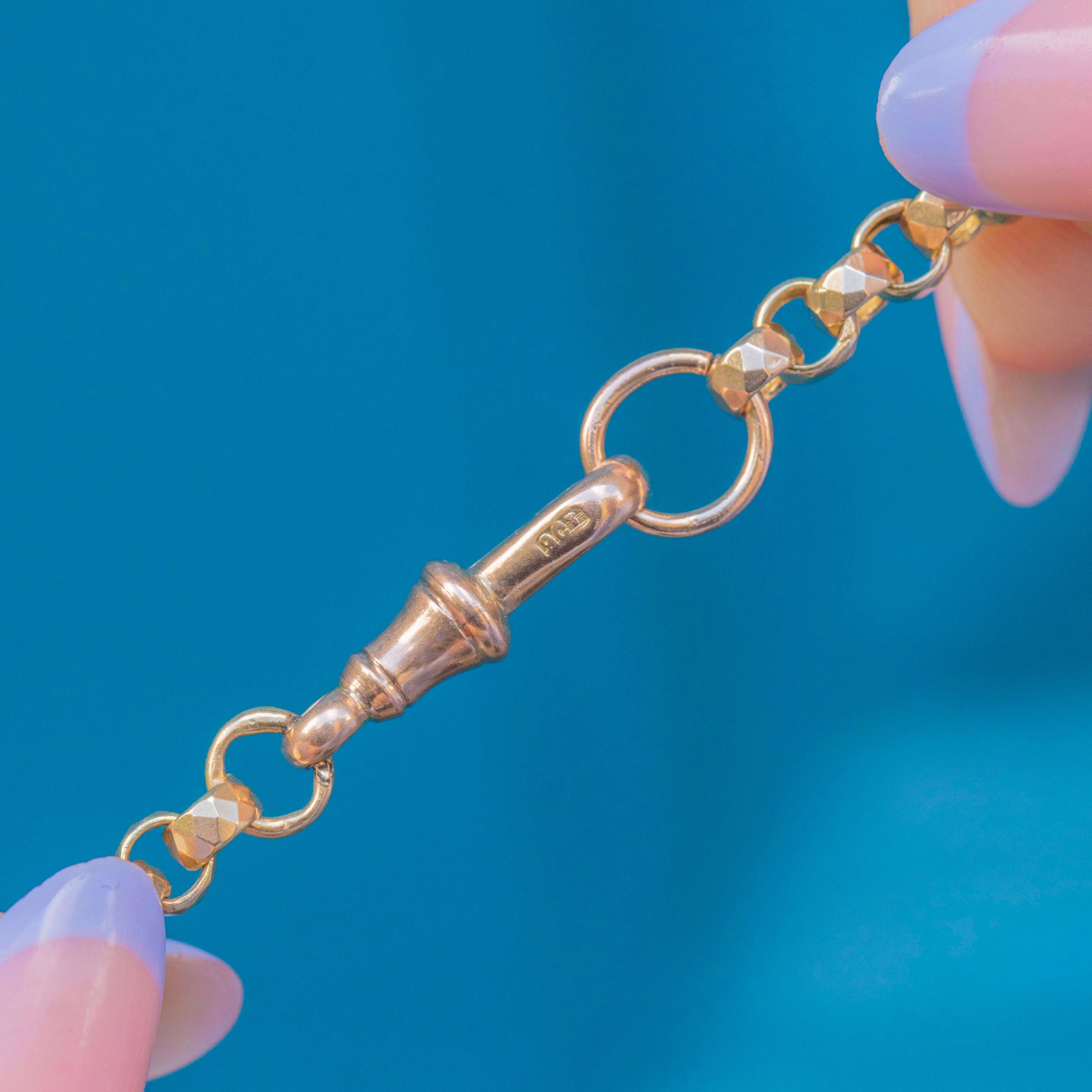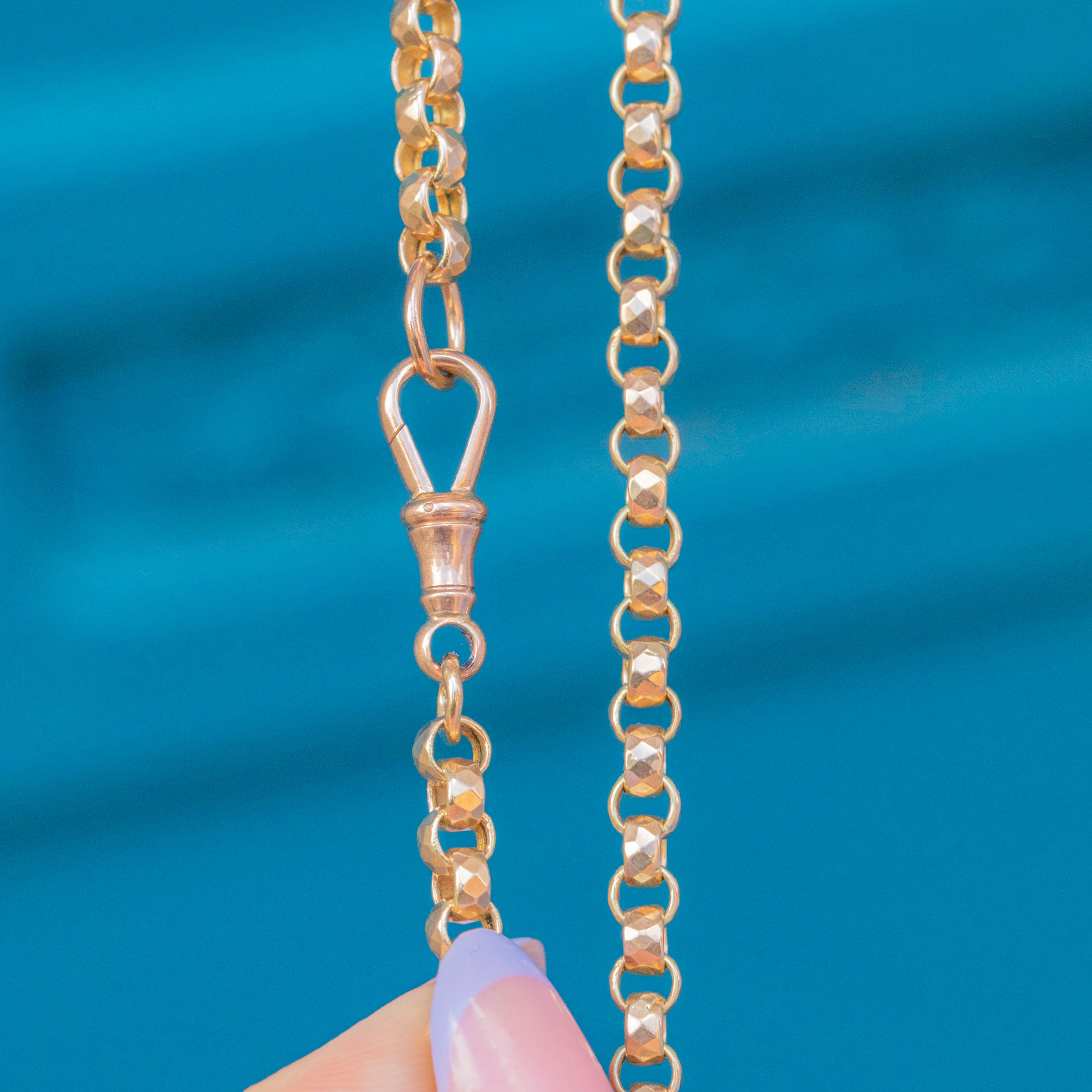 EXCELLENT: This antique chunky 9ct Gold faceted belcher chain is in impeccable condition throughout! The belcher link design lends itself to strength and durability, so you can be assured that this chain will last you for many more generations. The dog clip is a slightly rosier tone than the chain, but we think this adds extra charm!