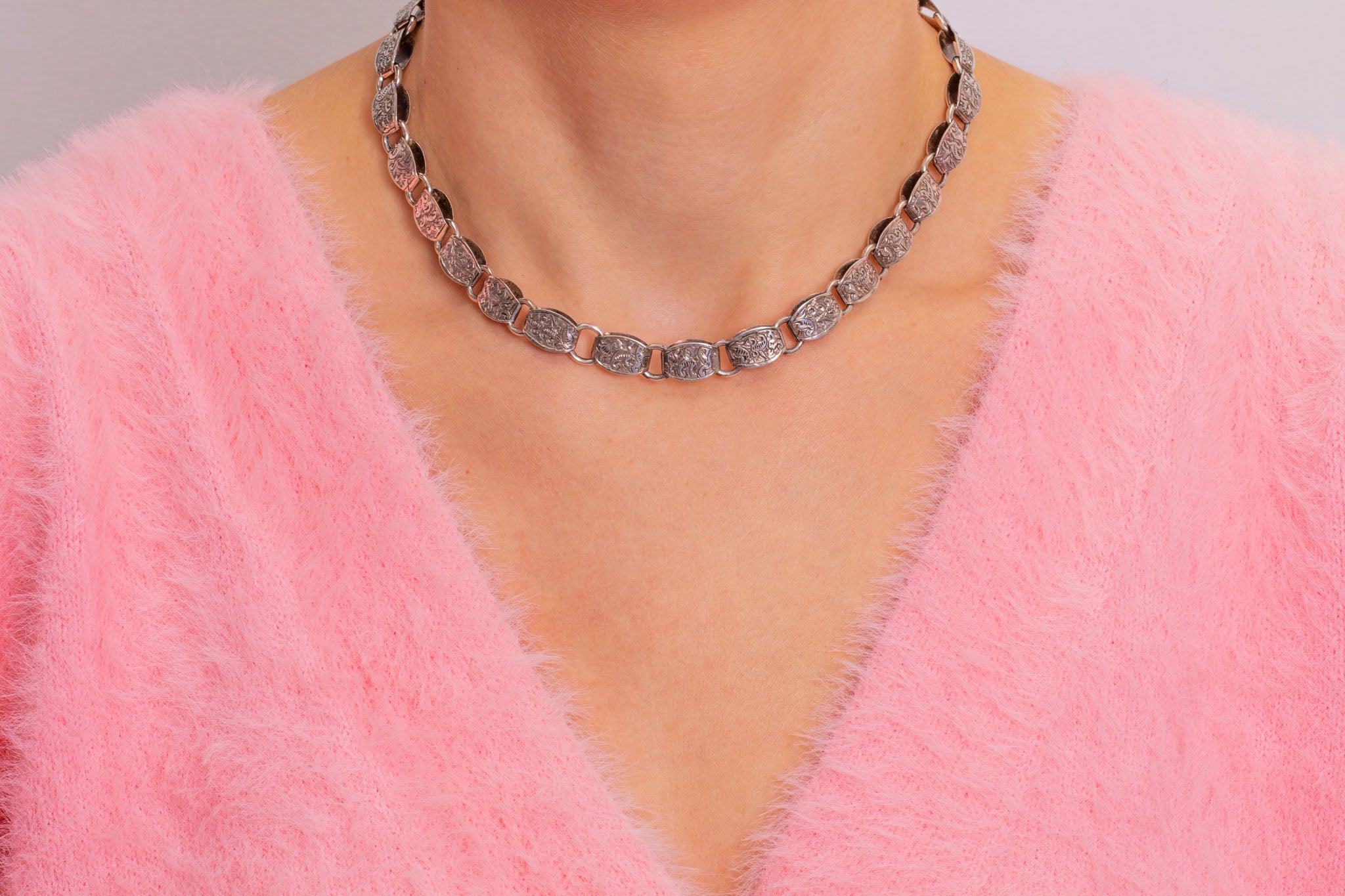 VERY GOOD. This 16" antique Silver engraved book chain necklace is in very good condition. The necklace has lovely flat links that will sit flush against the chest and the engravings are unique to each link, which have all been securely attached to the next. The chain has minimal surface wear, only some age spots on a few of the links. One of the links has been repaired throughout its lifespan, but given her age, this is hardly surprising and the job has been done well so you can cherish her for decades to come. The bolt ring closes securely allowing you to personalise this chain with a pendant or locket and wear her confidently!