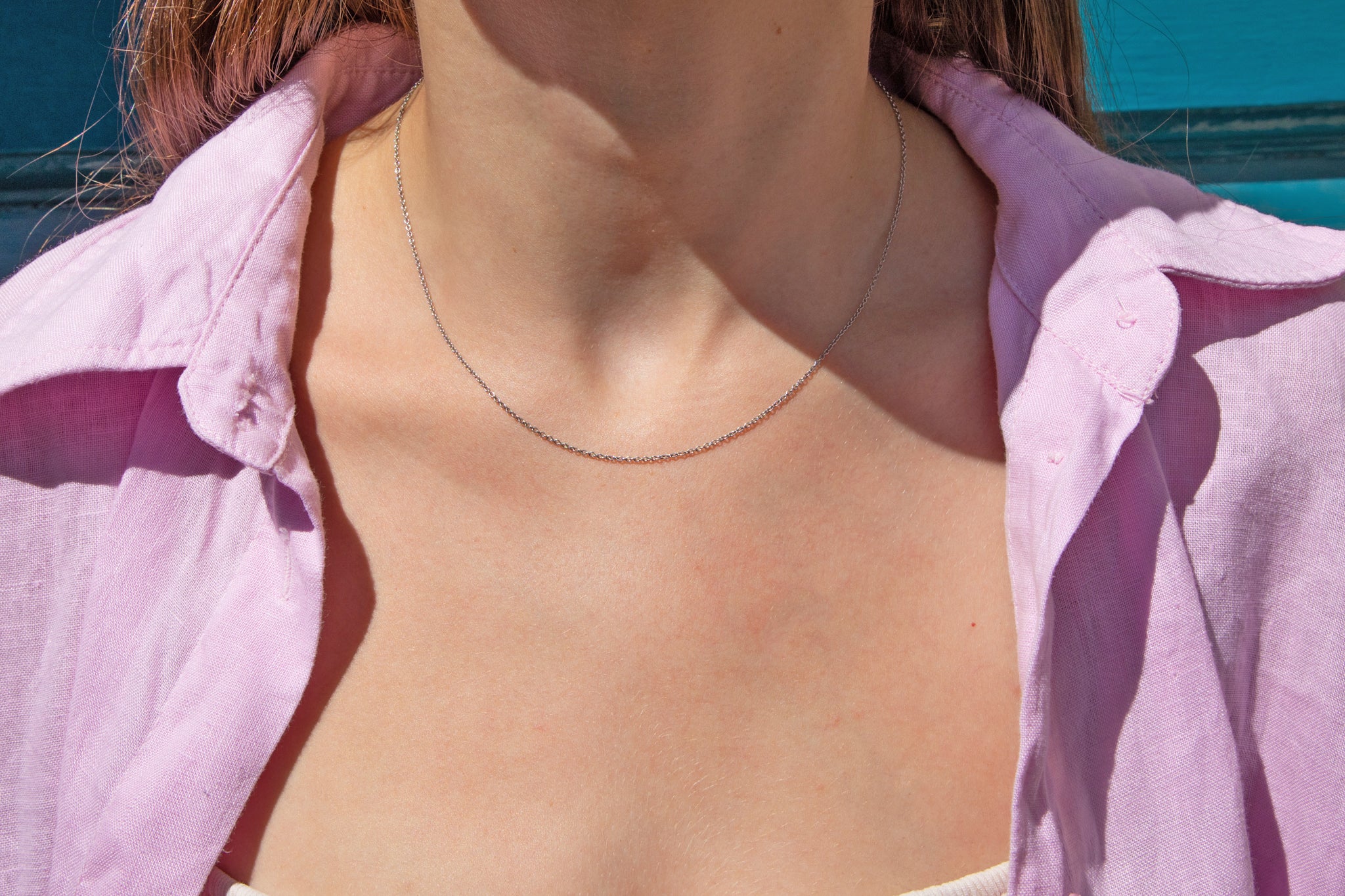A simple 16" Italian 18ct White Gold pendant chain to add to your collection. This skinny trace chain boasts a cool, bright sheen throughout and will easily hold your favourite charms and pendants.