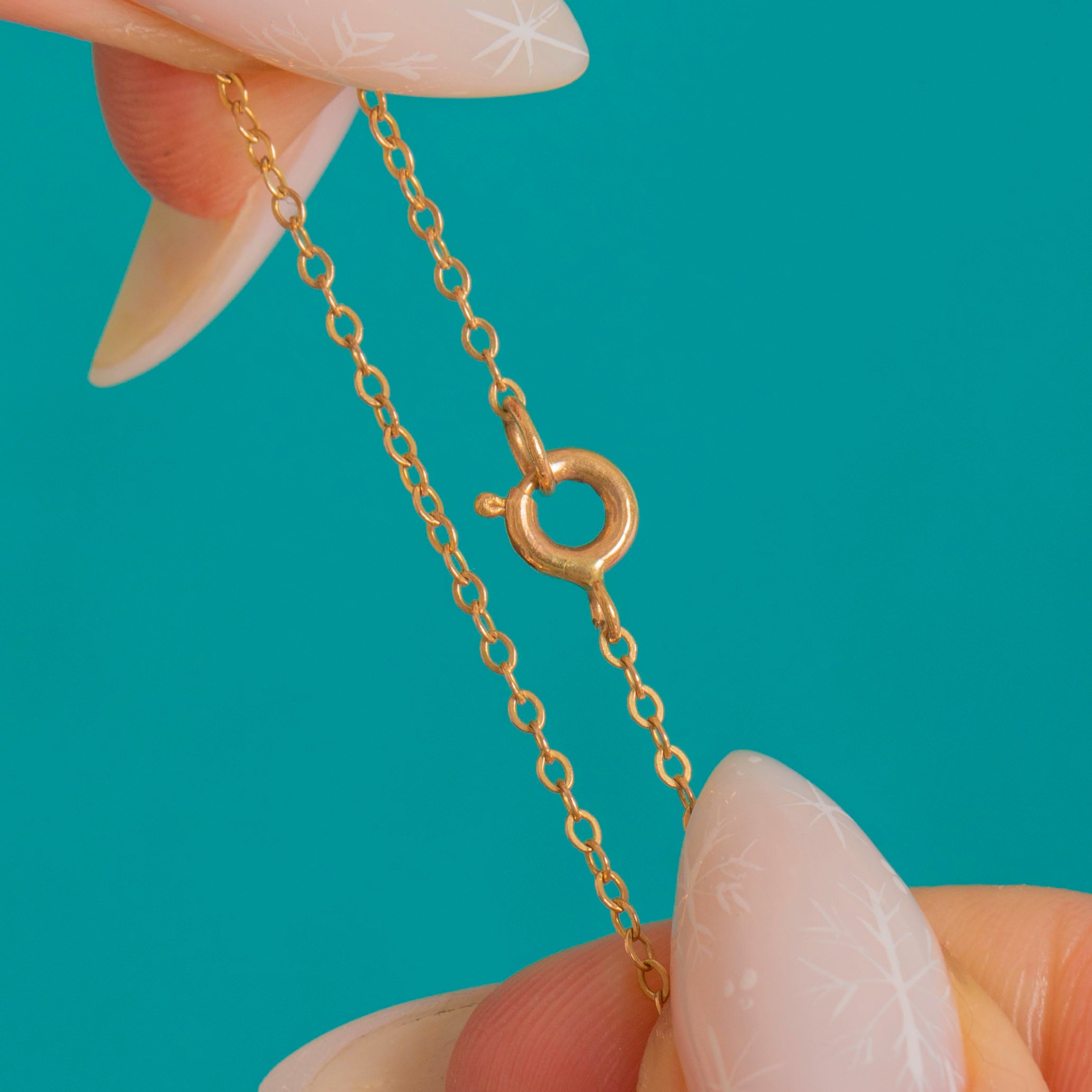 A timeless essential, this Vintage 9ct Gold trace chain is the perfect, delicate finishing touch. Its tiny, uniform oval links have a subtle, light-catching sheen and drape beautifully, giving a refined, minimalist look that layers effortlessly or anchors a favourite pendant. Completed with a classic spring-ring clasp, it’s a chic everyday staple you’ll reach for again and again.