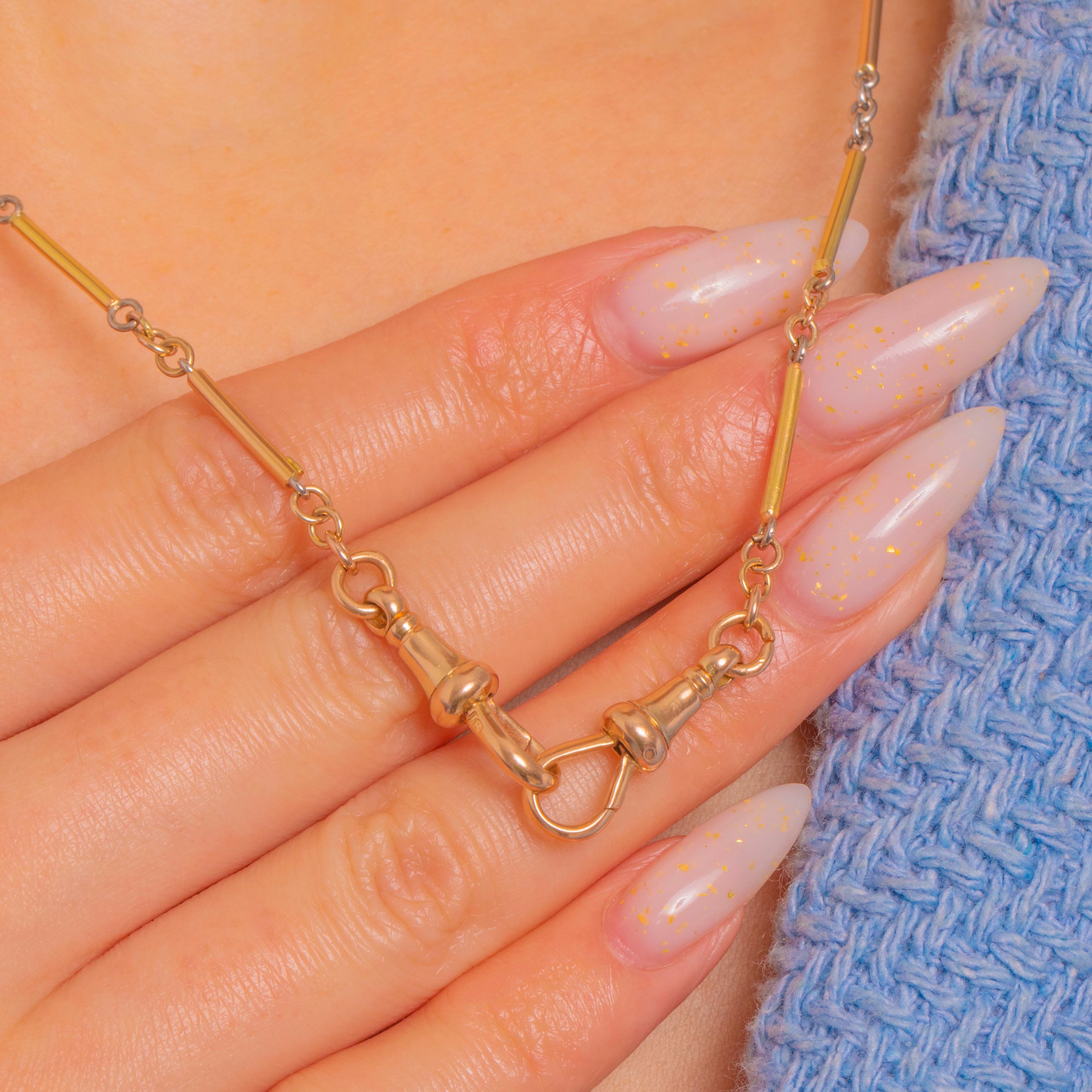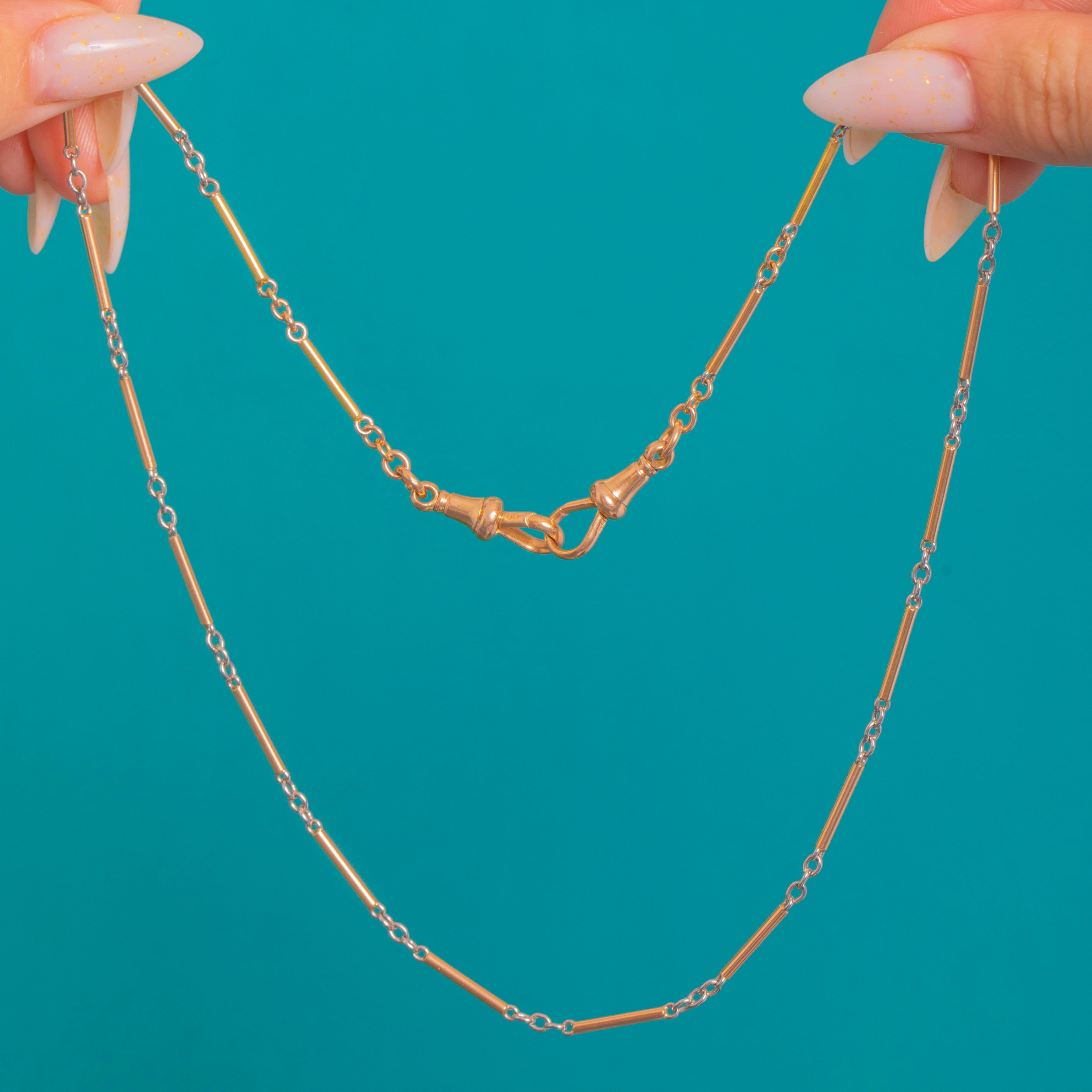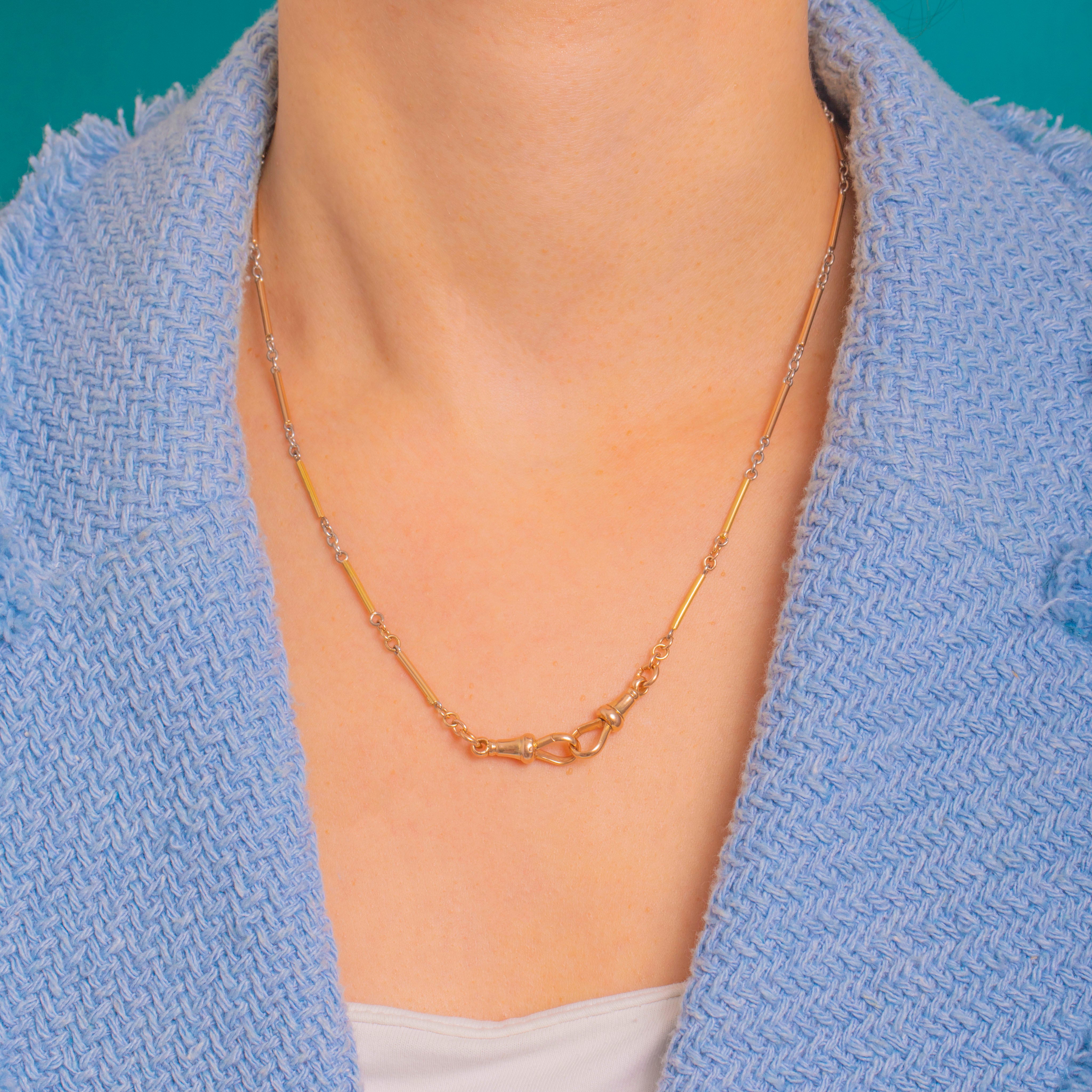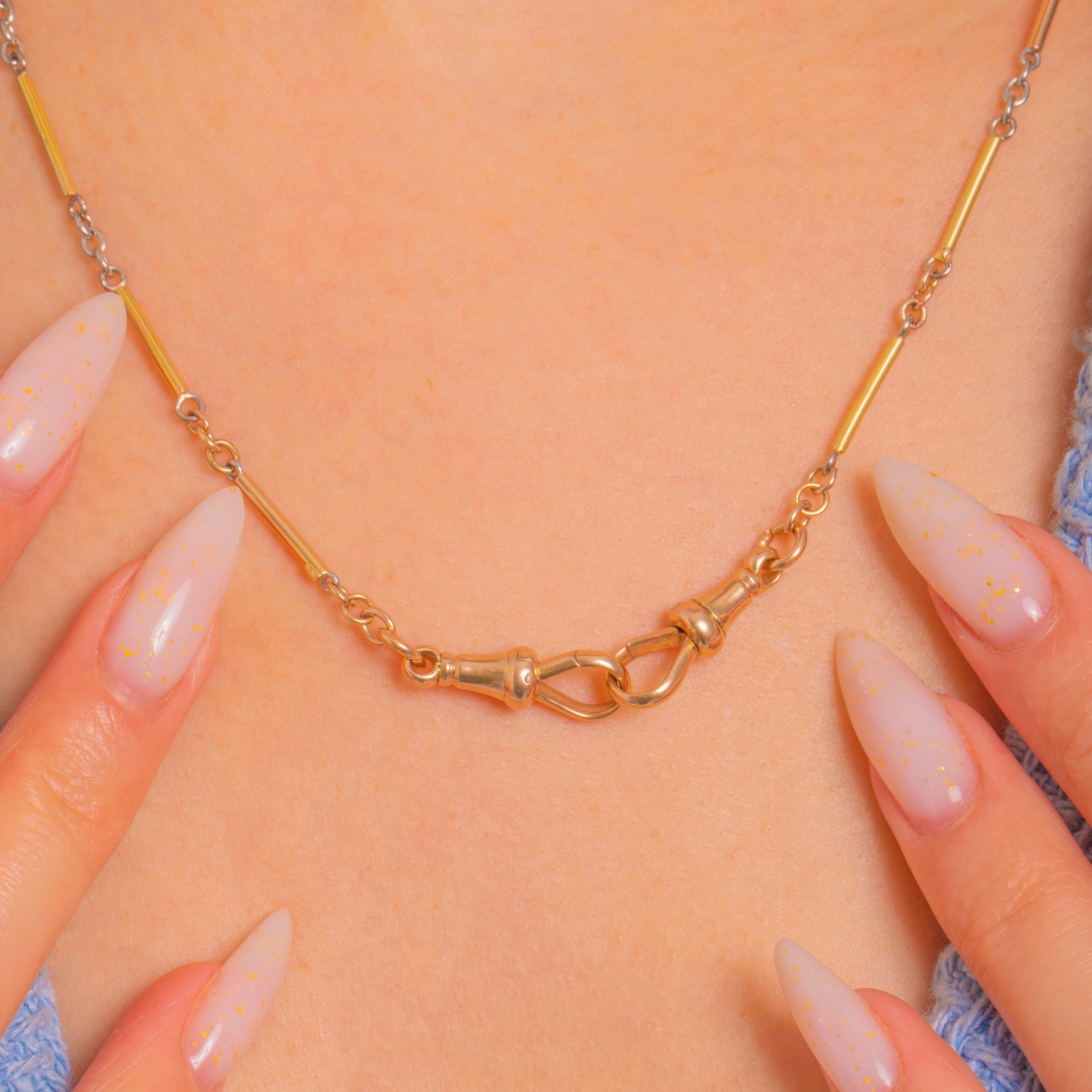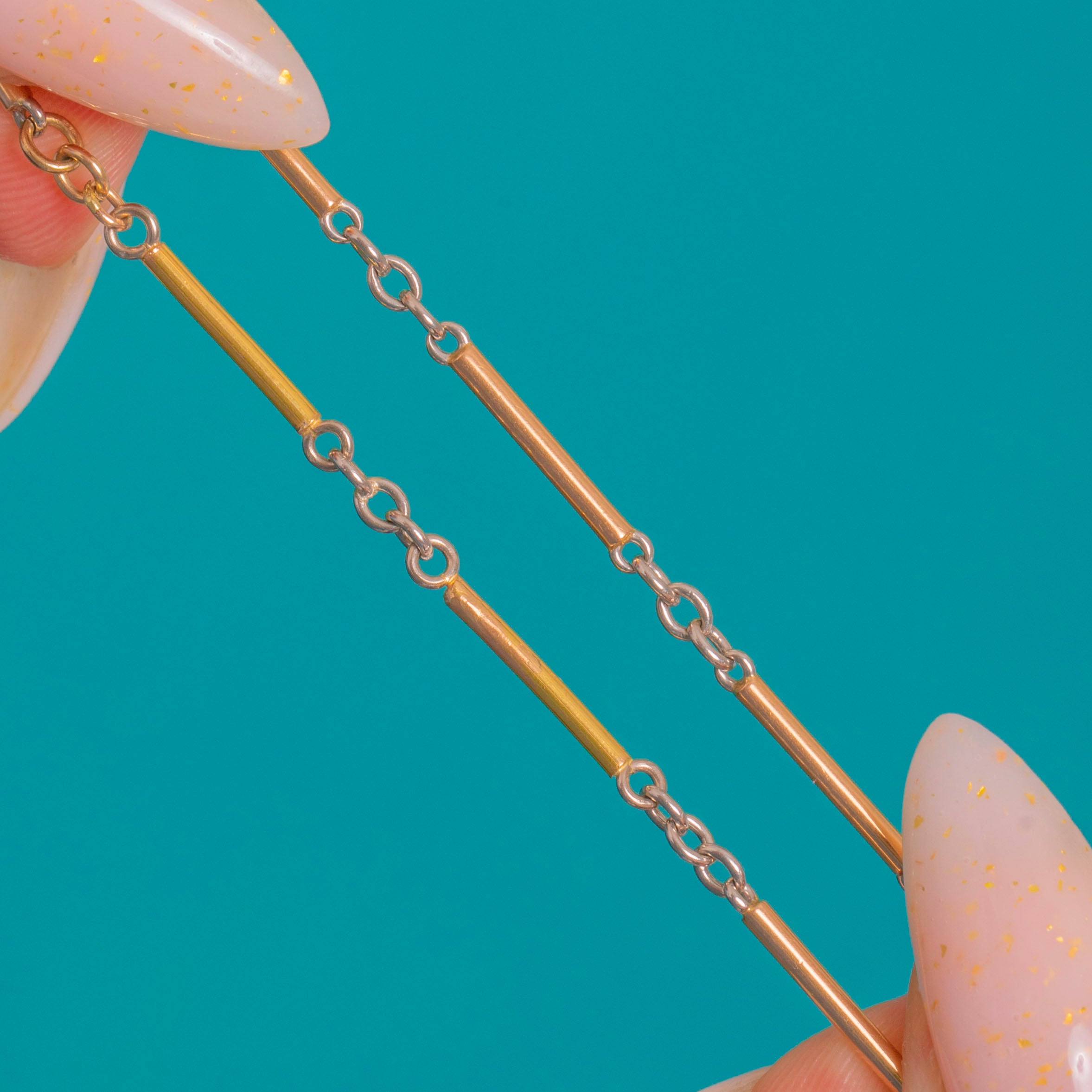 Sleek, elegant, and effortlessly wearable, this Edwardian bar-link chain pairs radiant 18ct Gold with cool Platinum for a refined two-tone finish. Elongated Gold bars are articulated by slim Platinum connectors, creating a graceful rhythm that catches the light with every movement.