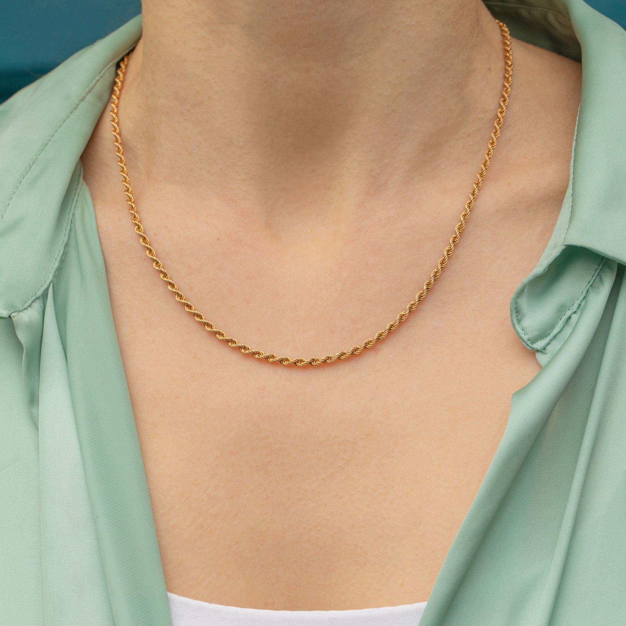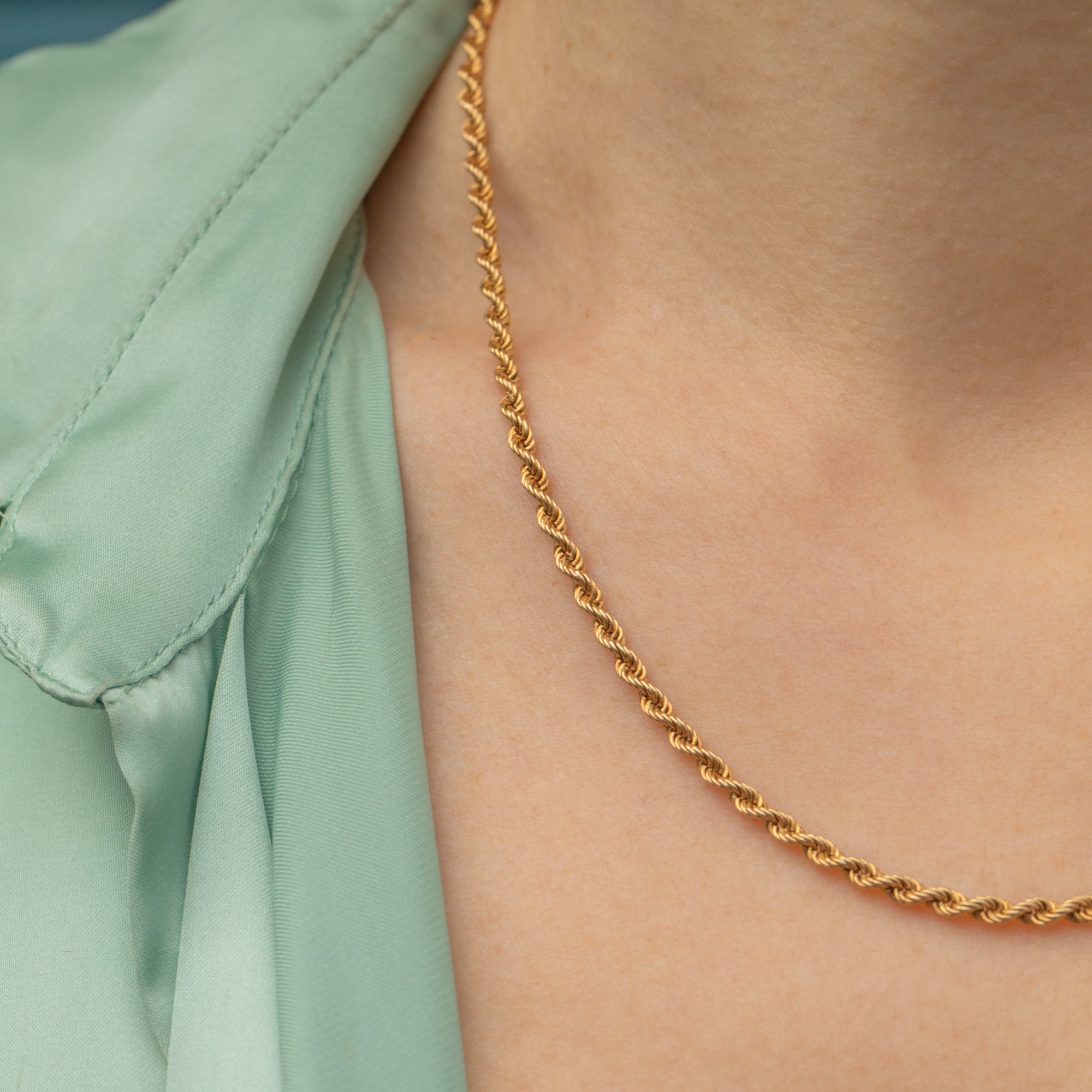 This 17.5" 9ct Gold twisted rope chain is a gorgeous piece that will become your new staple. Crafted from saturated, buttery 9ct Gold, she is a sumptuous delight to adorn your décolletage!