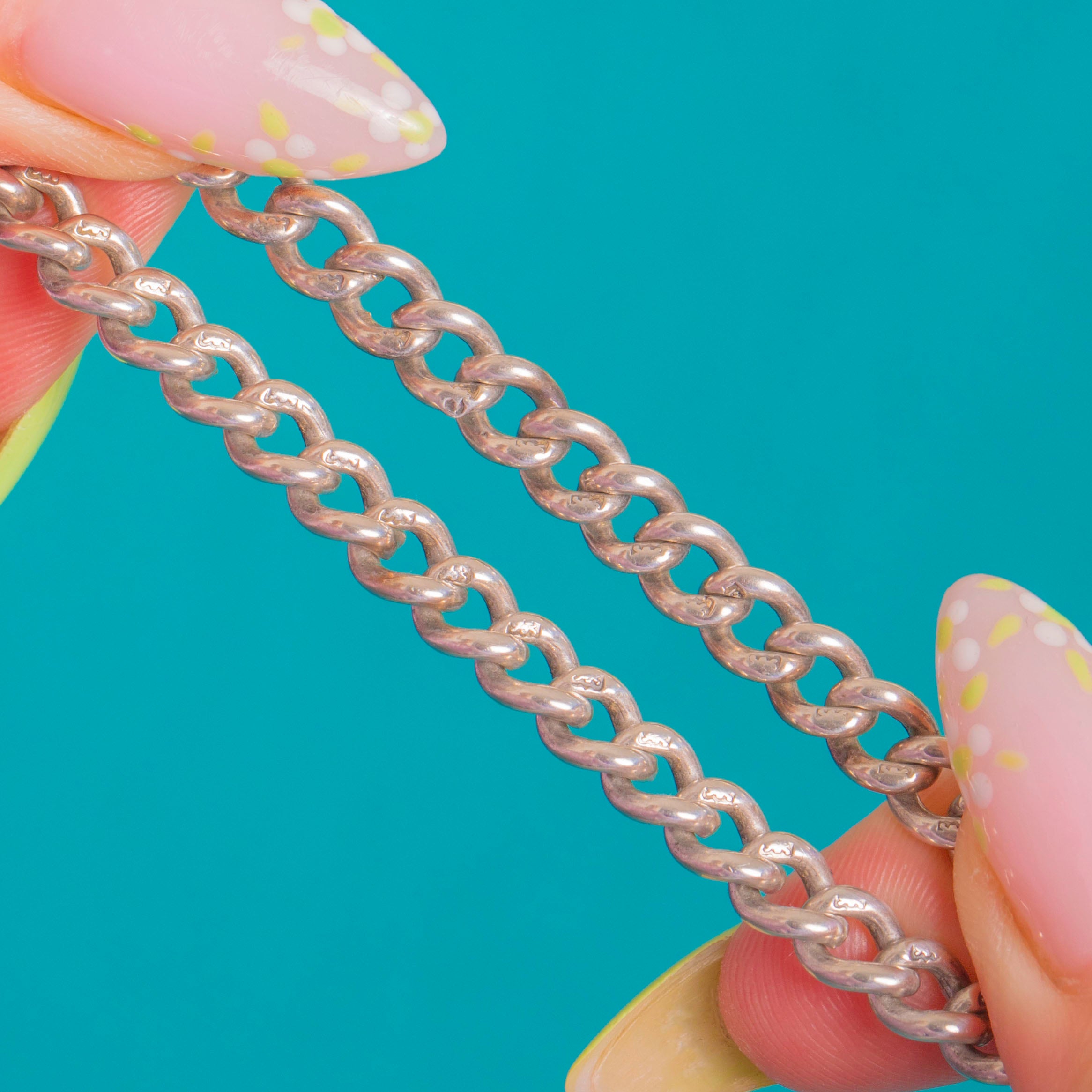 A classic Edwardian Sterling Silver Albert chain with satisfyingly solid curb links and twin dog clip clasps, anchored by a central static jump ring. Its clean, utilitarian lines and beautifully engineered links give it a purposeful elegance that feels as relevant today as it did over a century ago.