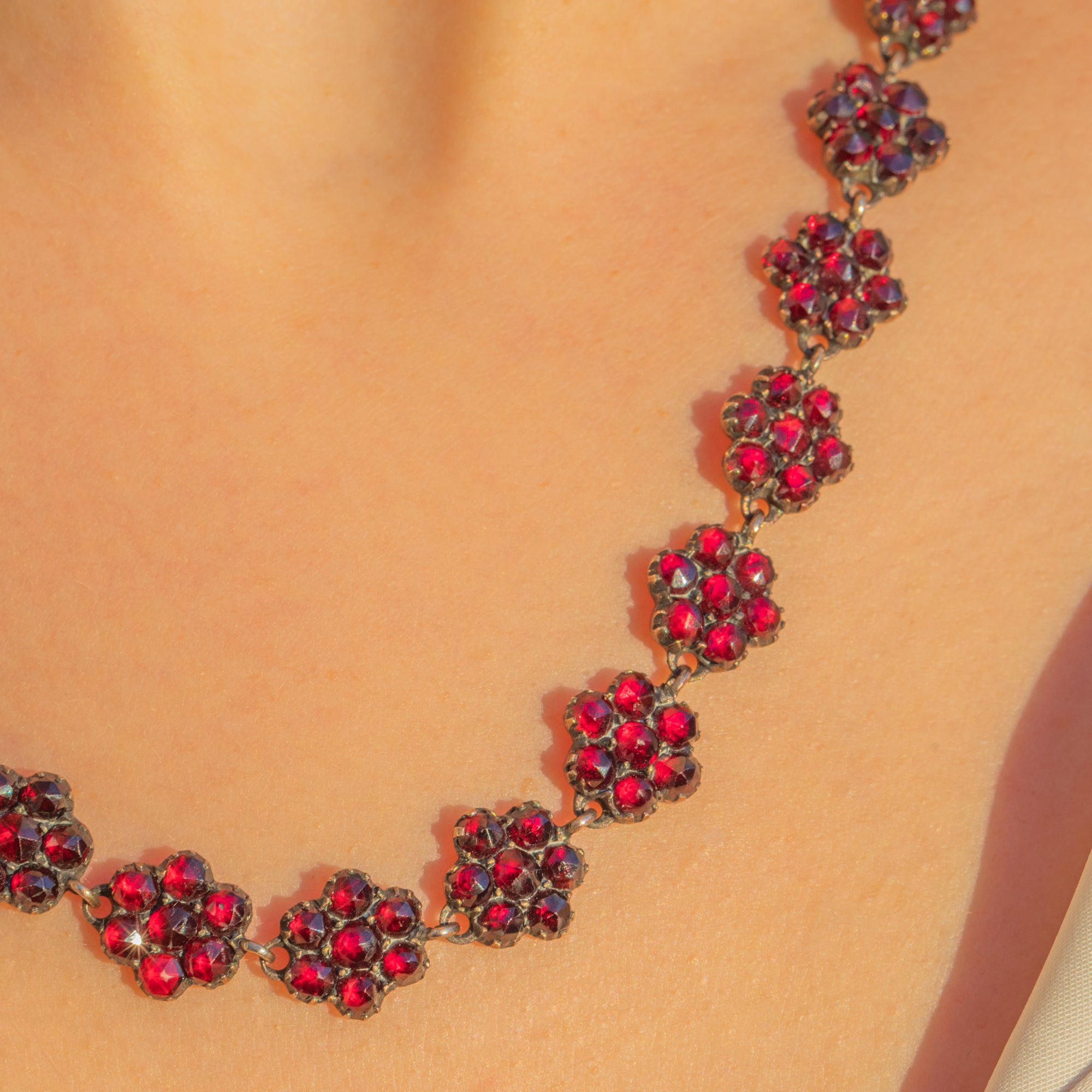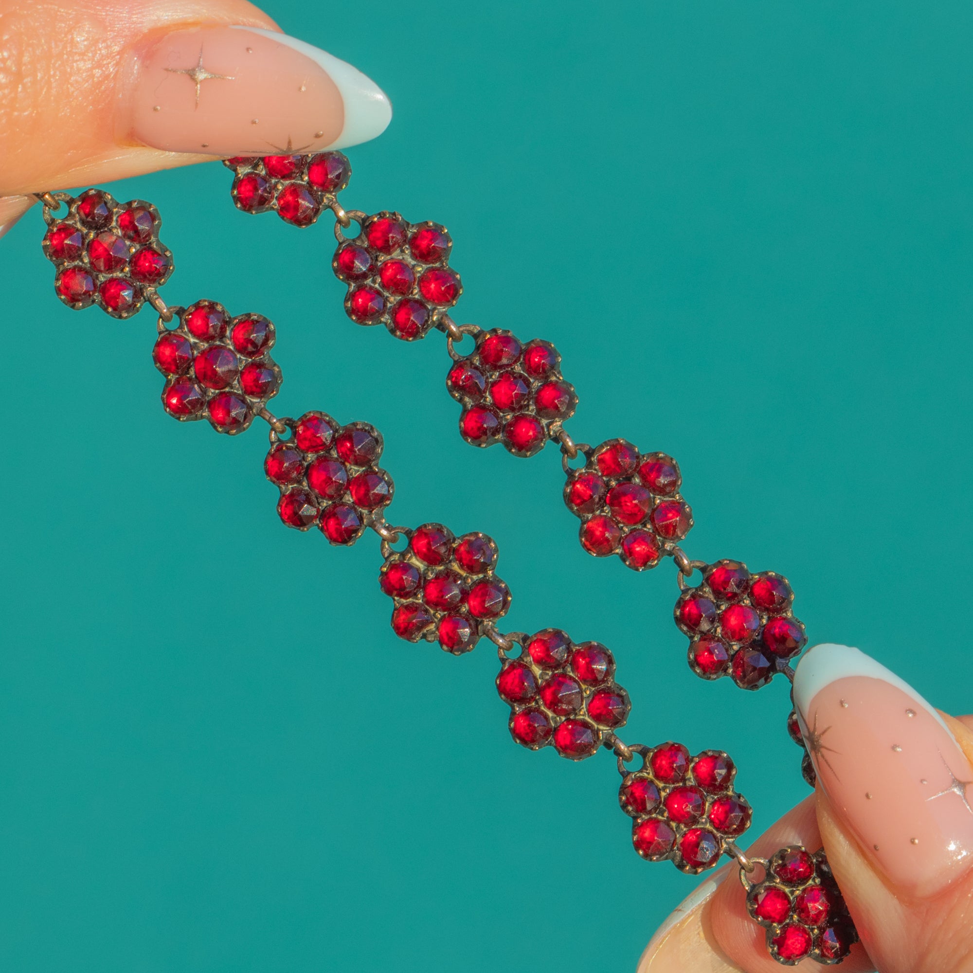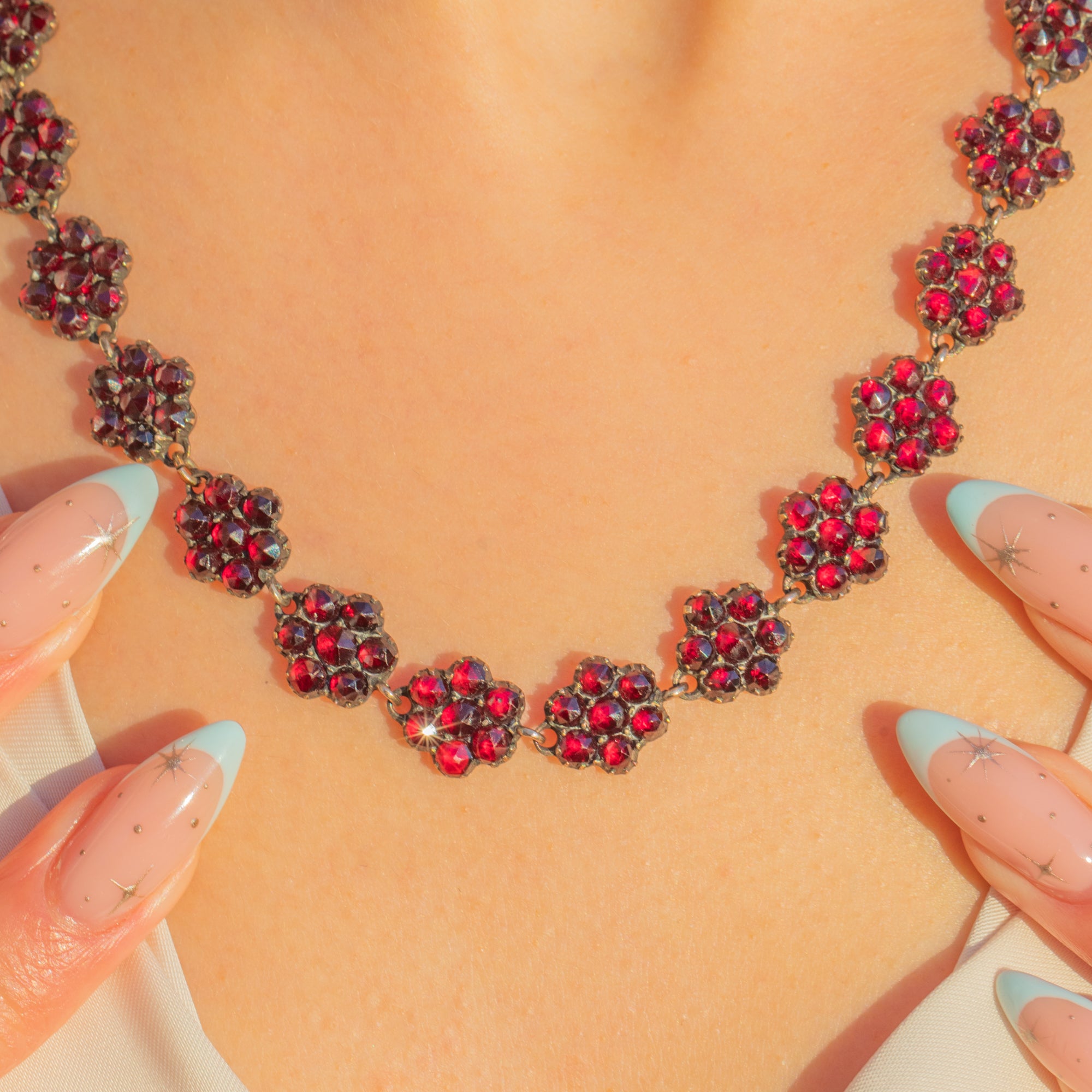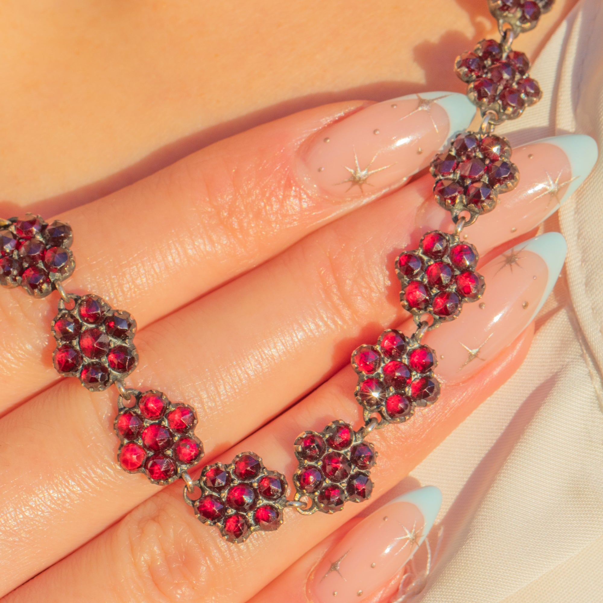 A sumptuous Victorian rivière composed of tightly packed rosette clusters, this necklace glows with deep crimson rose-cut Garnets. Each articulated floral link is domed and gently graduated towards the centre, creating a romantic garland of sparkle that sits beautifully at the collarbone.