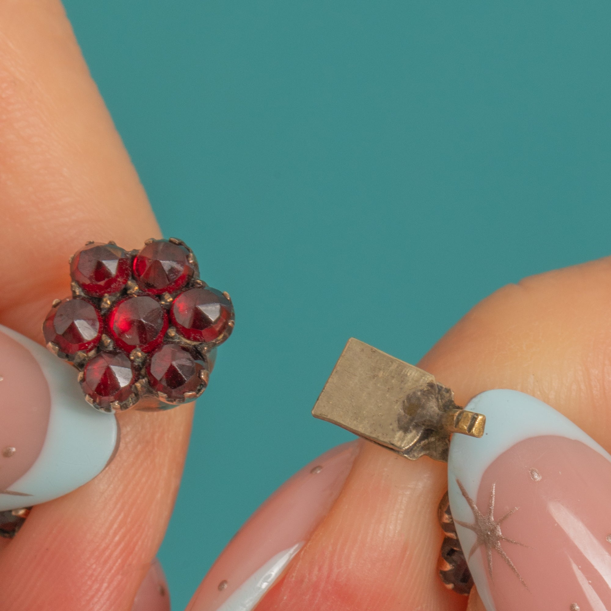 The Garnets are set in closed-back, piecrust settings with an elegant antique patina, the front reading dark and moody while the reverse shows warm Gold tones. Finished with a tongue-and-box clasp topped by a matching rosette and an auxiliary side safety, it’s a classic Victorian jewel with enduring allure.