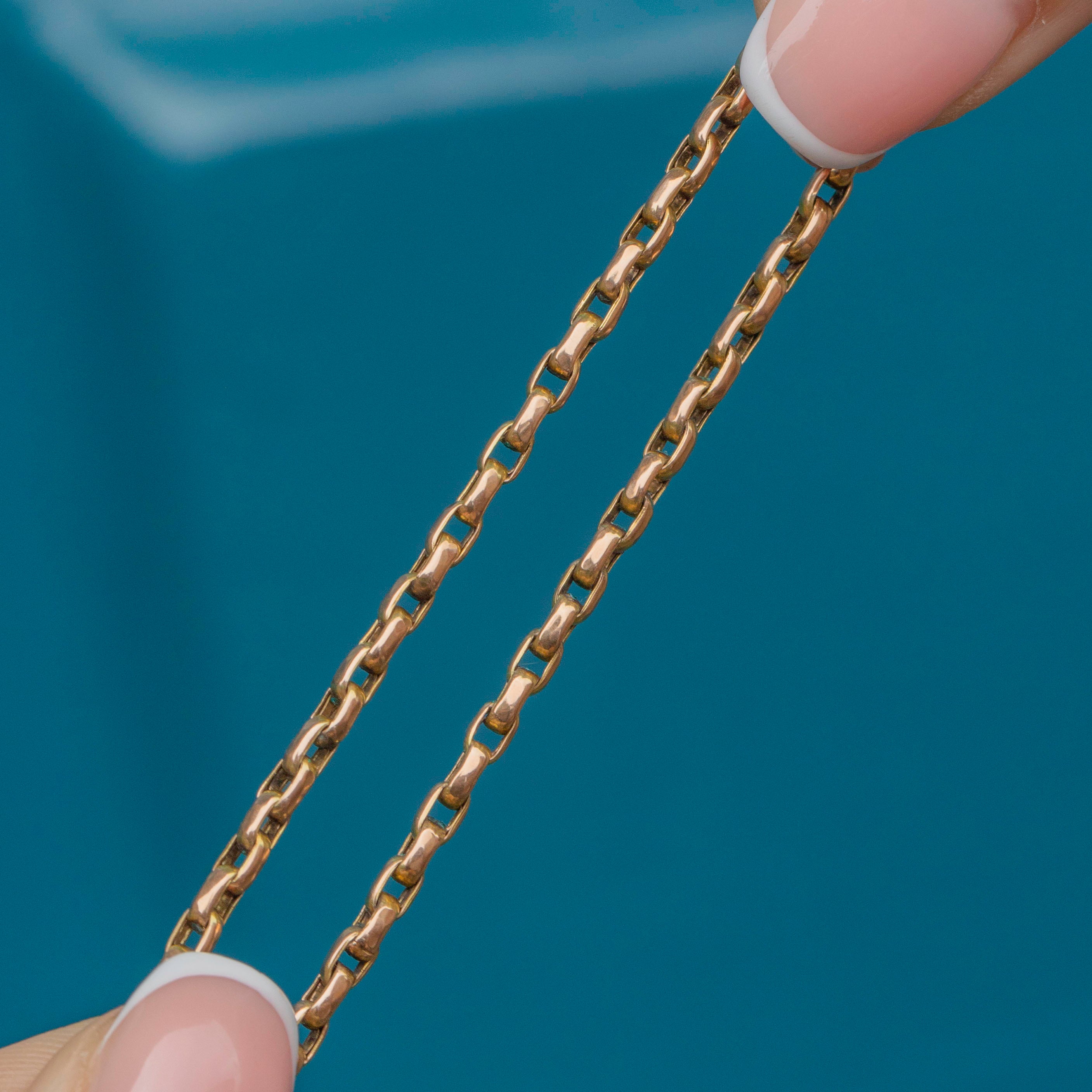 EXCELLENT. This antique 9ct Gold belcher chain is in excellent condition throughout. The Gold is buttery and each link is securely affixed and free from dents or scuffs. The later added bolt ring is in perfect working condition allowing you to wear this sublime Victoria belcher chain with absolute confidence!