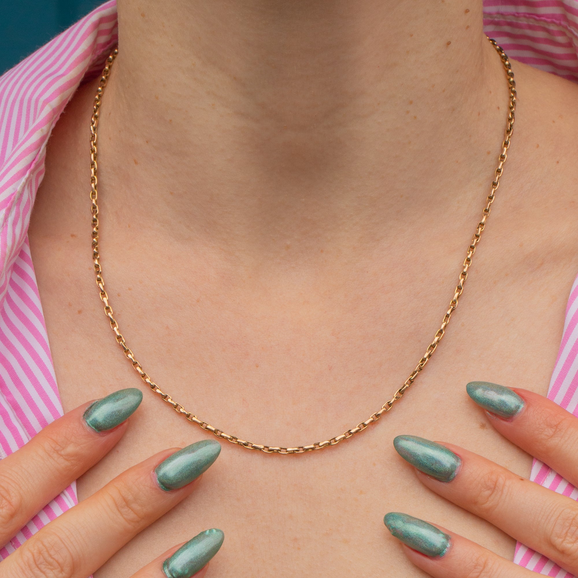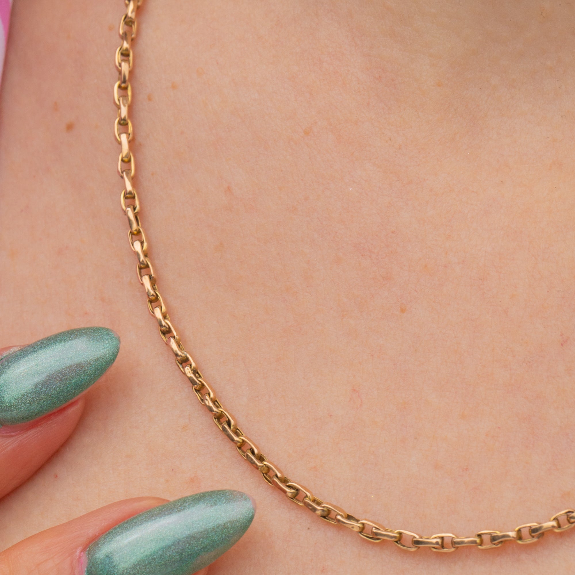 Crafted from solid 9ct Gold, this Victorian chain boasts 17" of elegant rectangular belcher links with softly faceted edges that catch the light beautifully. The 9ct Gold has gracefully aged and accrued a buttery blush finish, complementing both your antique yellow Gold and rosy Gold charms with ease.