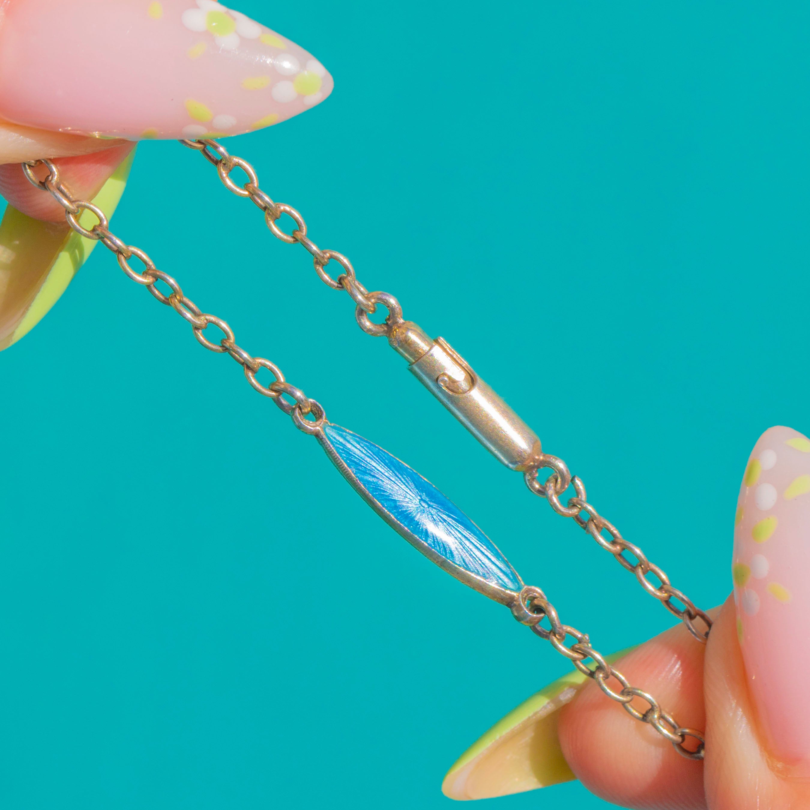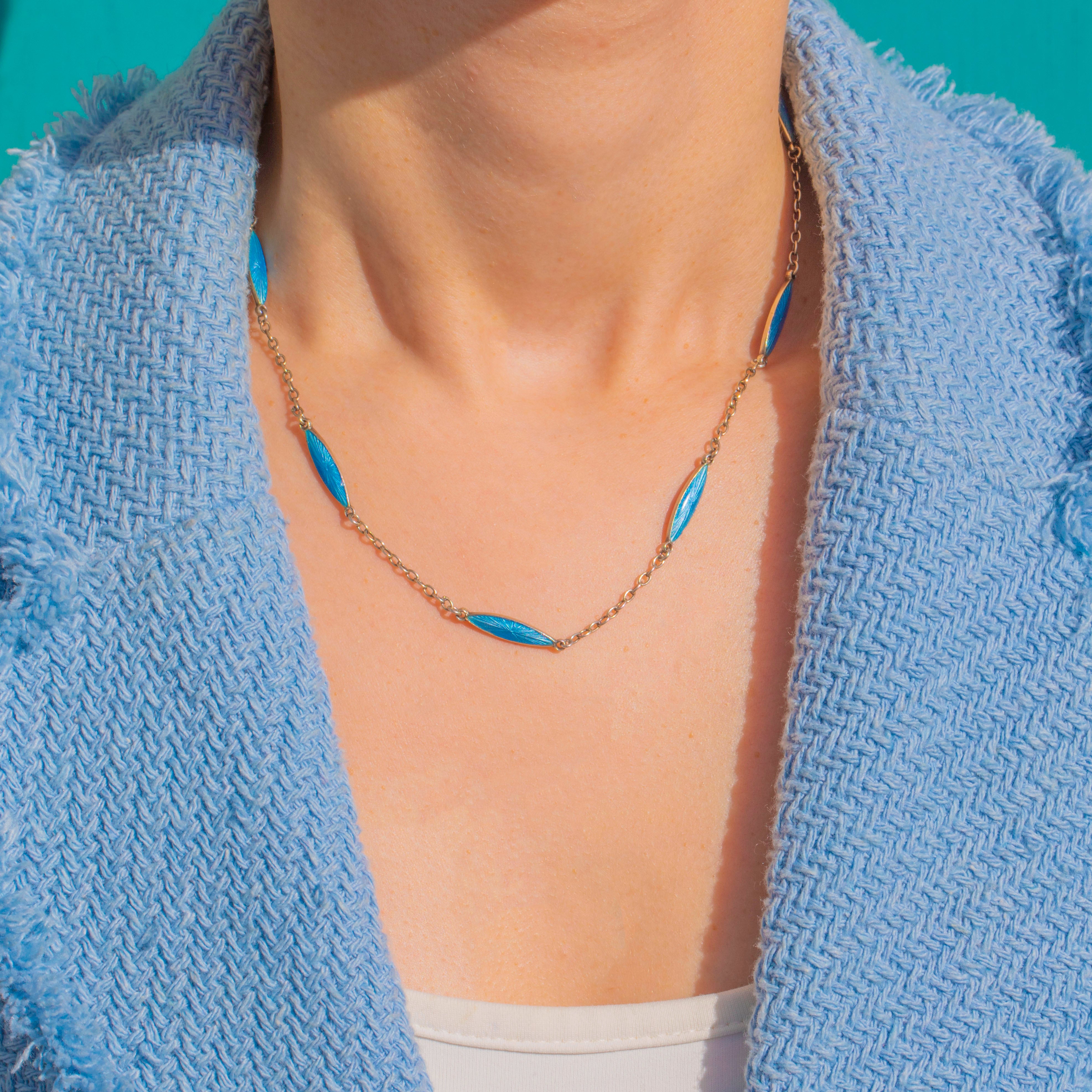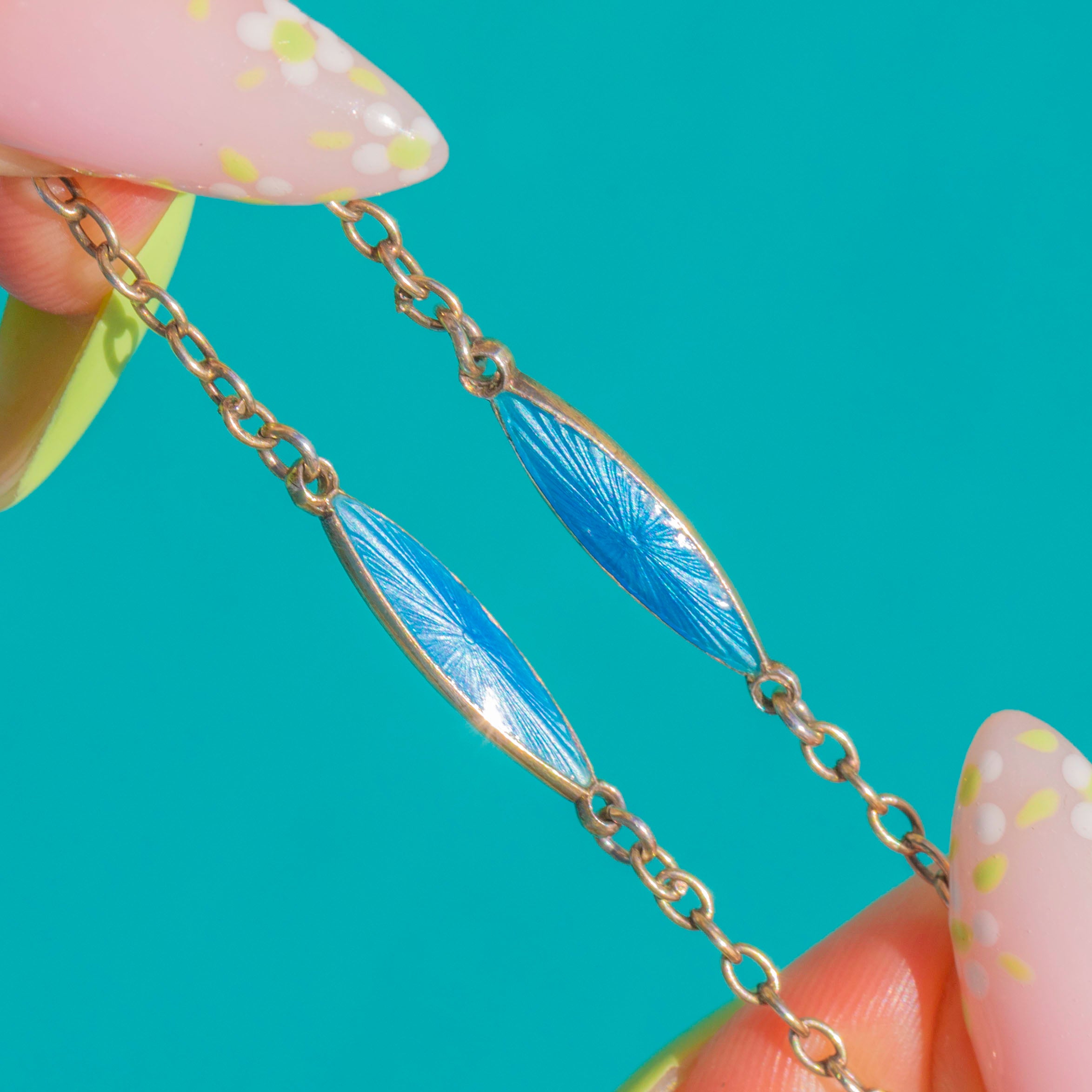 Glowing with that unmistakable Art Deco allure, this Silver chain is set with a sequence of elongated lozenge plaques of translucent blue guilloché Enamel. Each plaque reveals a delicate radiating starburst engine-turned pattern beneath the glassy Enamel, creating a play of light that shimmers with every movement.