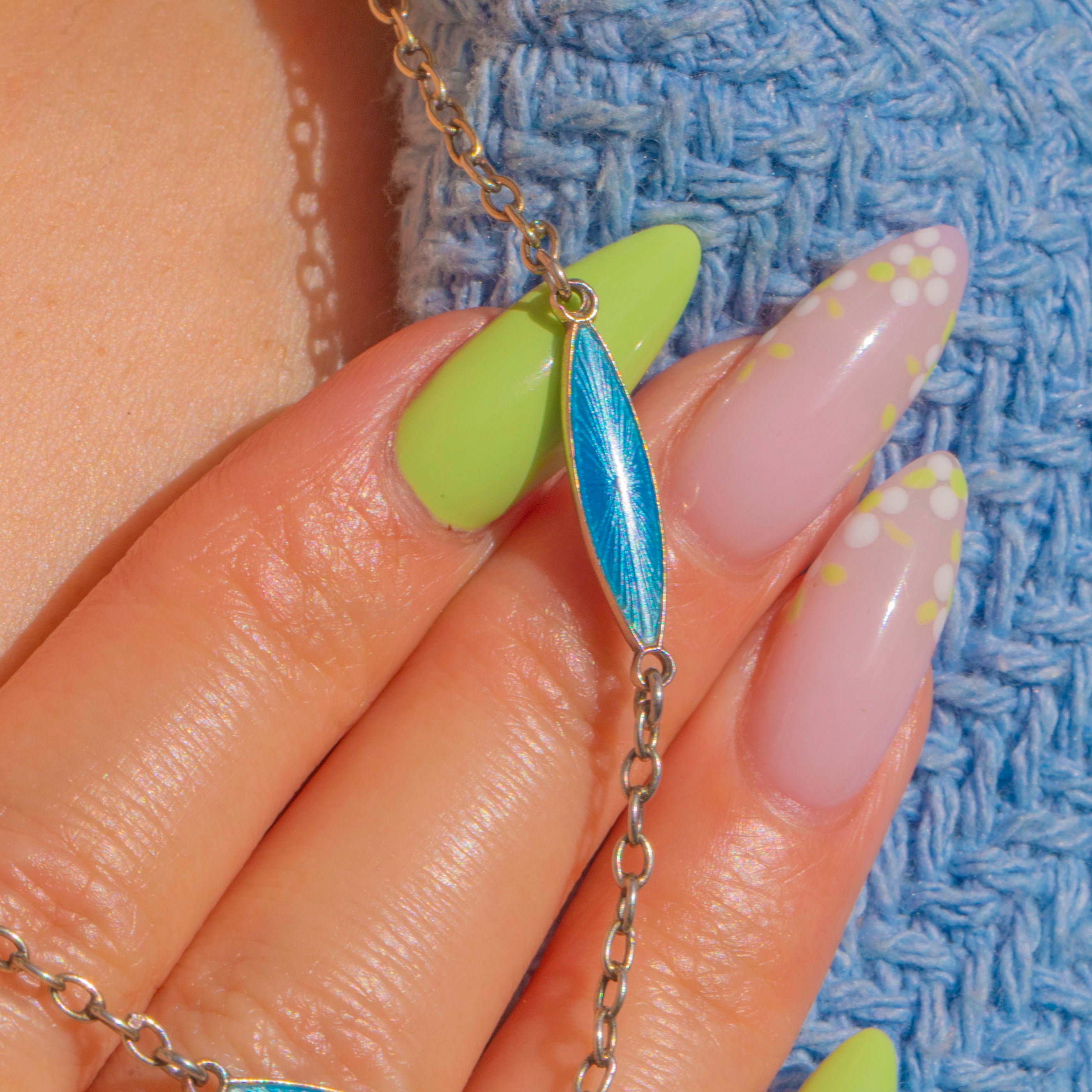The articulated construction and fine links lend beautiful fluidity so it sits elegantly at the collarbone, while the repeating navette silhouettes offer a refined, graphic rhythm. A classic barrel clasp completes the look—equally chic worn solo or layered for a pop of luminous colour.