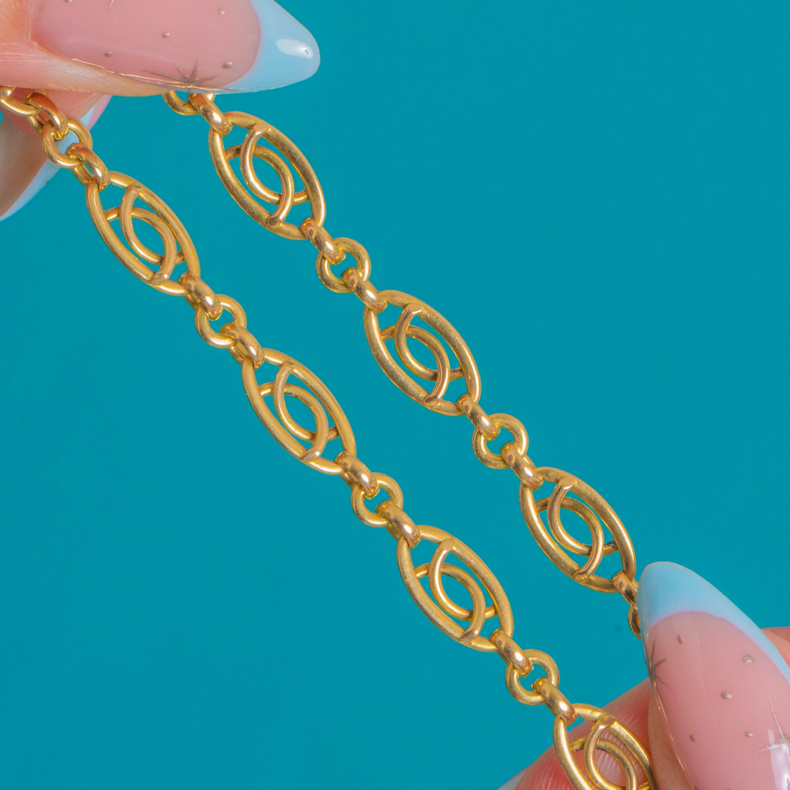 A beautiful Late Victorian fancy-link chain, crafted in rich 18ct Gold with an elegant French sensibility. Each openwork navette link is adorned with delicate soldered S-scrolls, joined by petite jump rings for a refined, articulate drape. The warm, bright glow of the Gold flatters the intricate wire-formed design, offering texture and movement in every link.