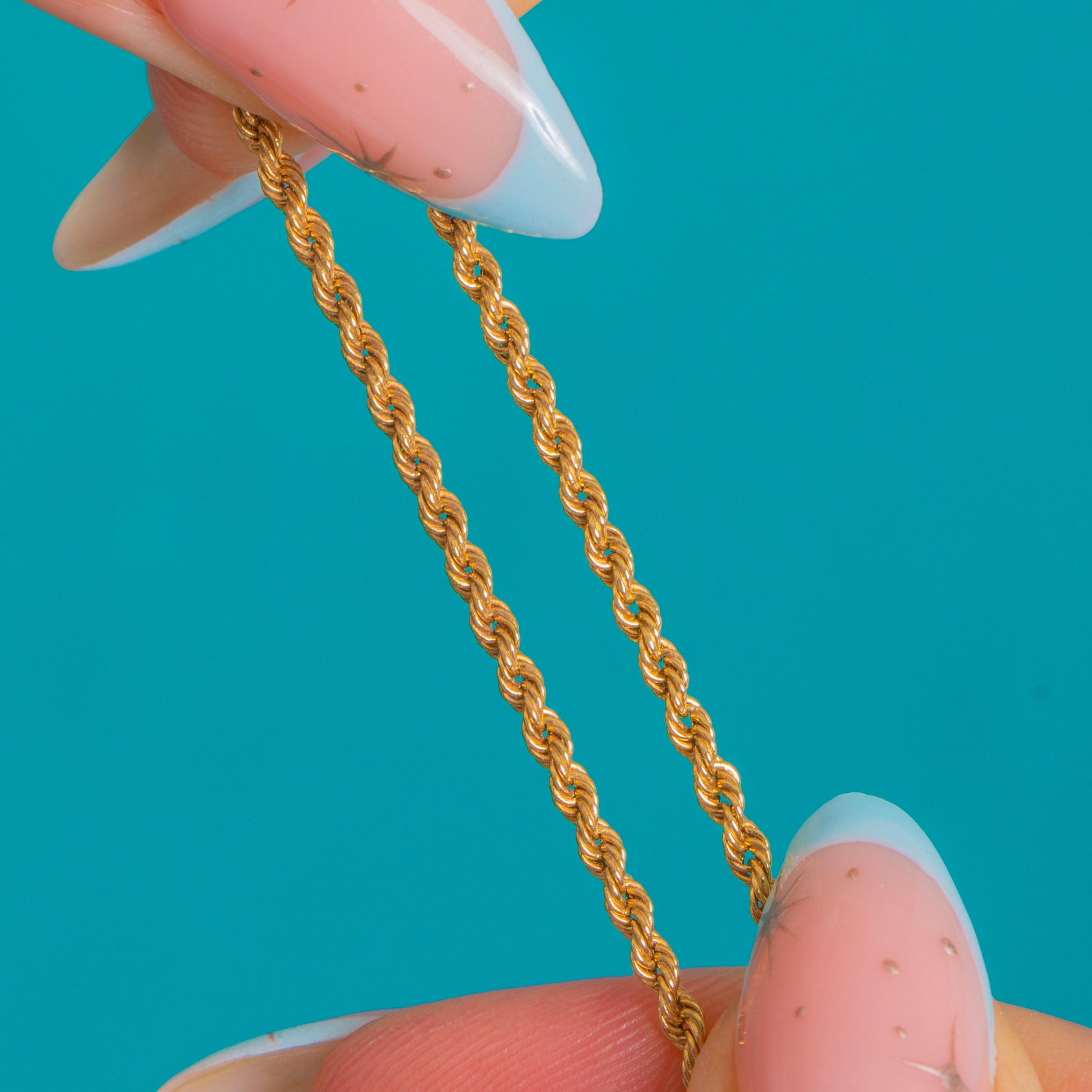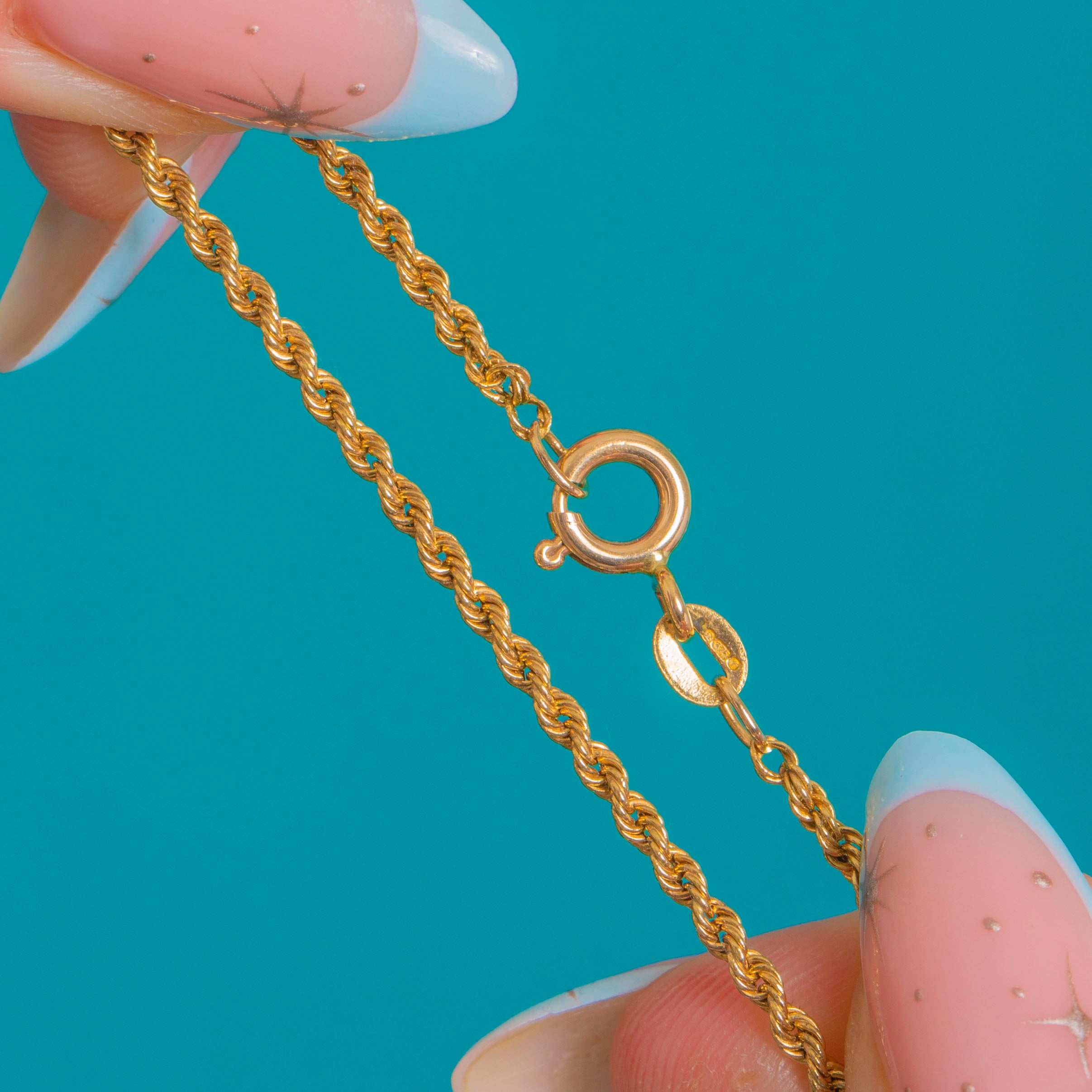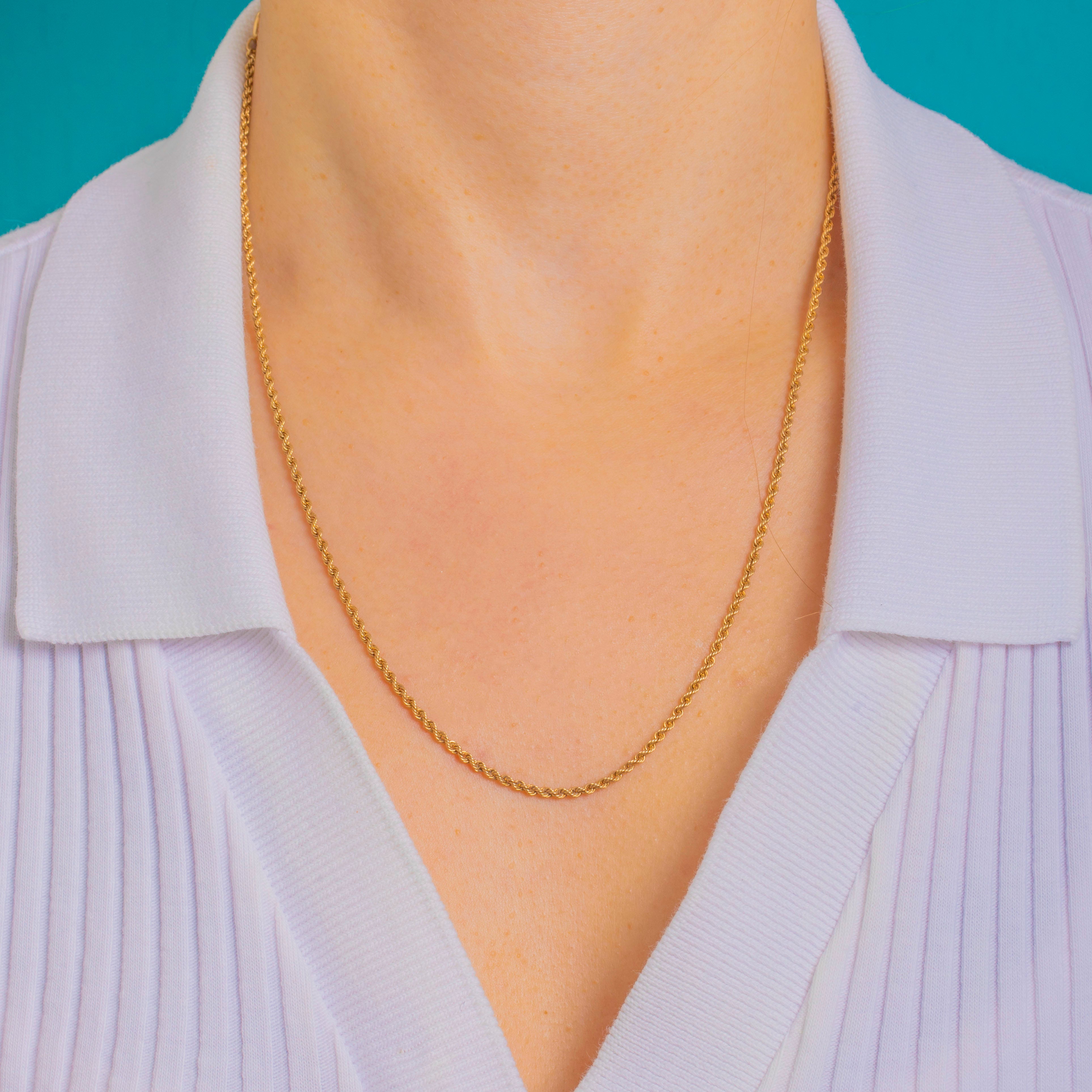 A timeless staple, this Vintage rope chain is crafted in 9ct Gold and finished with that beautifully warm glow that only solid Gold can give. The twisted rope links catch the light with every movement, making it just as perfect worn solo as it is layered with your favourite charms and pendants.