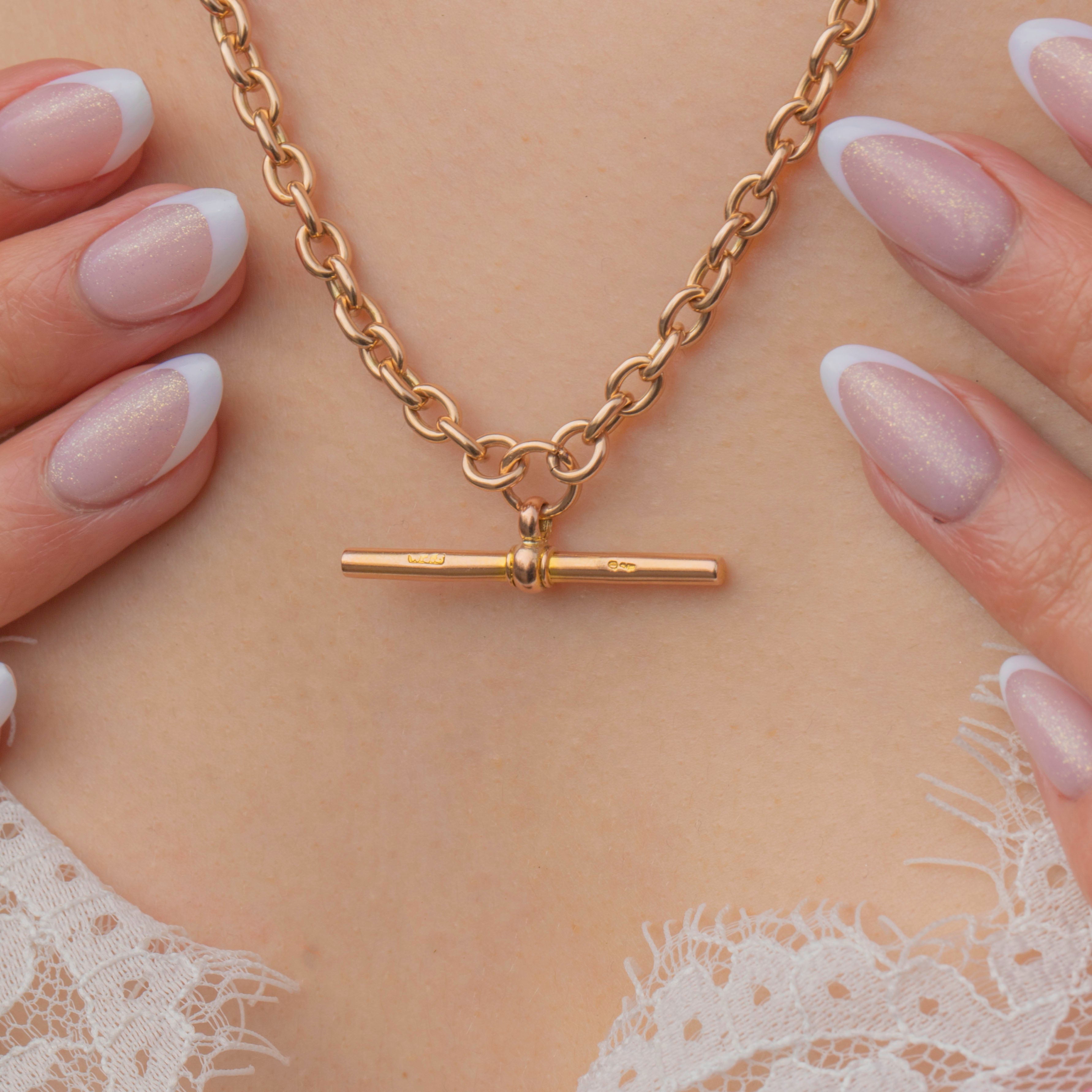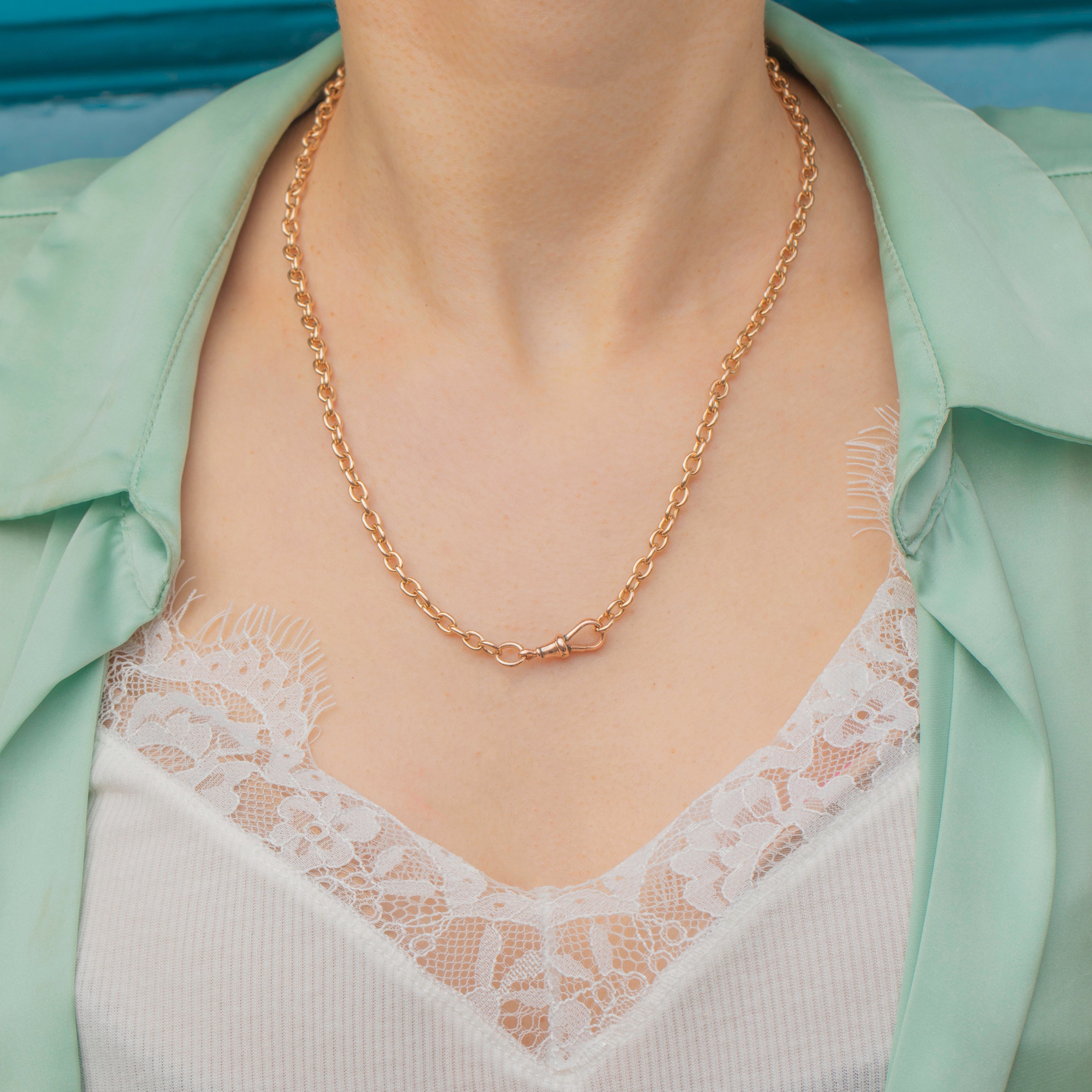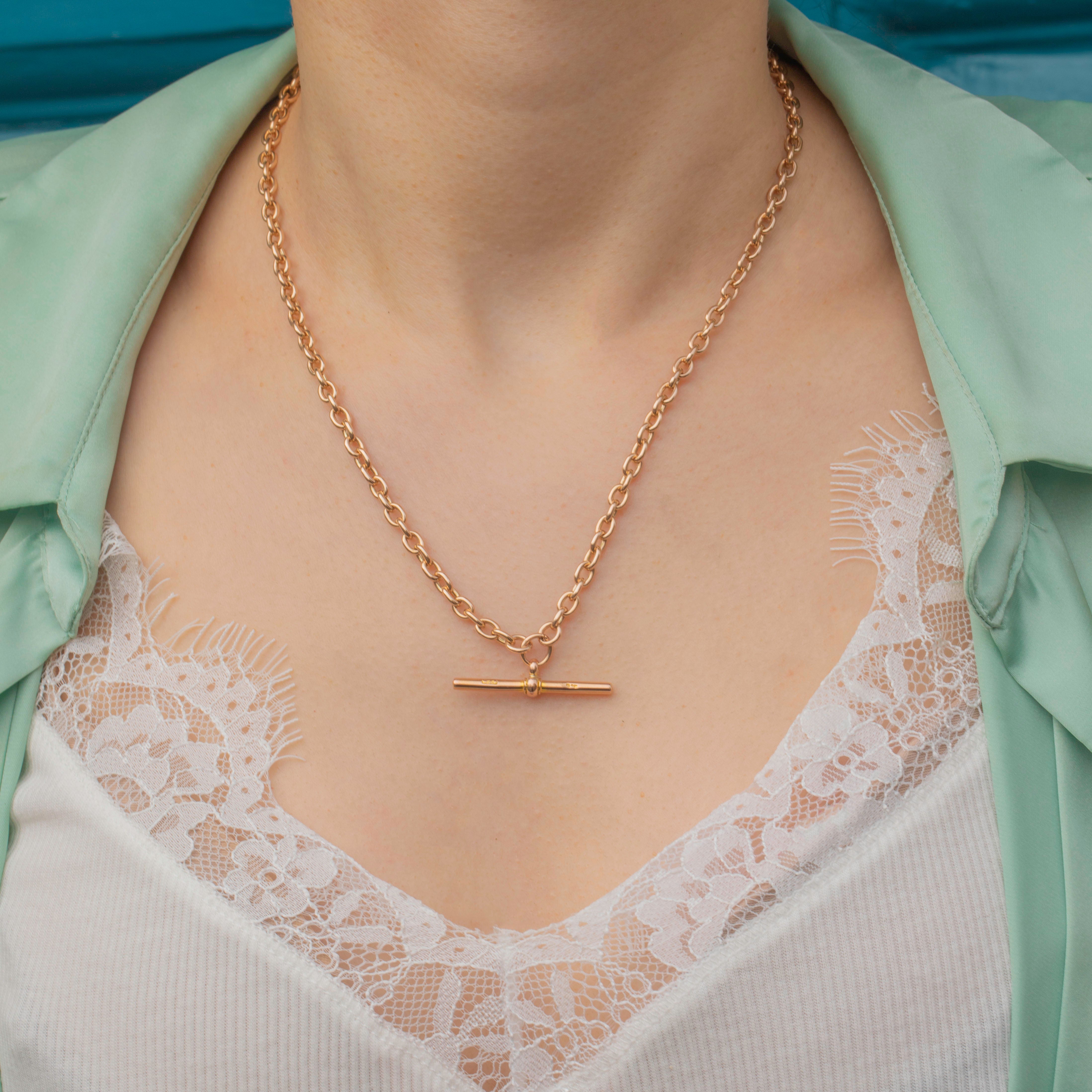 This antique Gold necklace is a versatile piece that your jewellery wardrobe needs. You will just find yourself wanting to wear her every day! The T-Bar and dog clip add another touch of antique excellence and prestige.