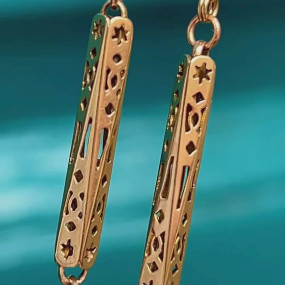 This antique 9ct Gold pierced star link chain is simply divine! Featuring uniquely formed links pierced with stars and geometric patterns flanked by lengths of smooth belcher links, the buttery hues of this Gold chain glint spectacularly under sunlight.