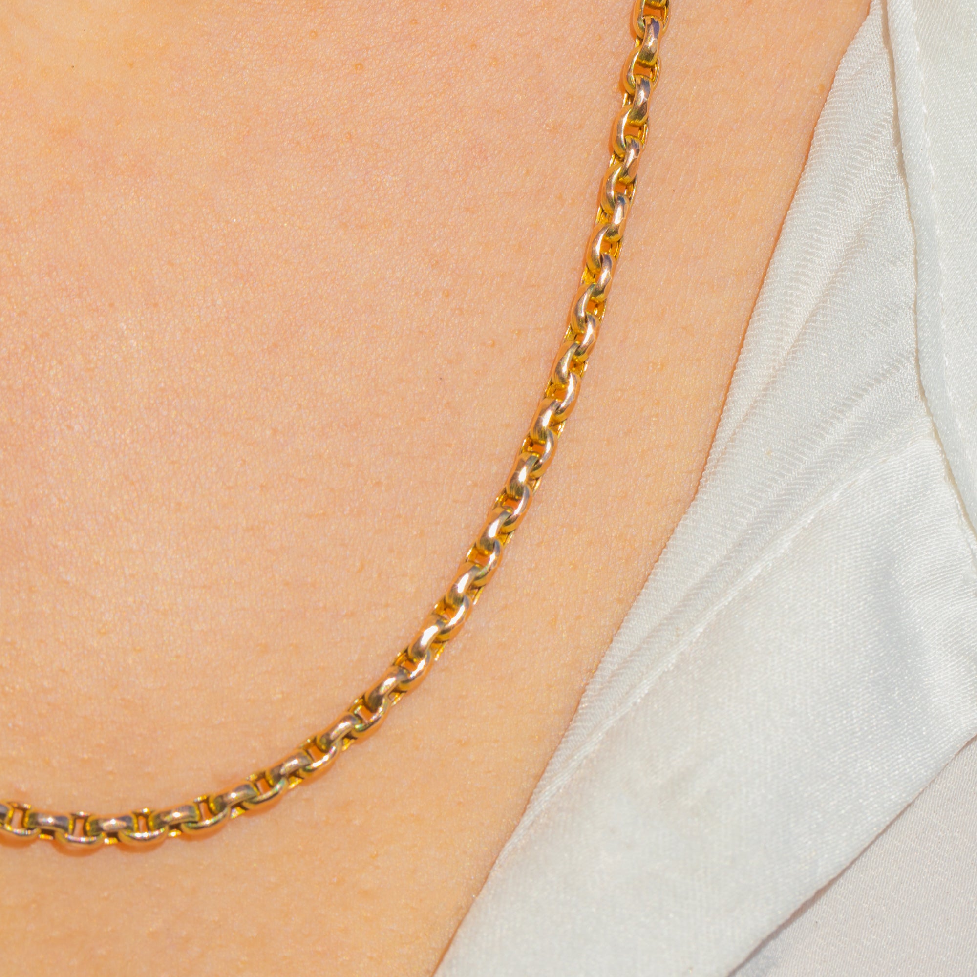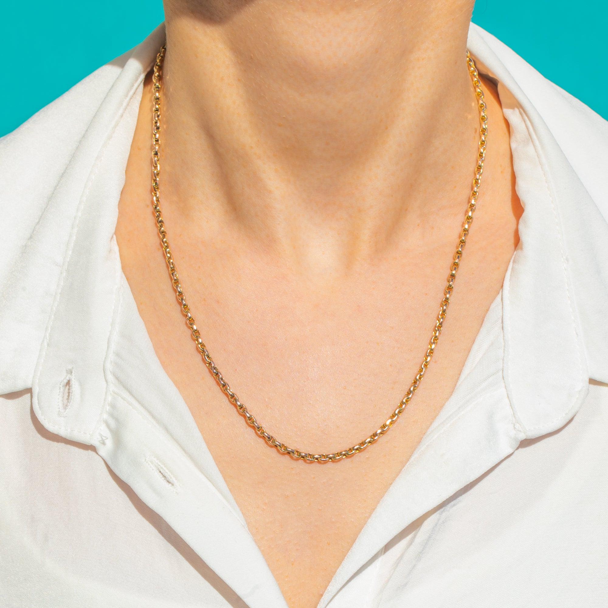 Sleek, timeless and beautifully versatile, this antique Victorian Belcher chain is crafted in glowing 9ct Gold. Its slim, uniform links flow effortlessly around the neckline, offering that perfect hint of shimmer that elevates every look from day to night.